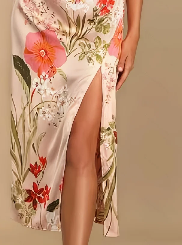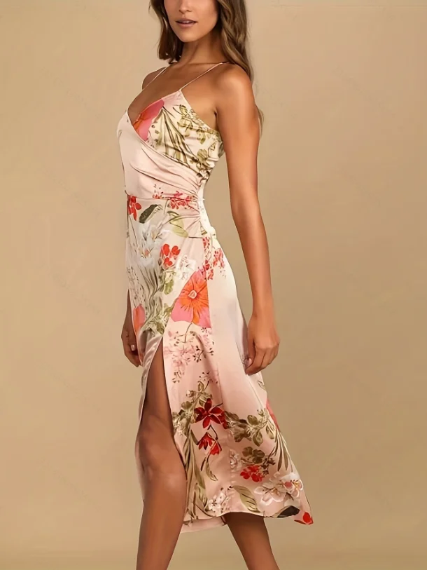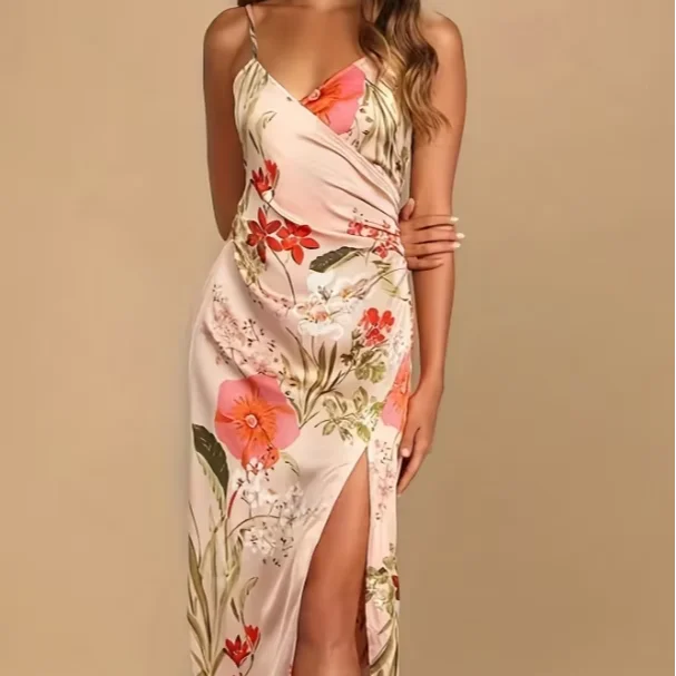 Floral Print V-Neck Backless Maxi Dress for Women Elegant Long Beach Dress with High Slit