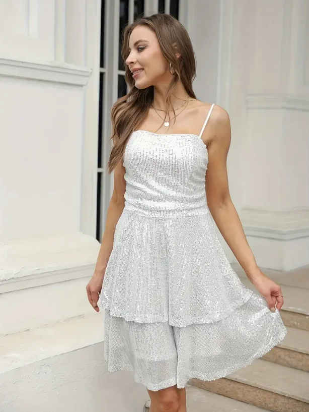 Fashion Women's Casual Style Solid Sexy White Dress Breathable Knee-Length A-Line Sequined Natural
