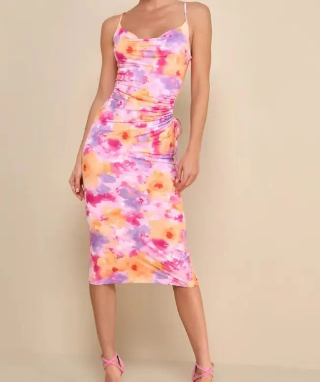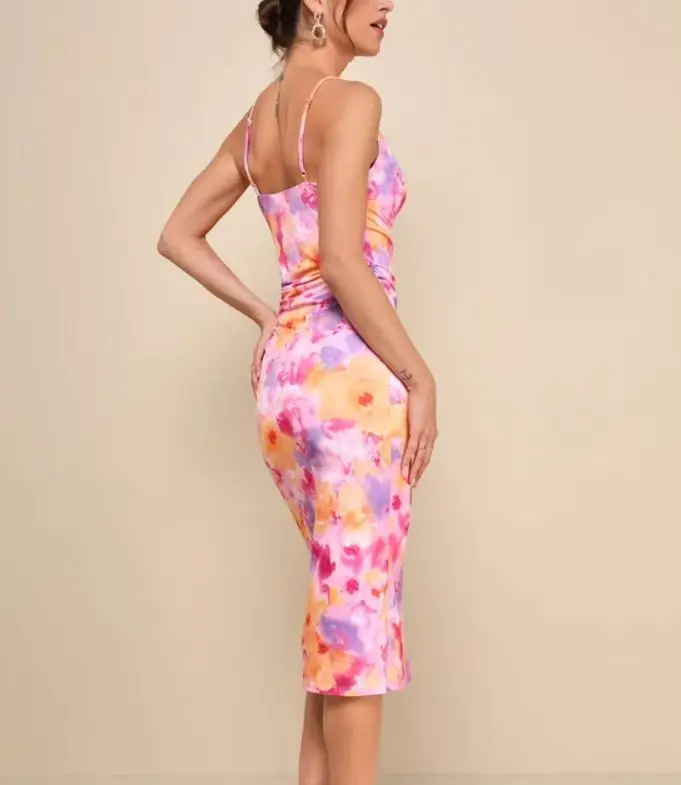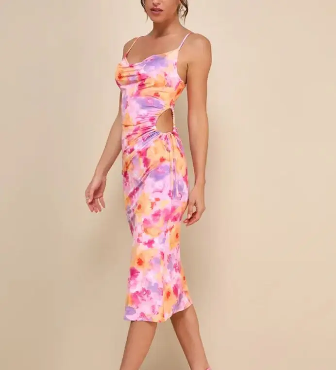 Women's Elegant Pink Floral Midi Evening Dresses ODM Cute Waist Cutout Sleeveless Slim Casual Design