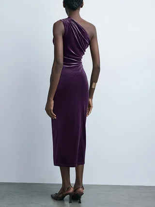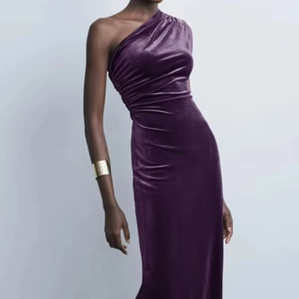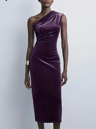 ZYHT 73849 European Wholesale Fashion Casual One Shoulder Ruched Maxi Dress Side Slit Pleated Long Sleeve Dresses for Women