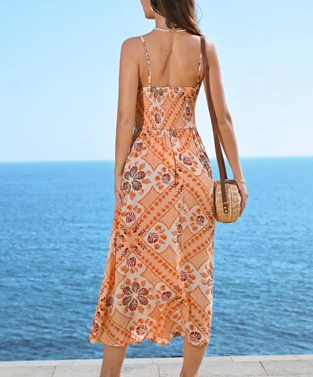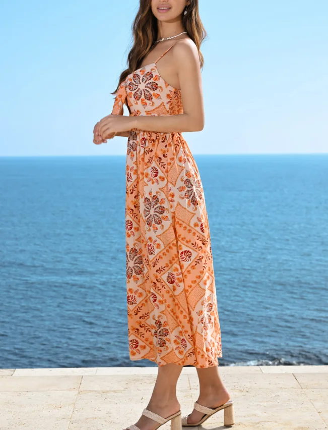 2023 Custom Brand New Lady Bohemian Sleeveless Stitching Print Maxi Elegant Party Midi Beach Washable Women's Dress Empire