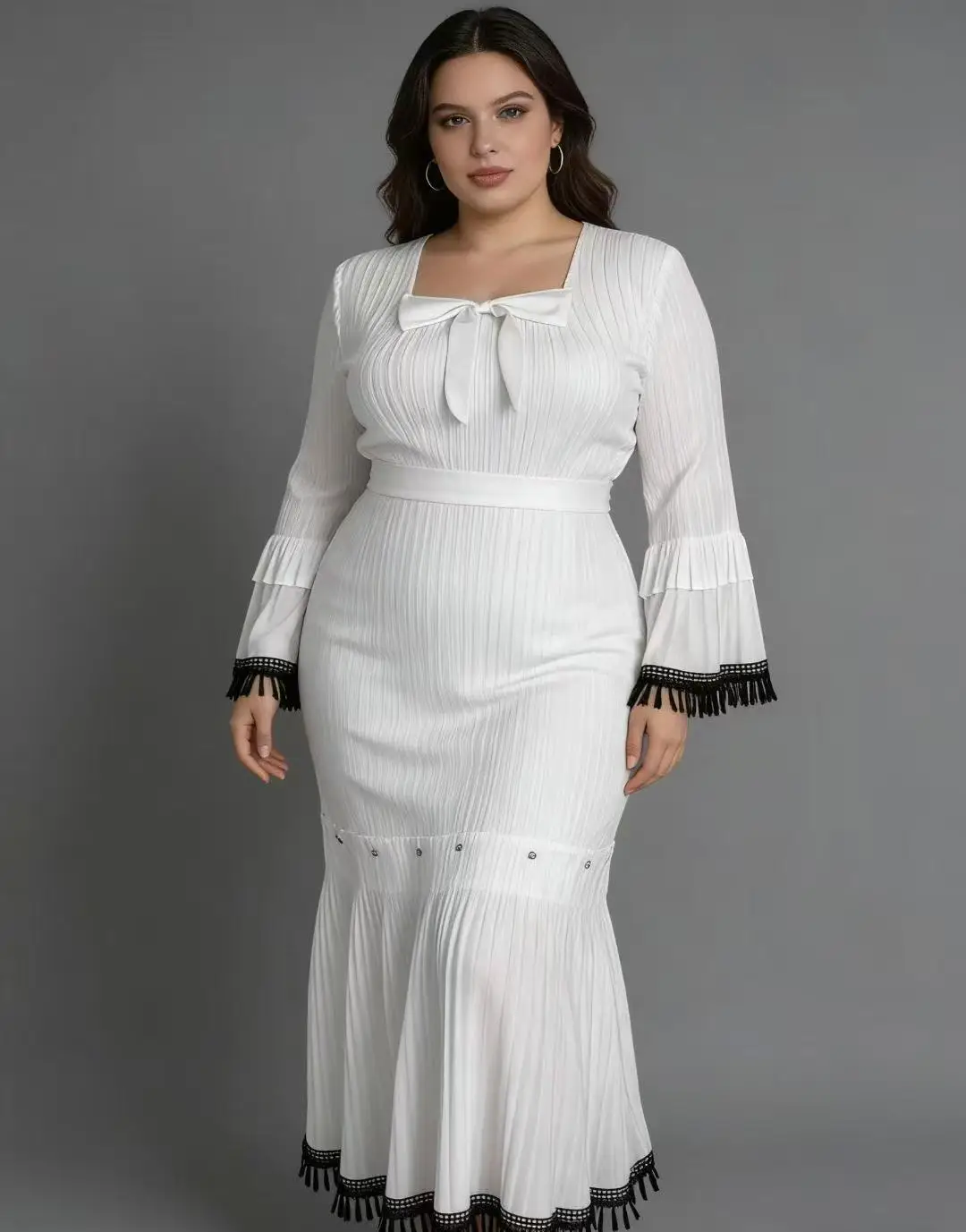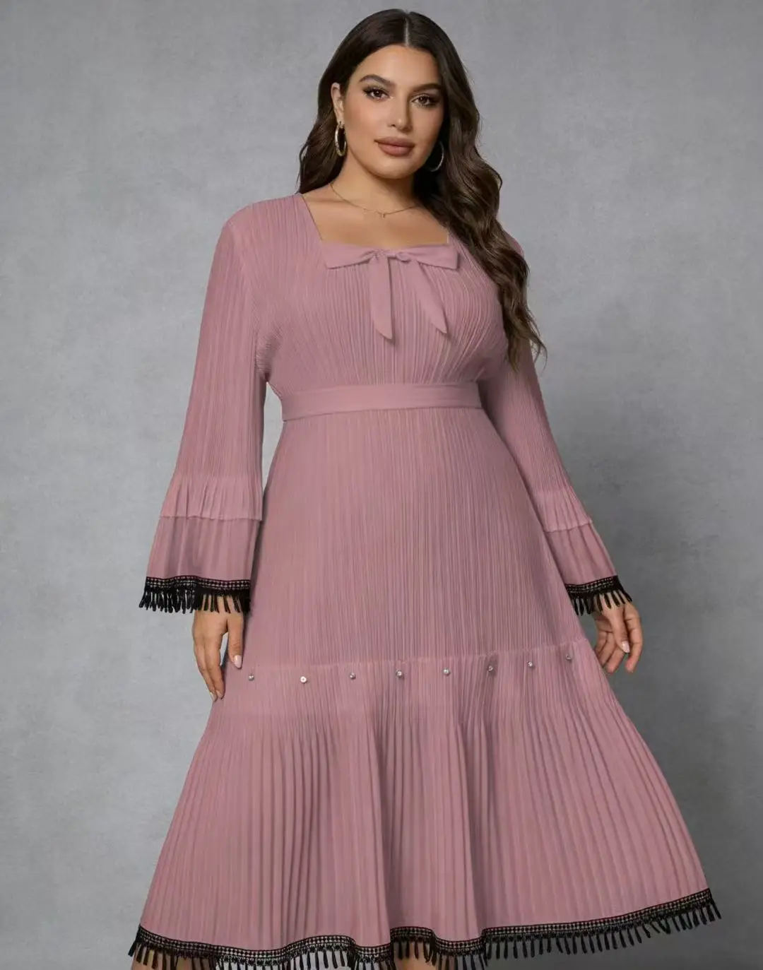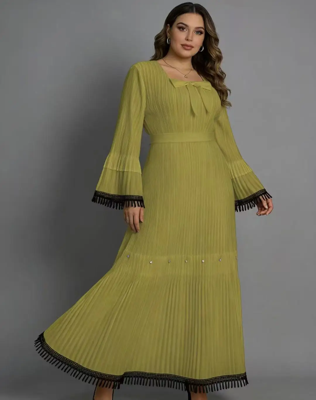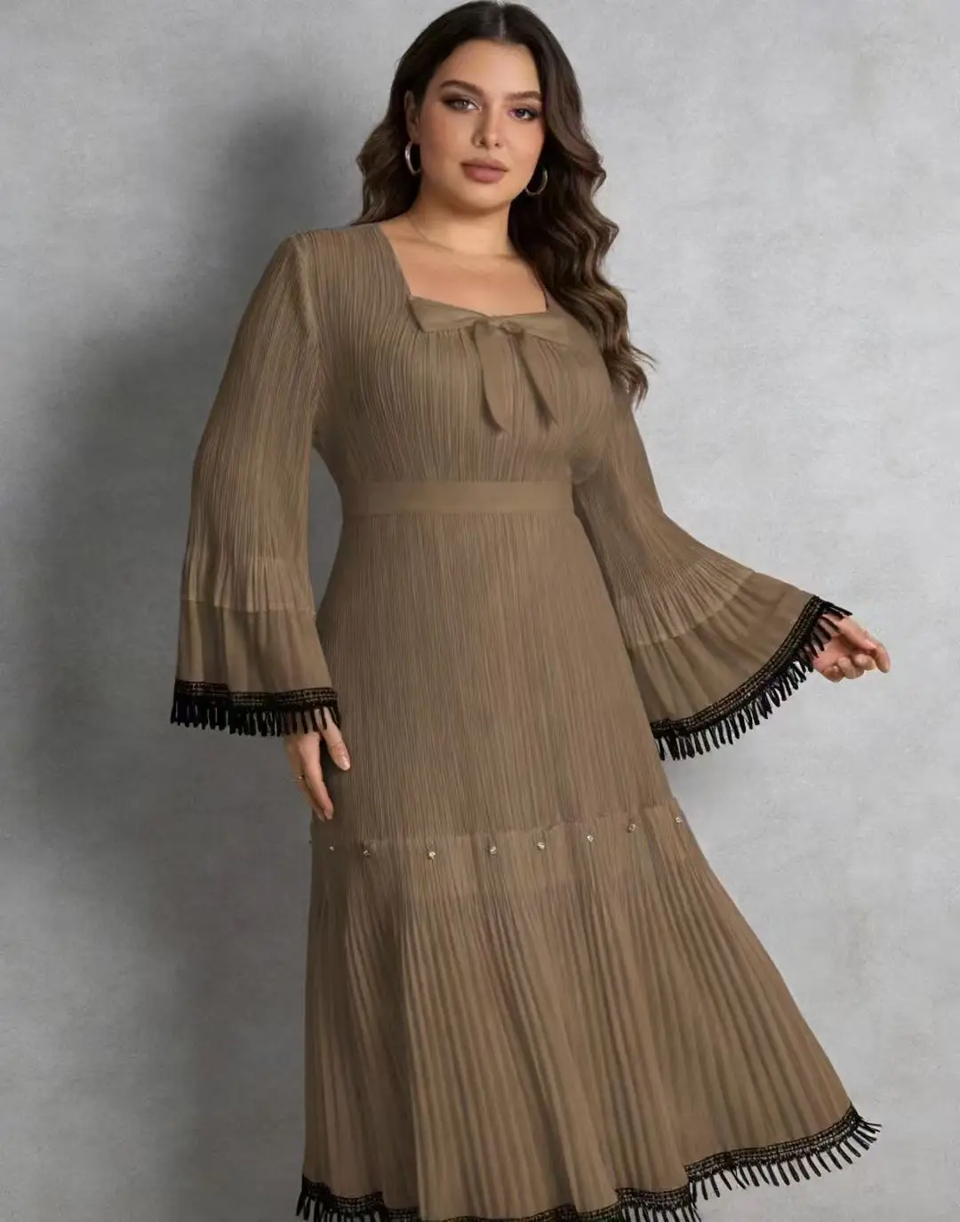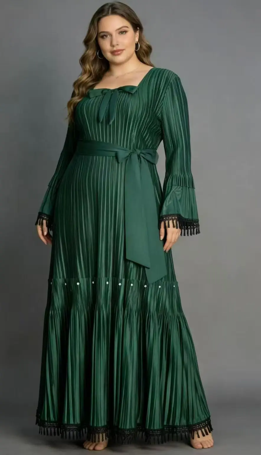 Plus Size Pleated Maxi Dress for Women - Elegant Long Sleeve Modest Dress with Tassel Trim
