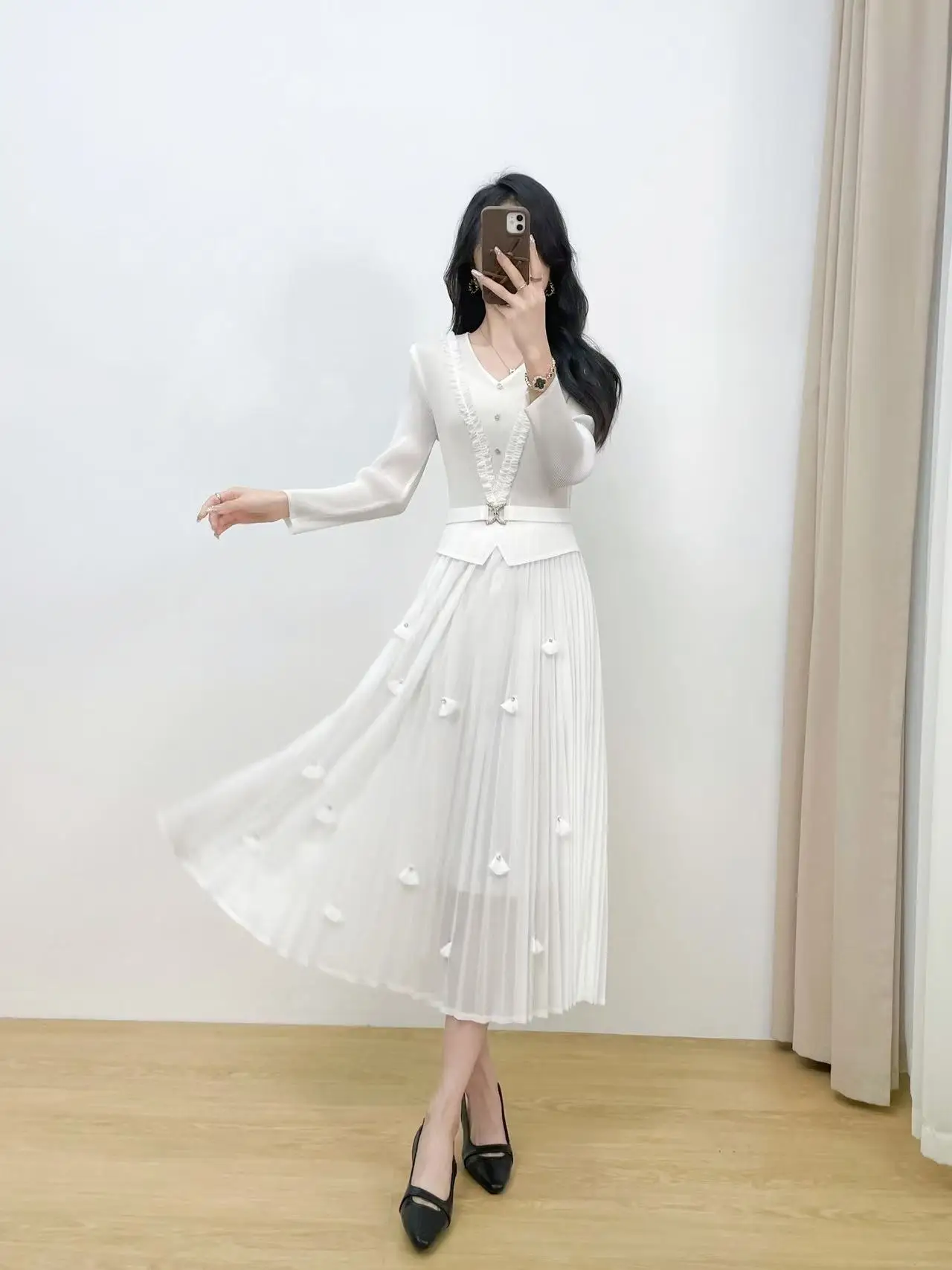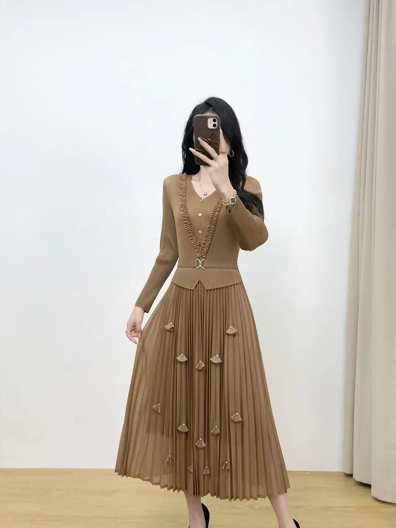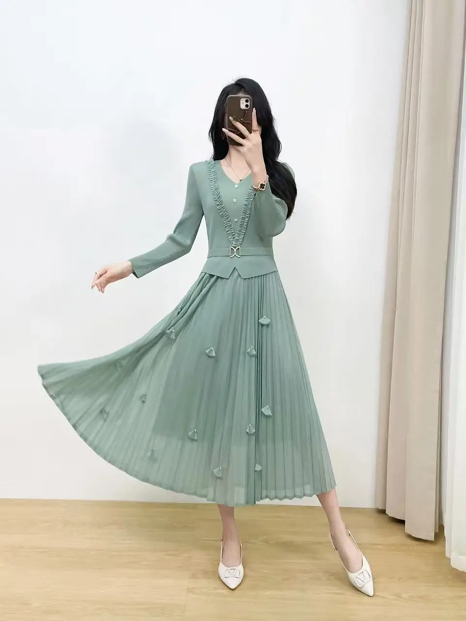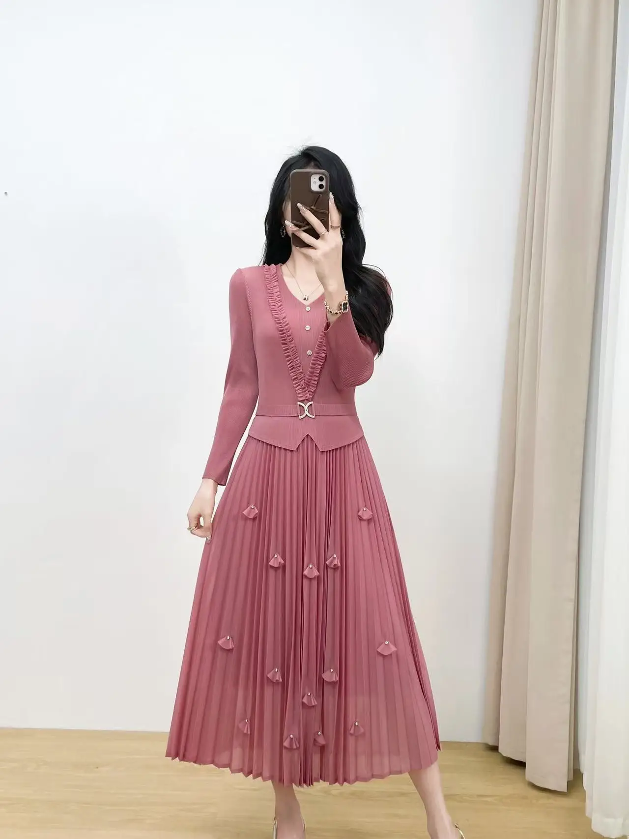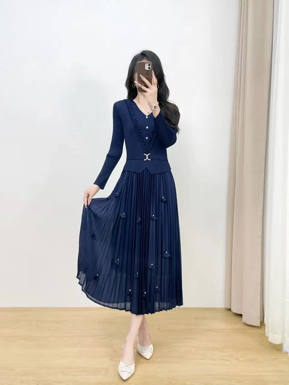 2026 New High-quality Long-sleeved Pleated Dress with Elastic Waist and Large Size for Women's Wear