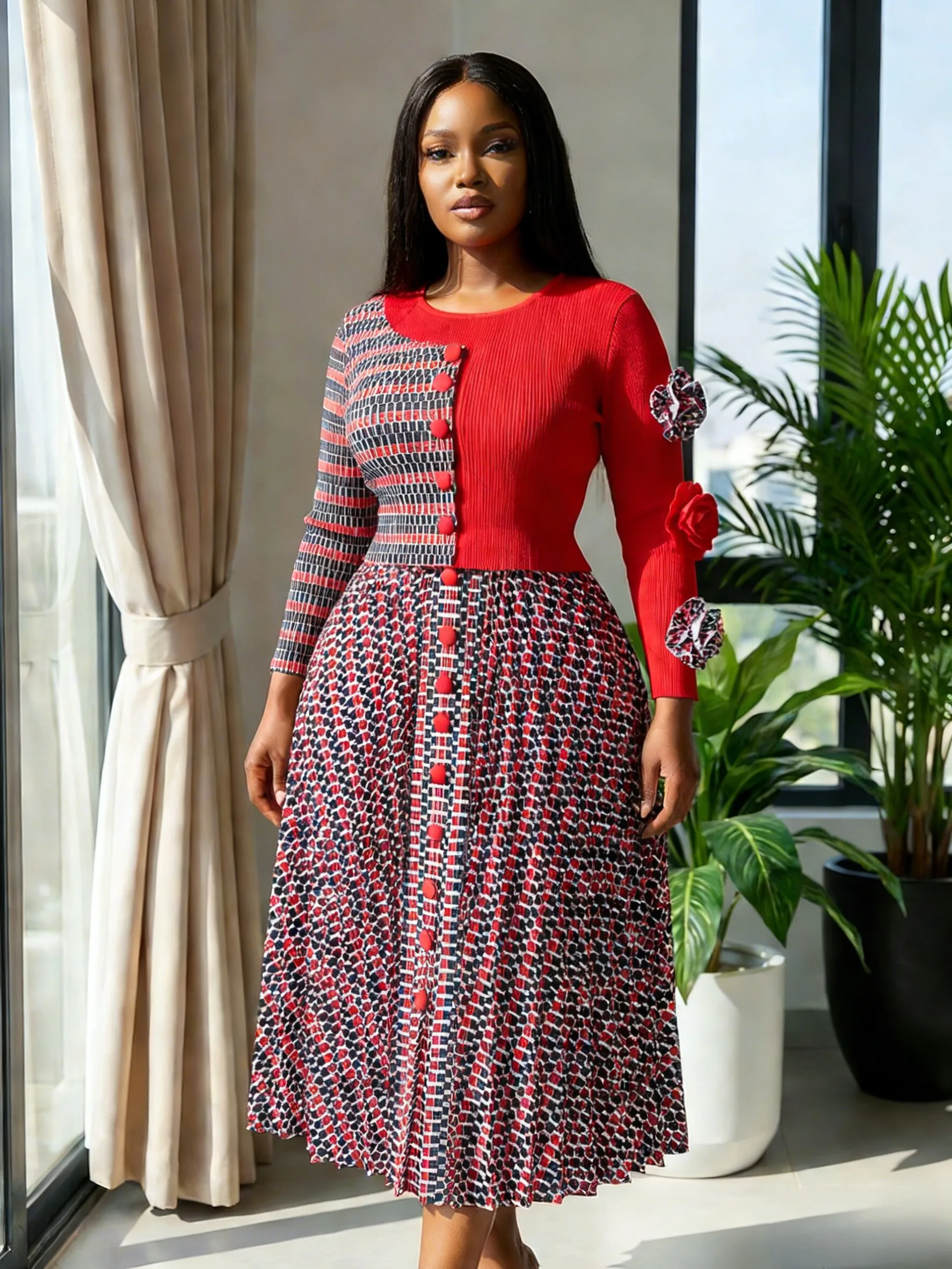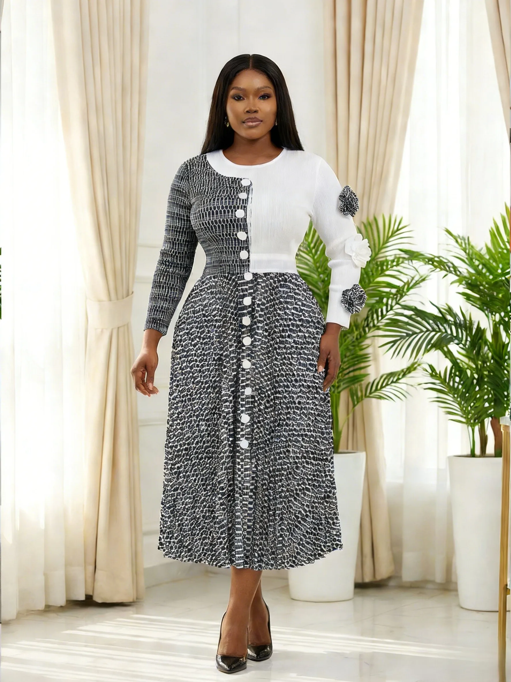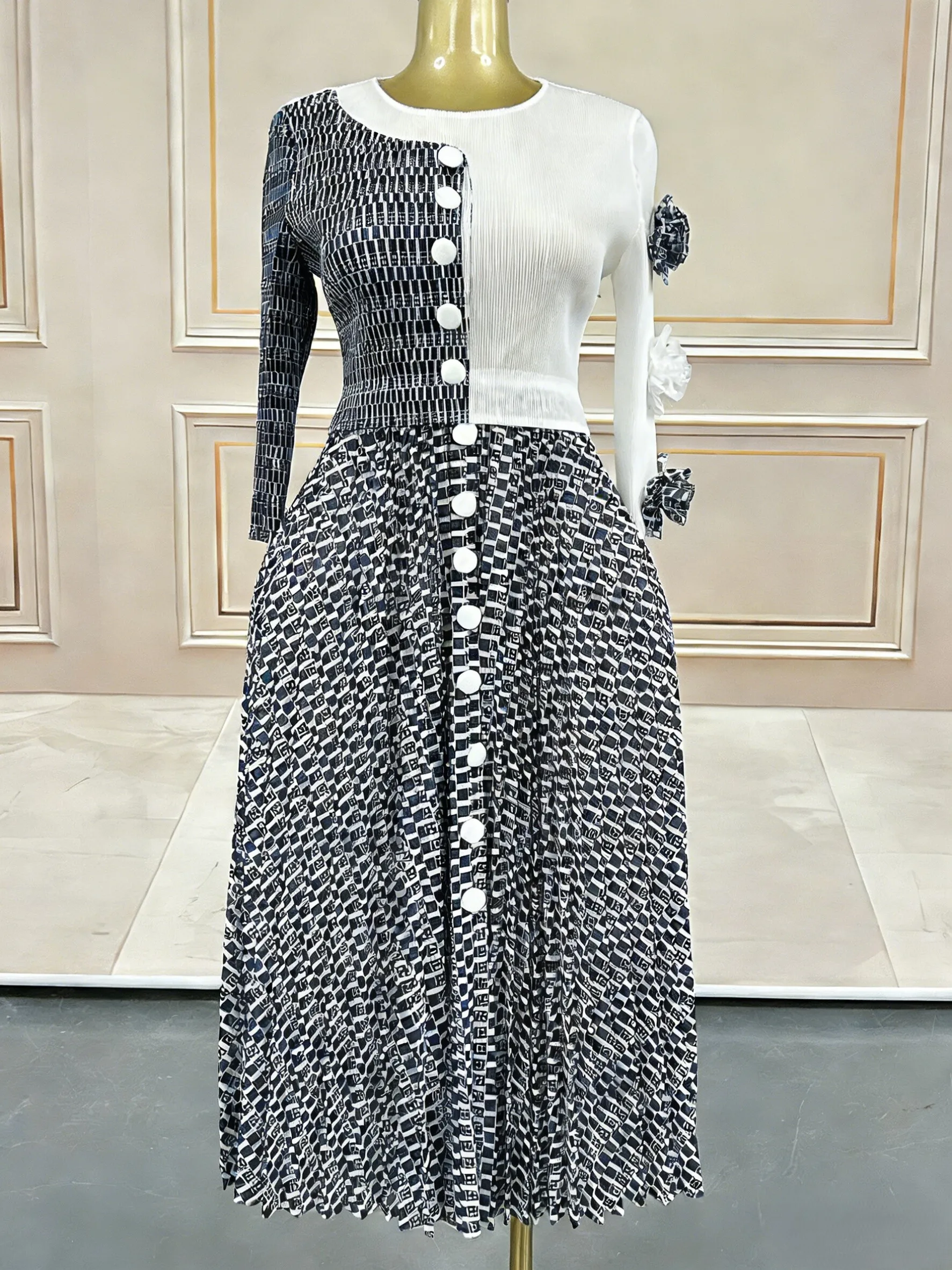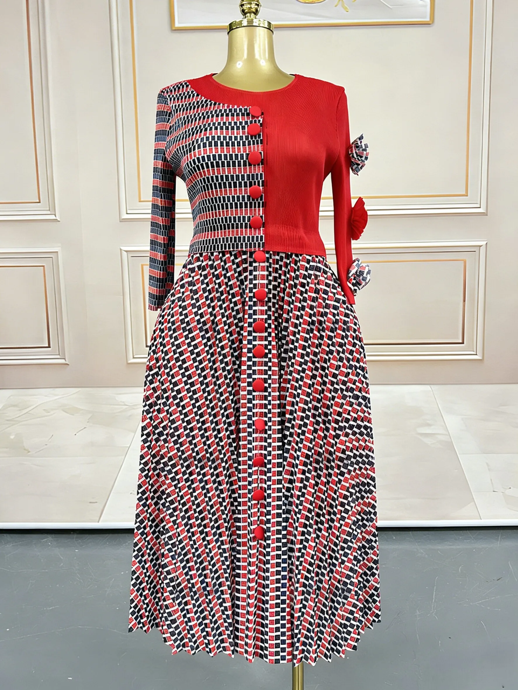 Miyake Pleated Midi Dress with Printed Double-Color Design Plus Size Eco-Friendly for Women Exuding Elegant Fitted Style