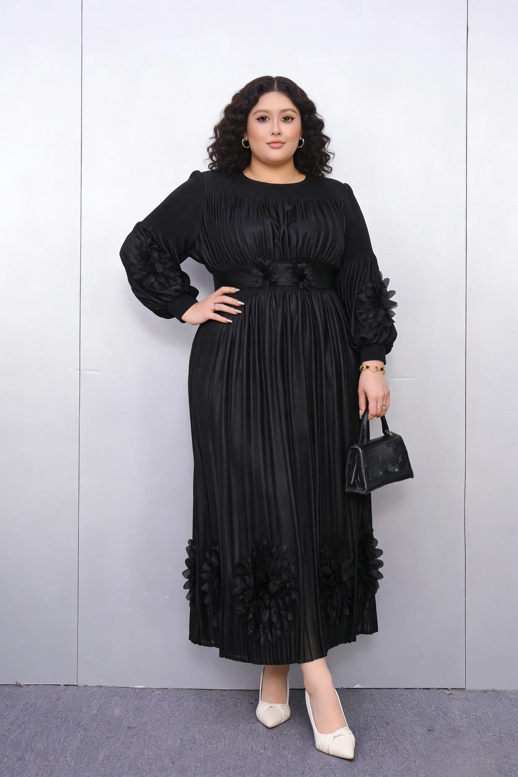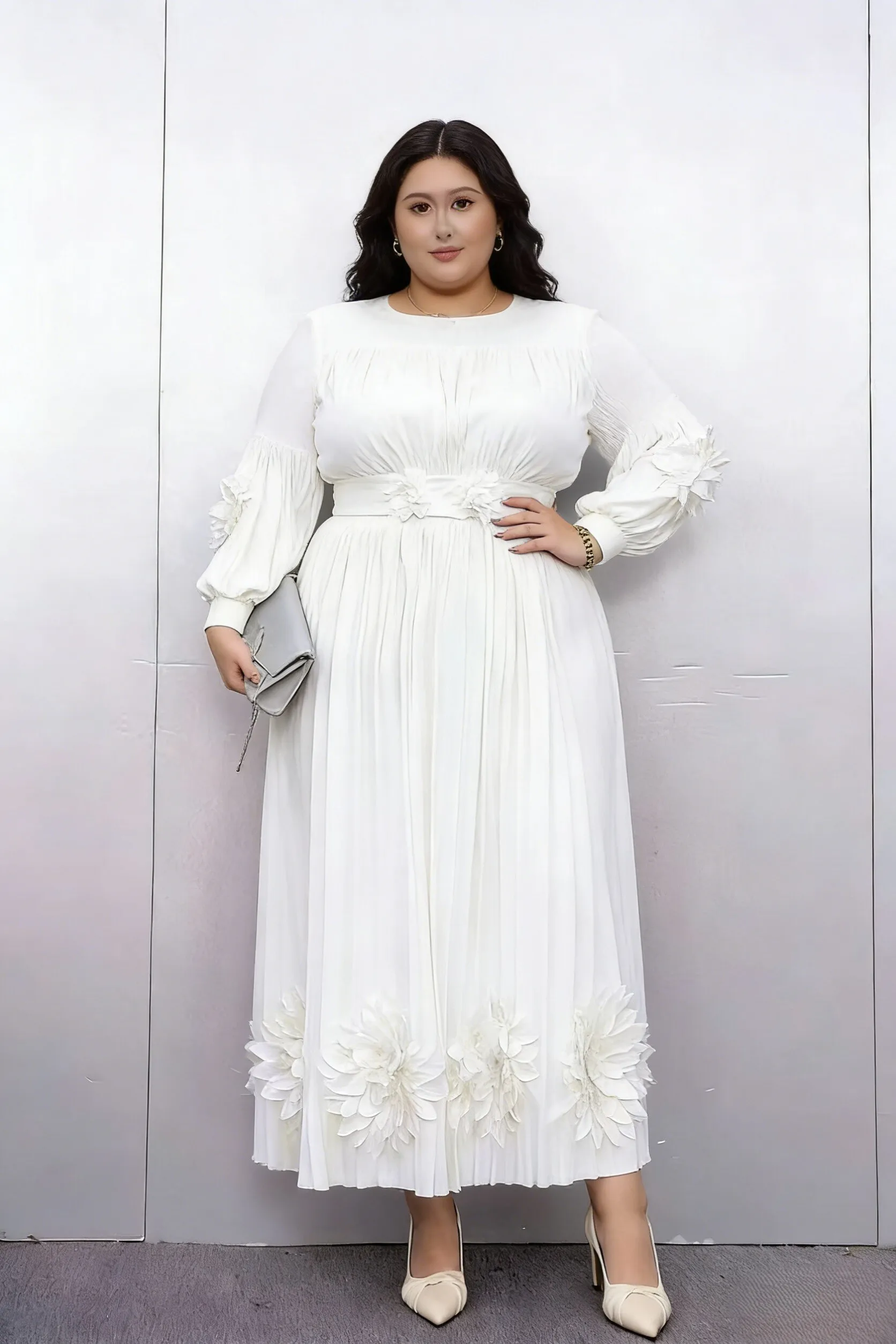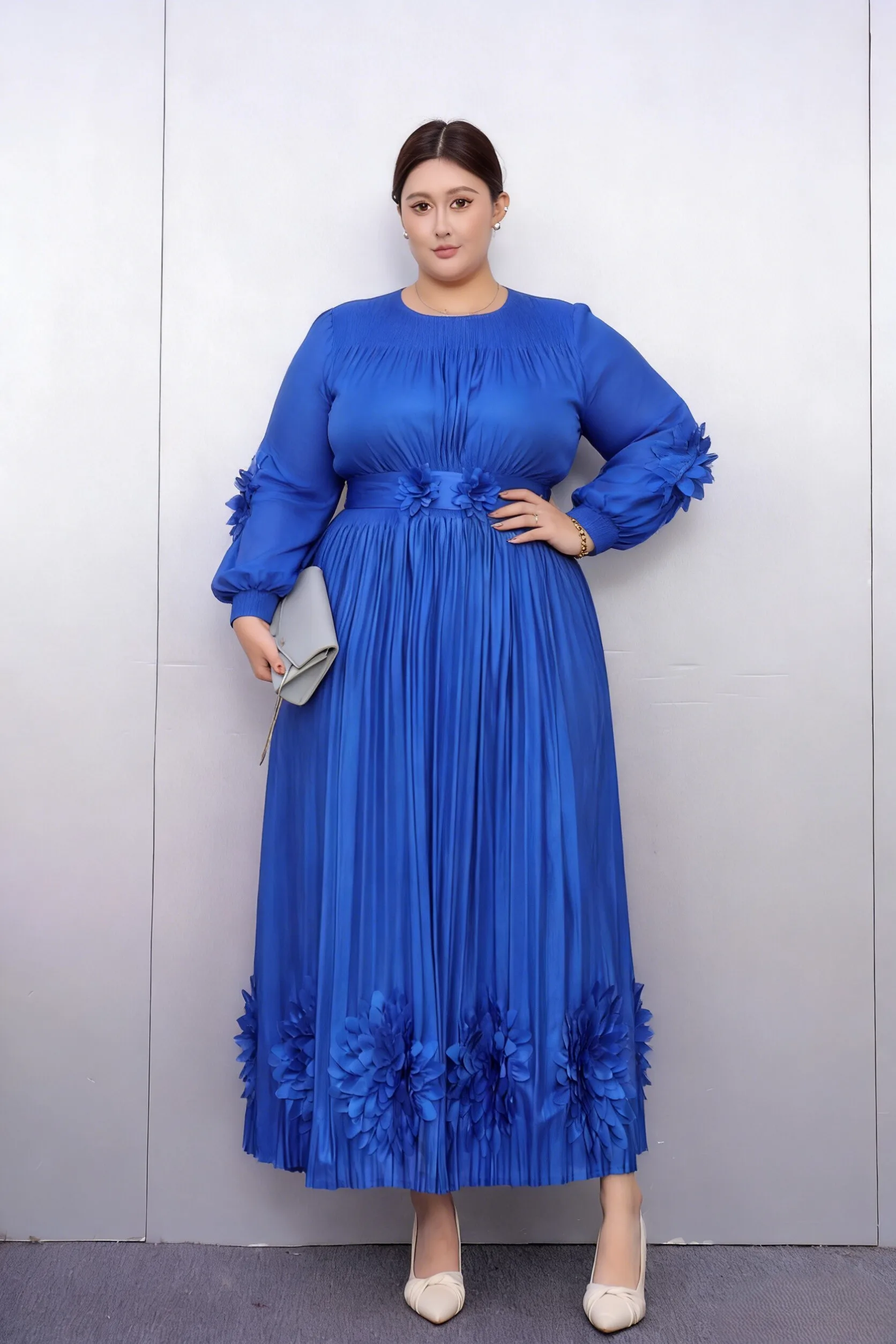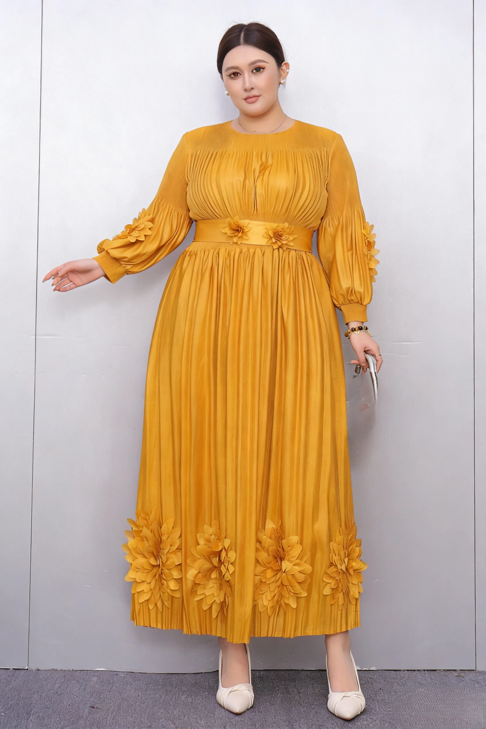 Plus Size Women Yellow Pleated Maxi Dress Long Sleeve 3D Flower Decor Belted Elegant Dress for Fat Ladies