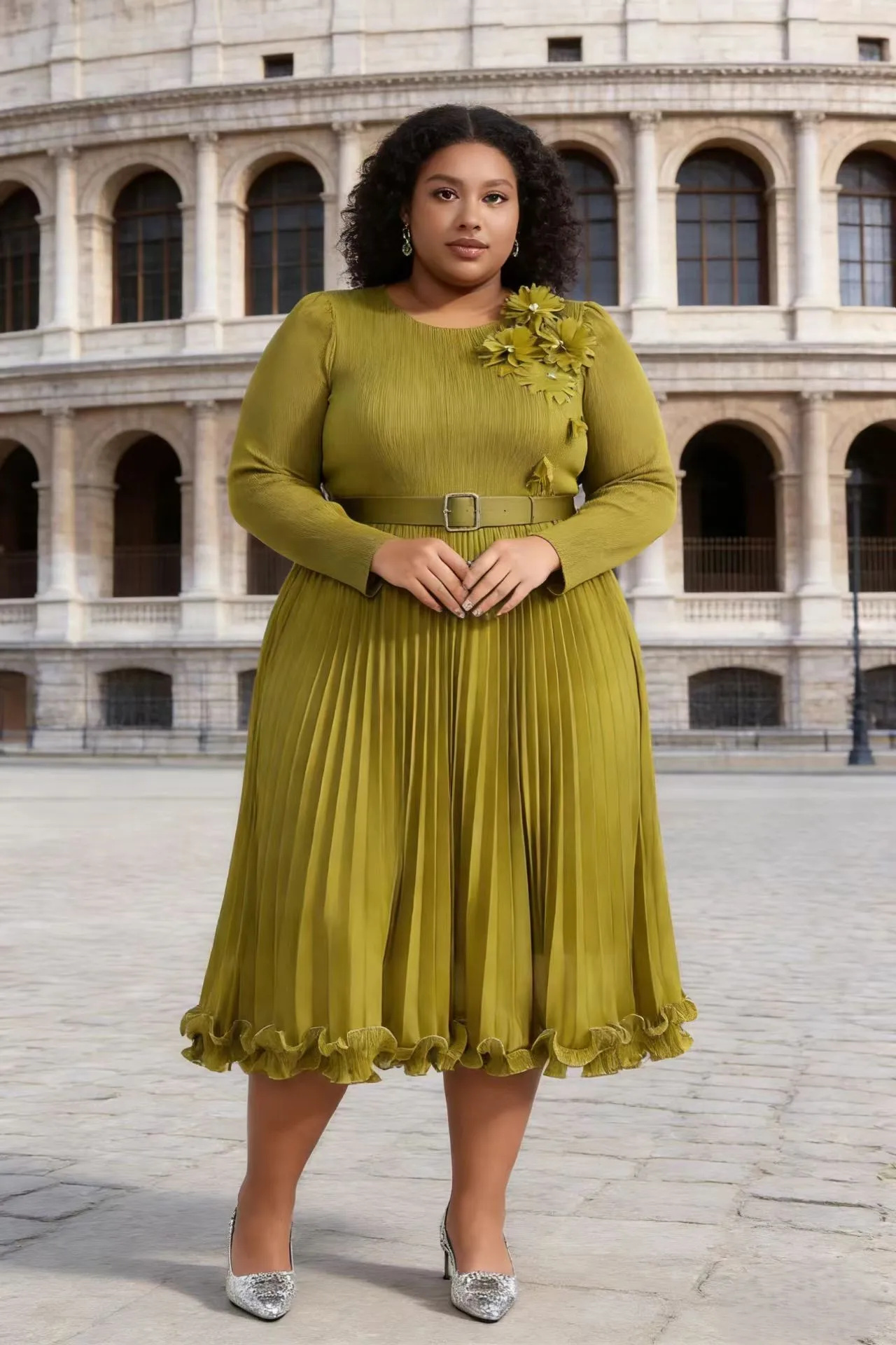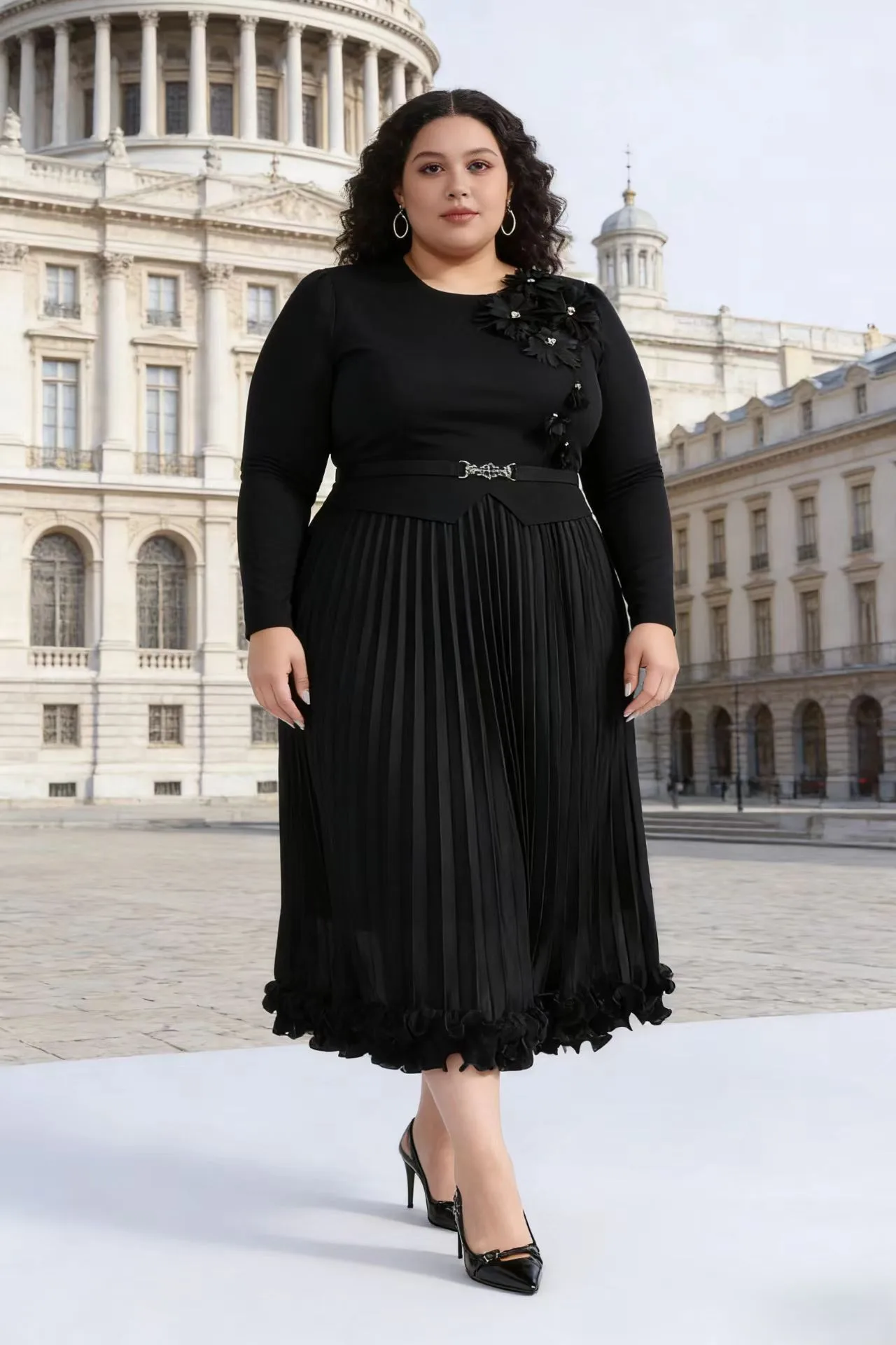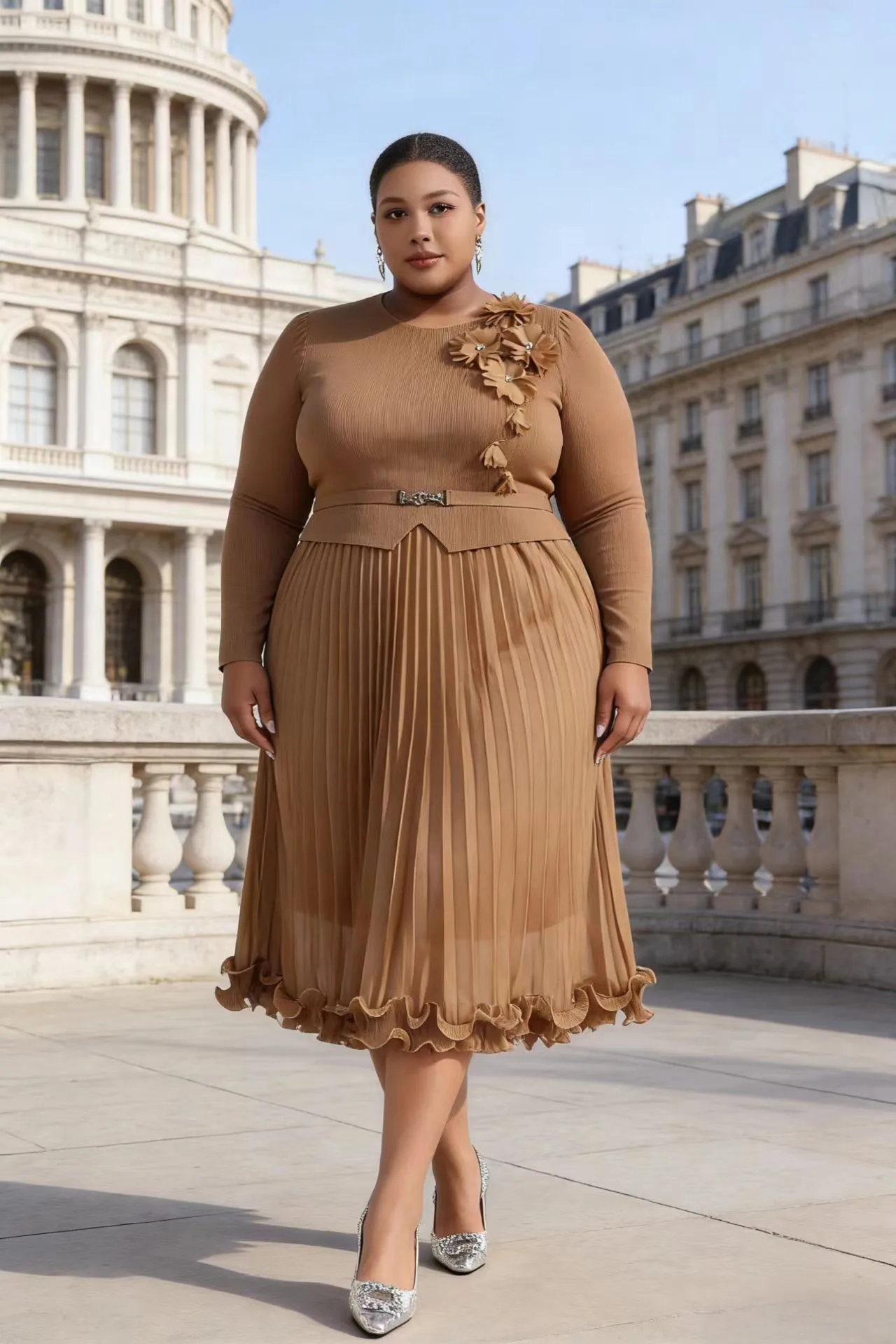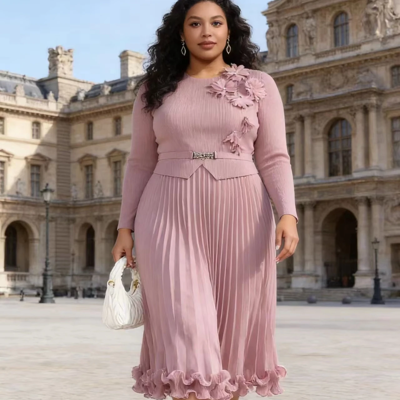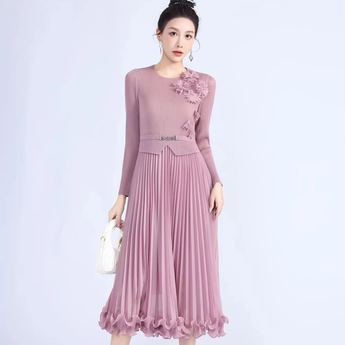 Elegant Miyake Pleated Dress Women's Long Sleeve Slim Fit Floral Decorated Midi Pleated Dress