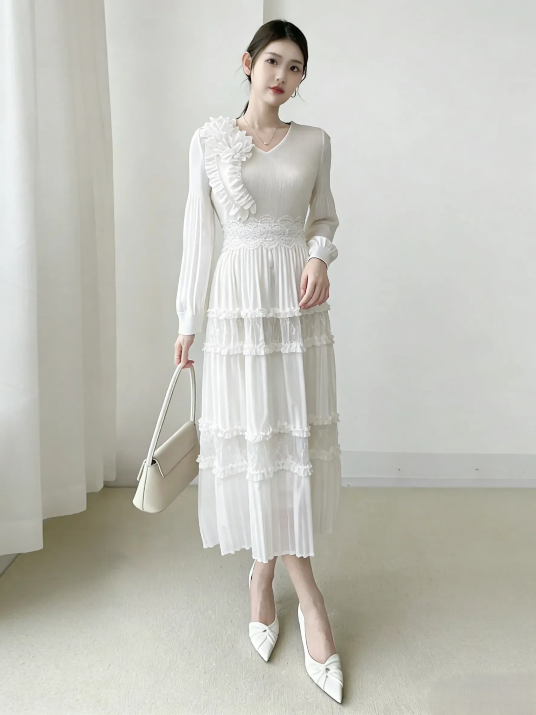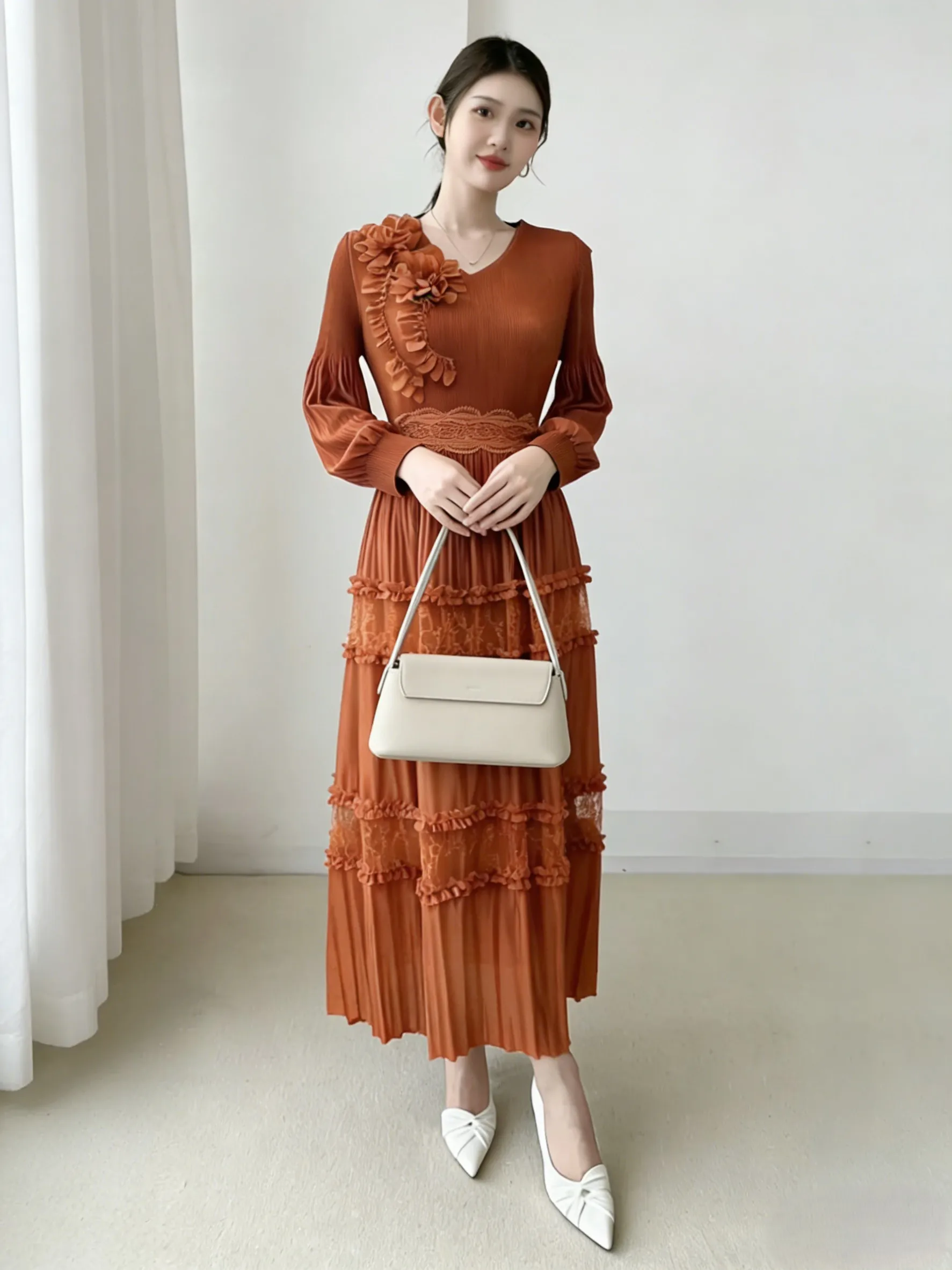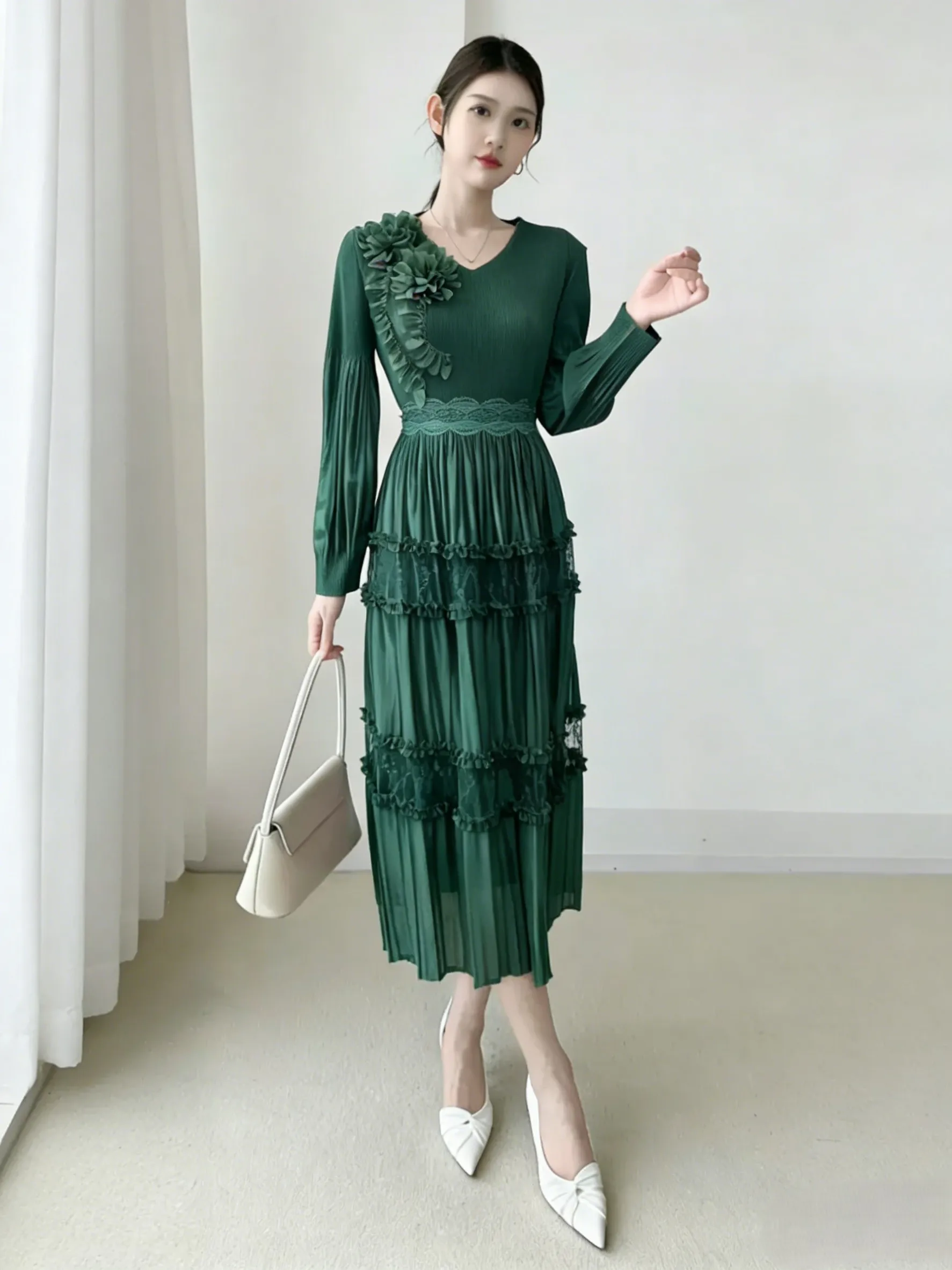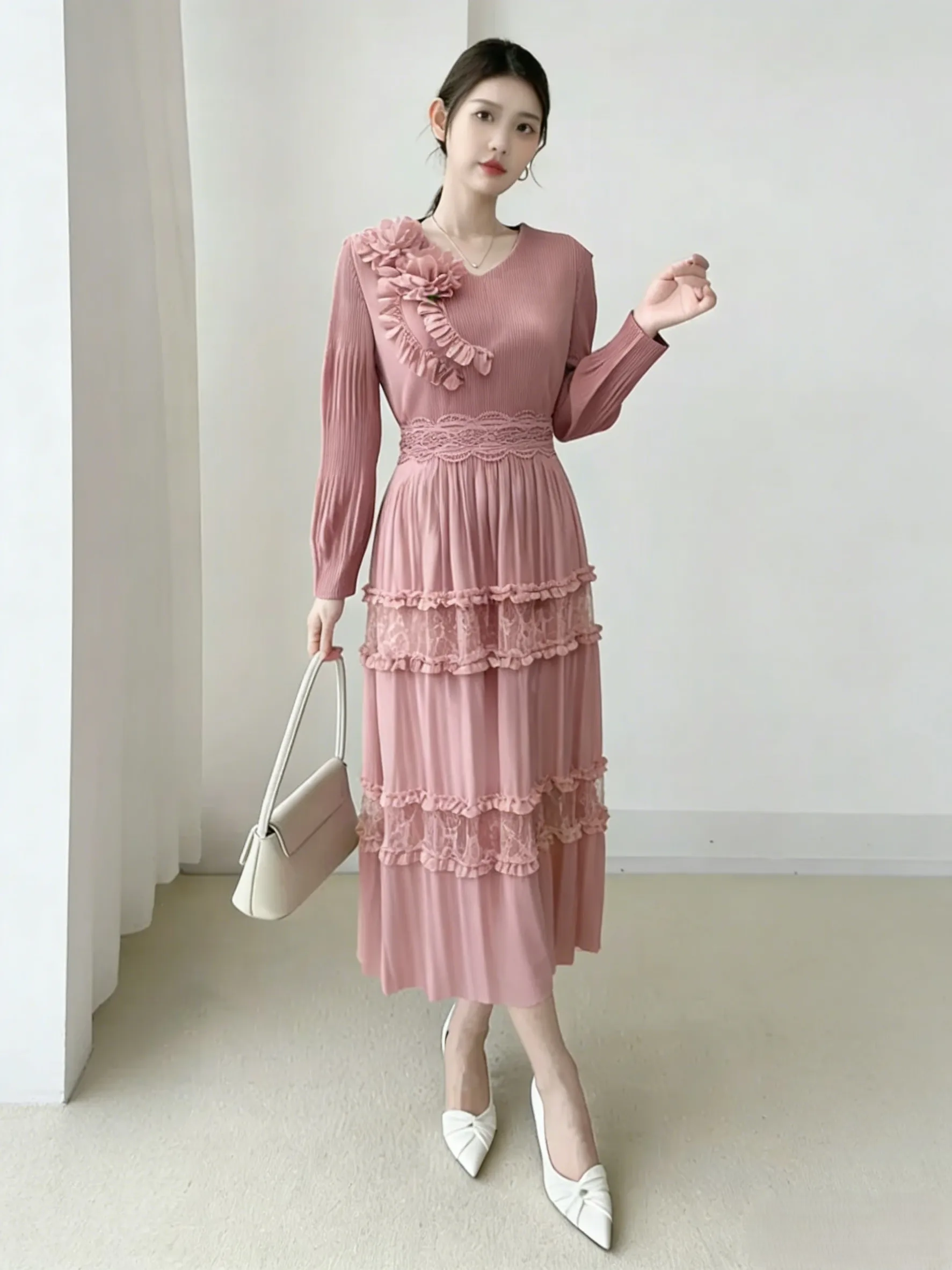 Women's Oversized Pleated Dress with Long Sleeves and Lace Trim - an Elegant Long Dress