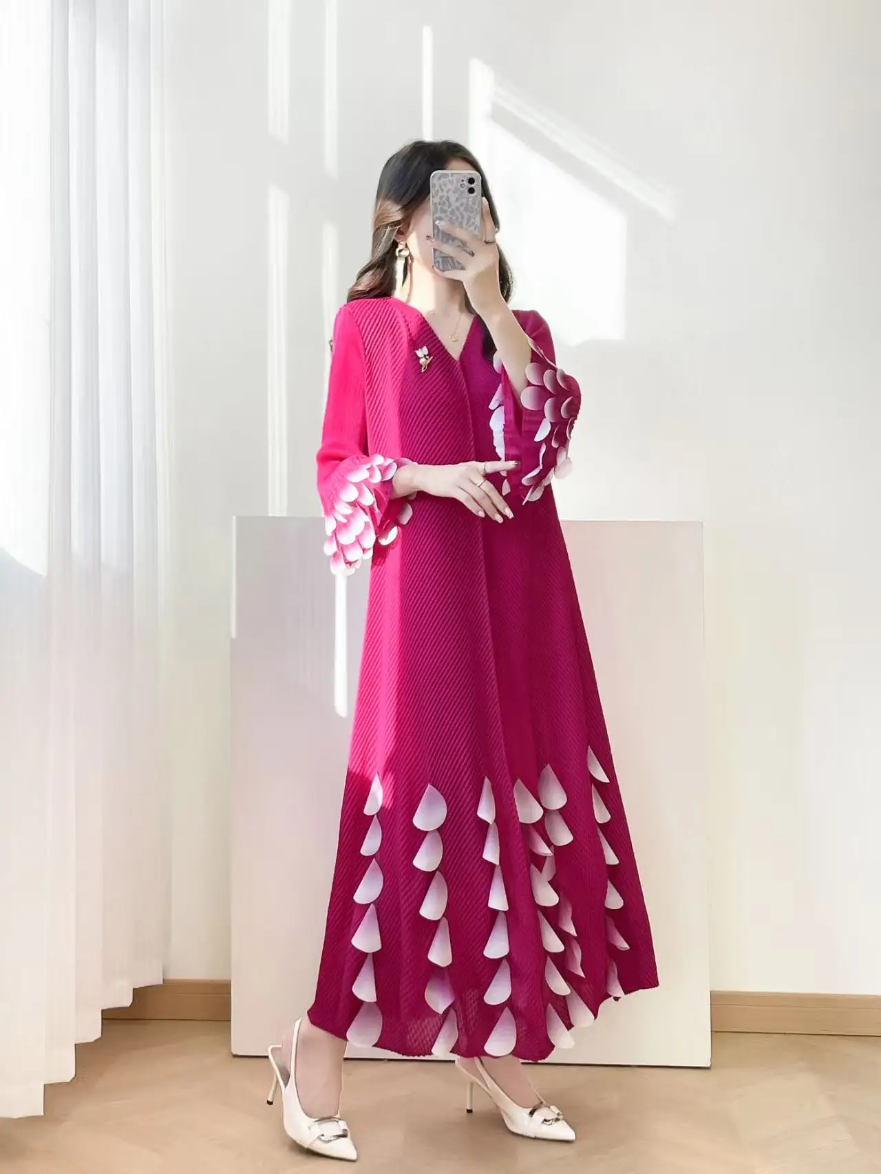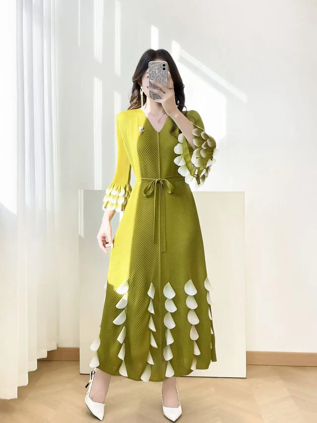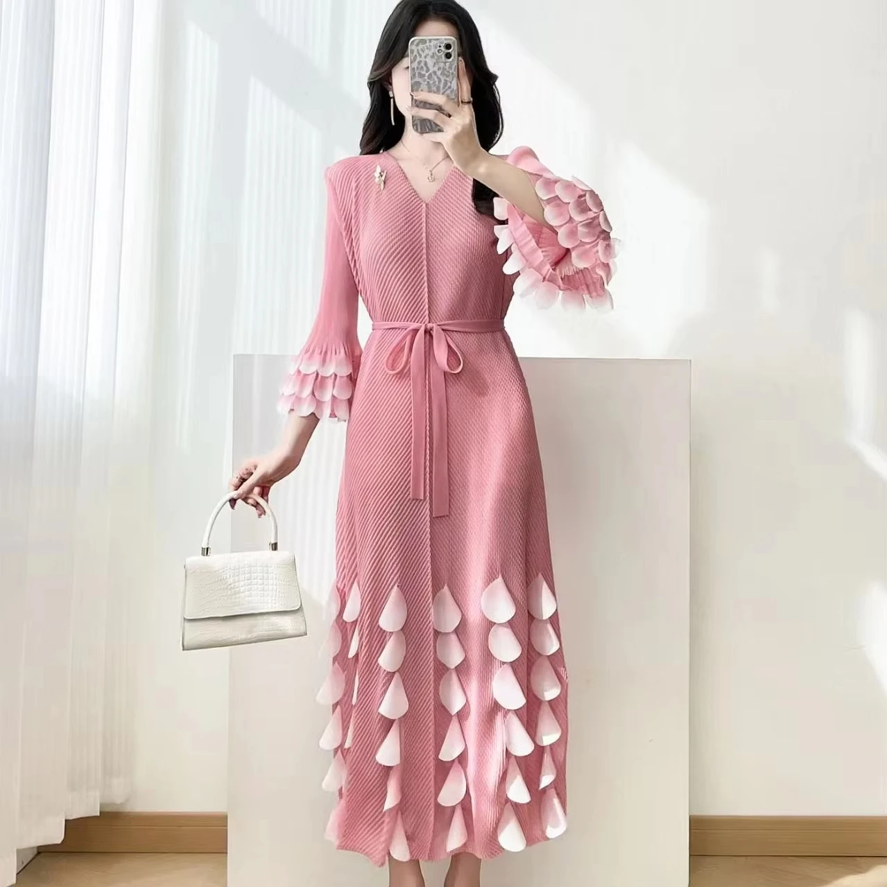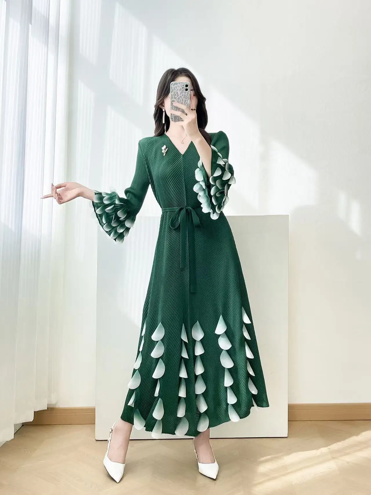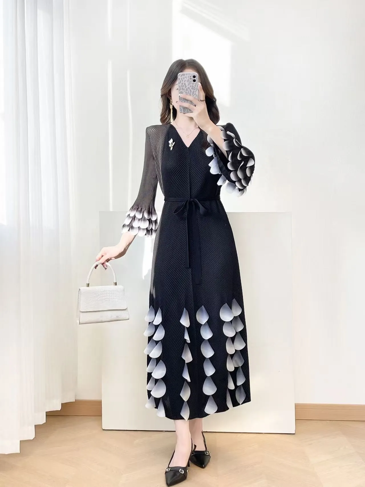 European and American Elegant Long Pleated Dress with Flower Petal Decoration Elegant Honeycomb Pleated Dress