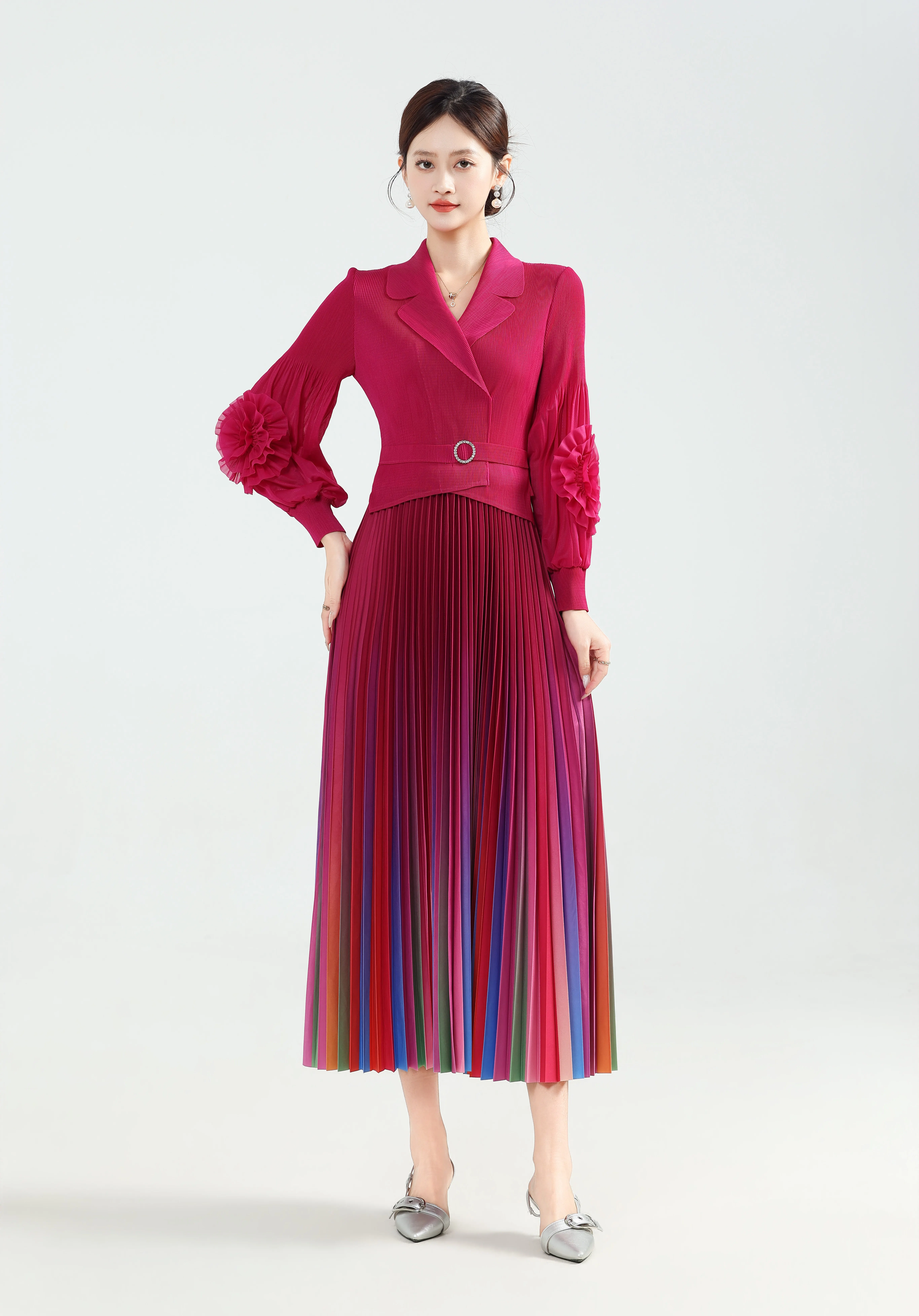 ZYHT 73903 Gemstone Crystal 3D Flower Decoration Ruched One Shoulder High Slit Long Sleeve Maxi Simple Elegant Evening Dress