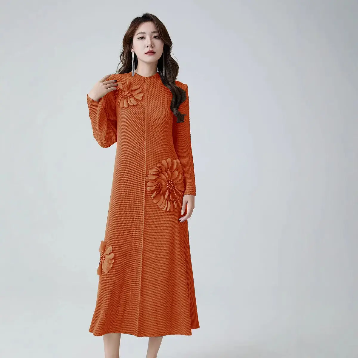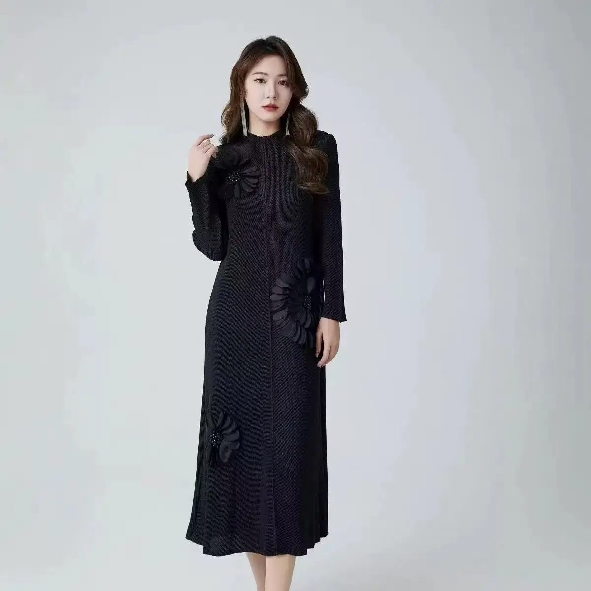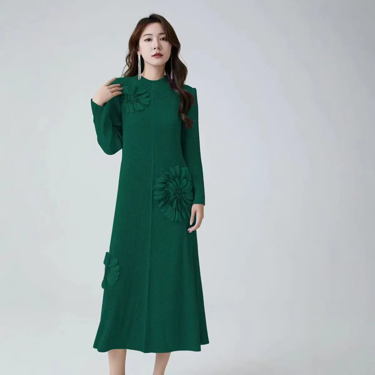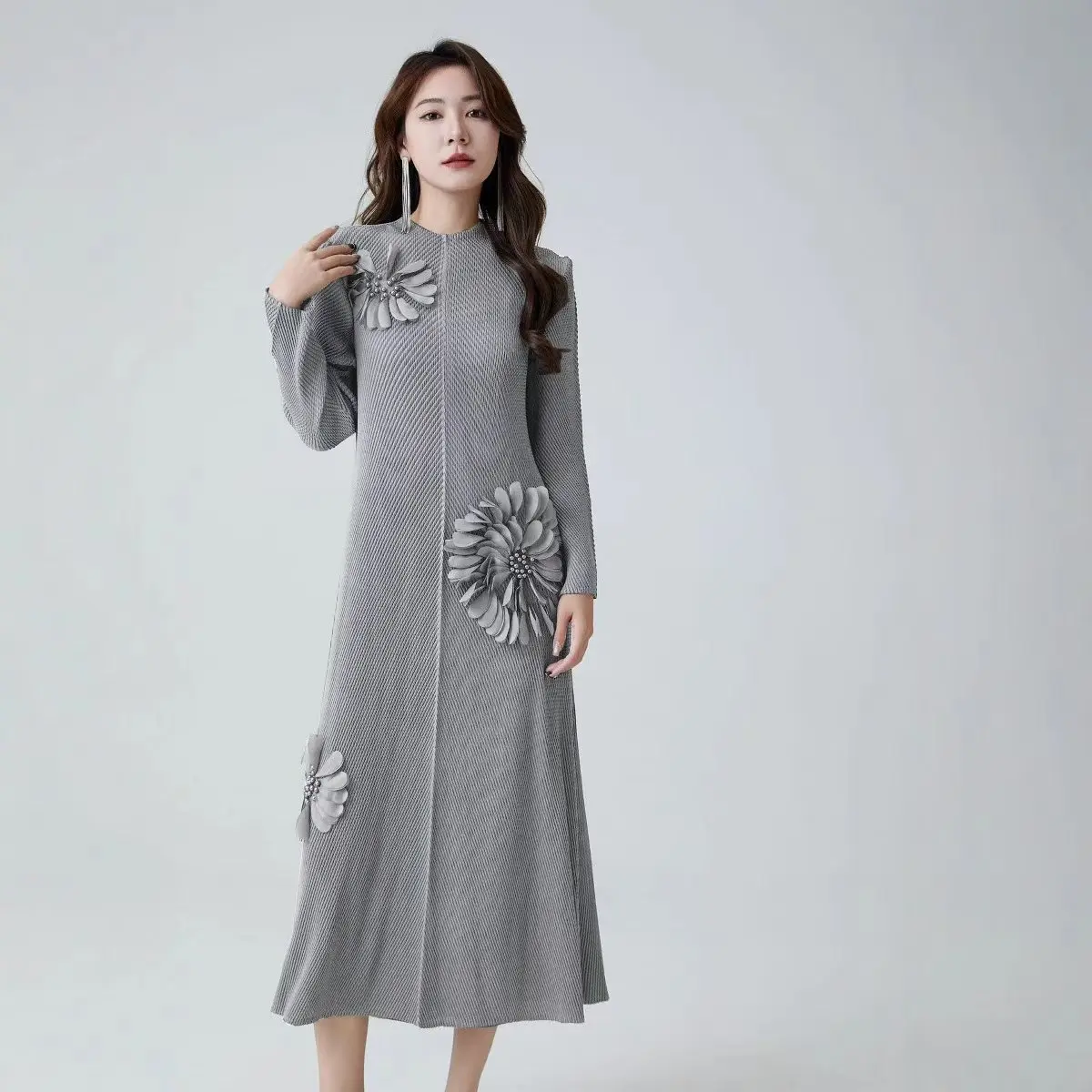 Elegant Women's Pleated Dress with Round Neckline and Long Sleeves - Large Size Dress