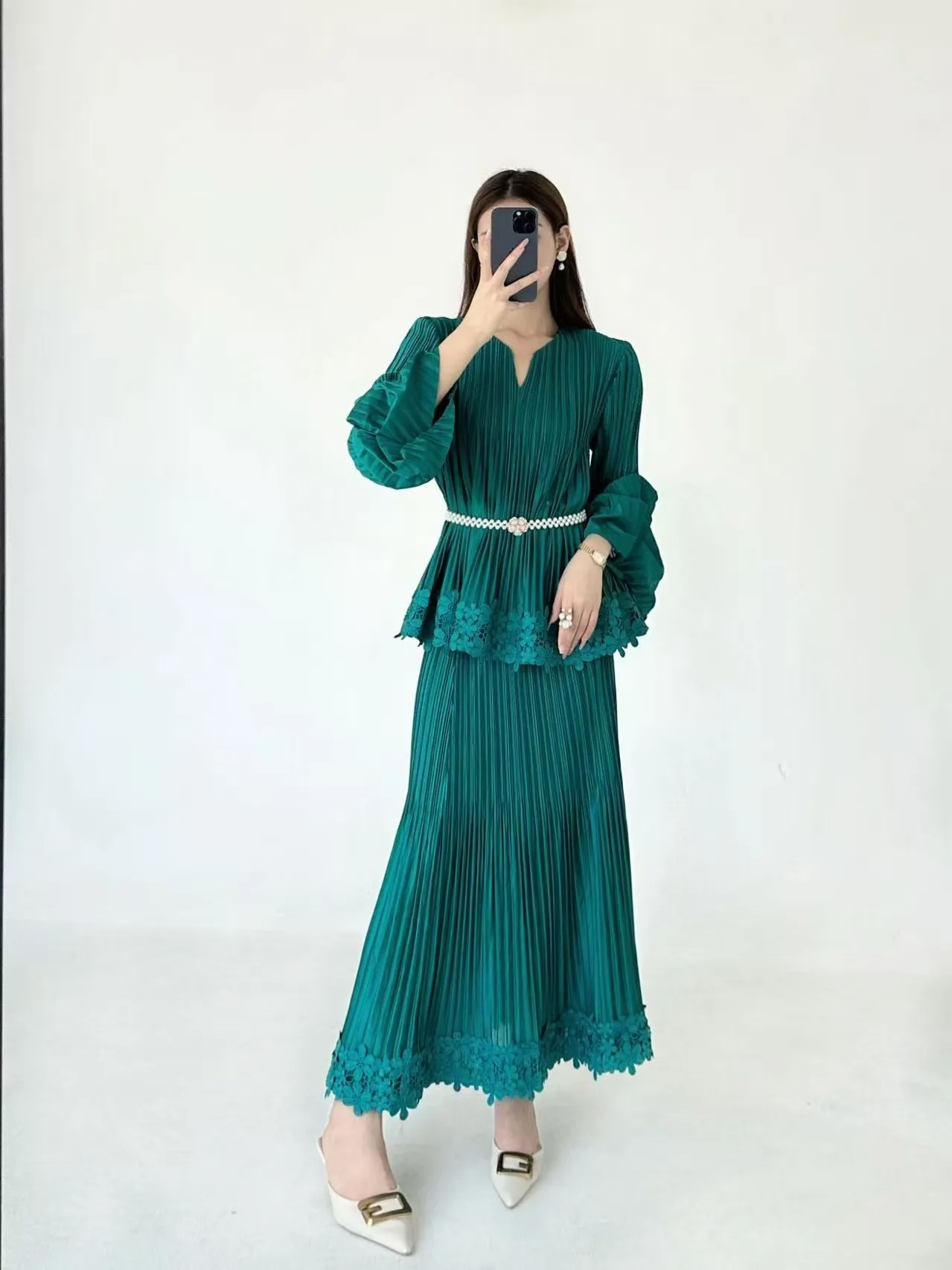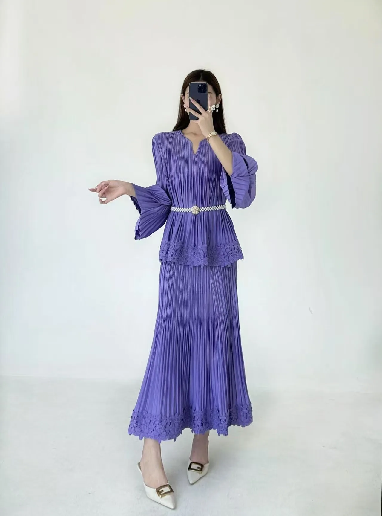 Women's Pleated 2 Piece Set - Long Sleeve V-Neck Blouse with Lace Trim Maxi Skirt Elegant Matching Outfits