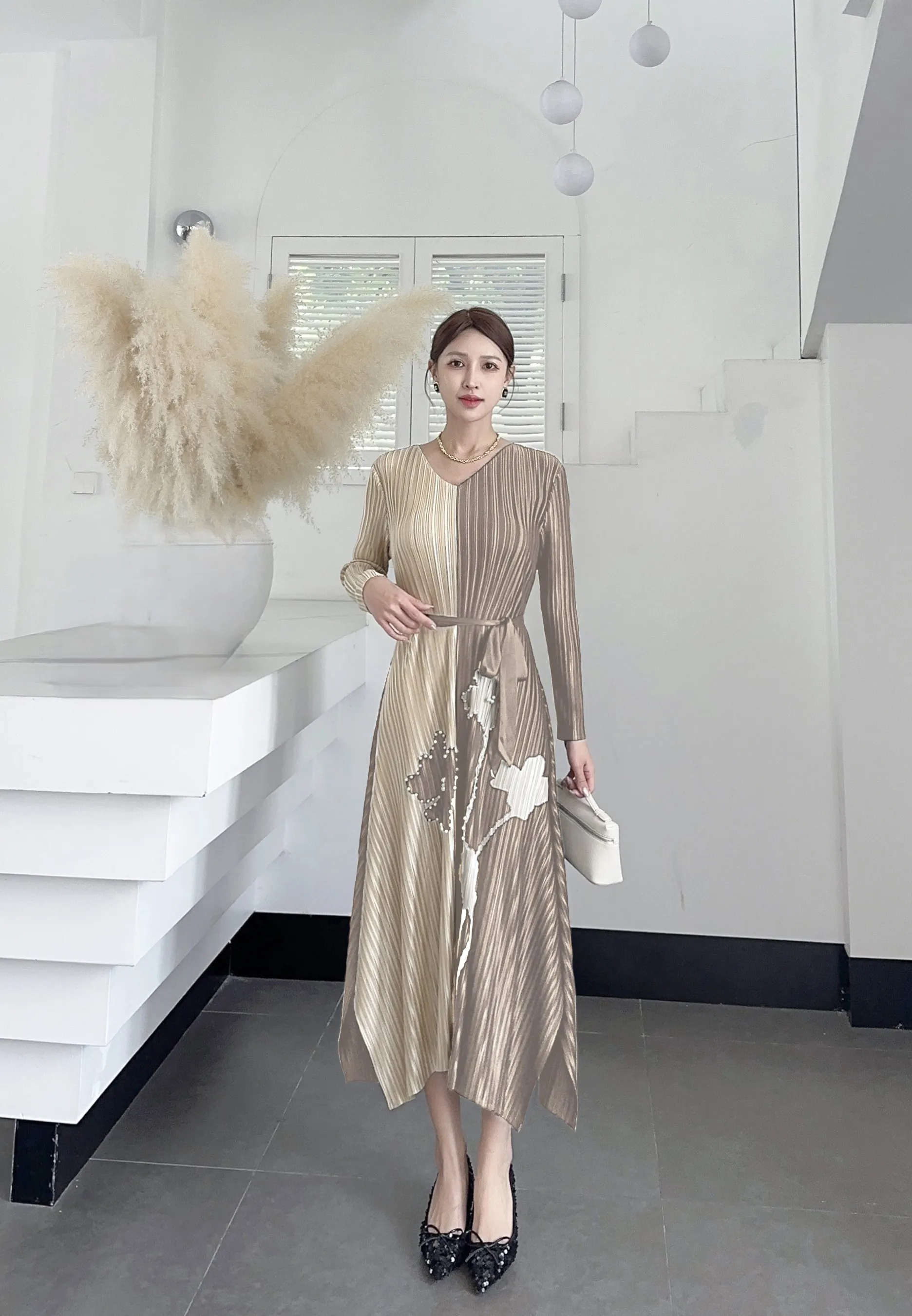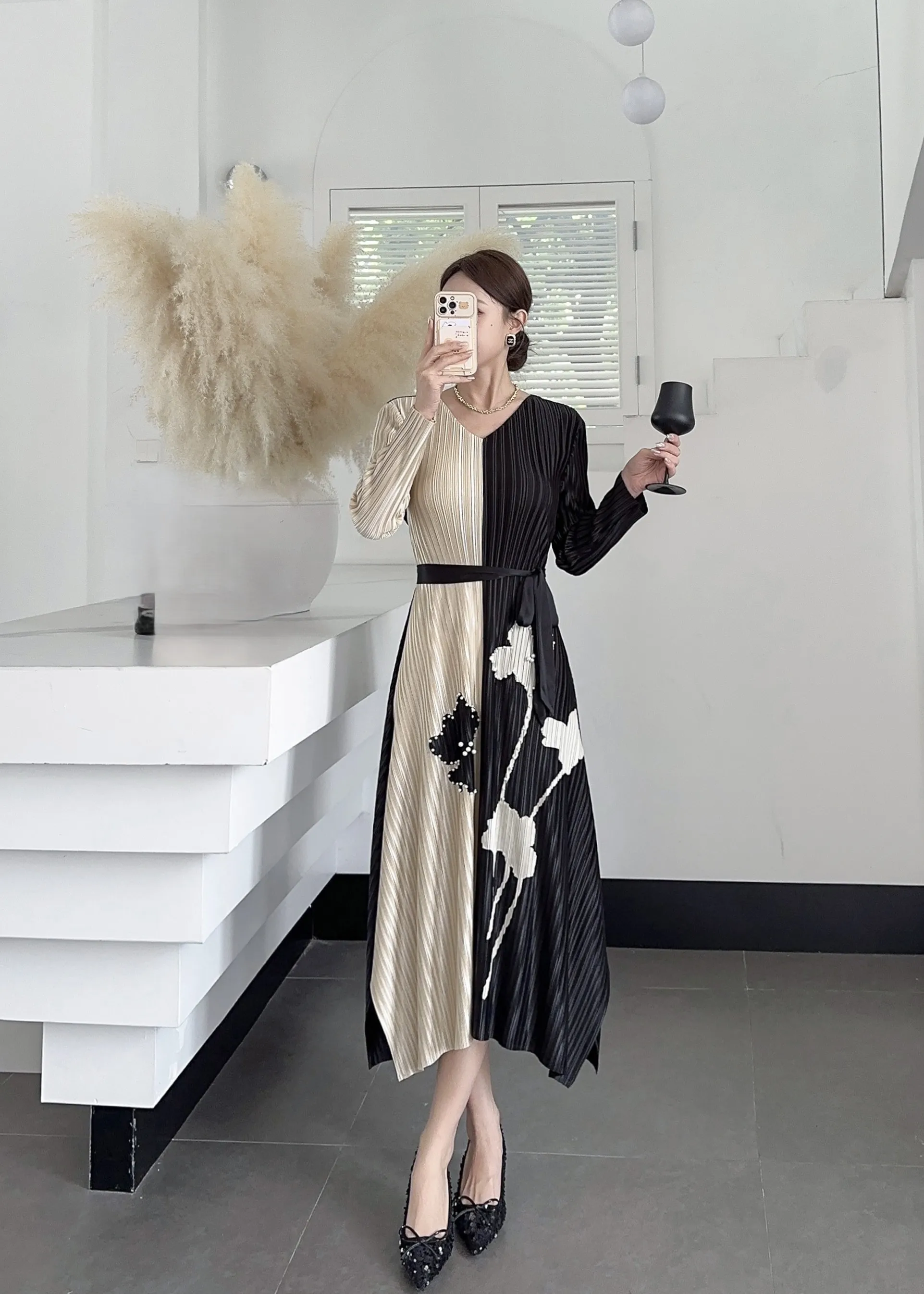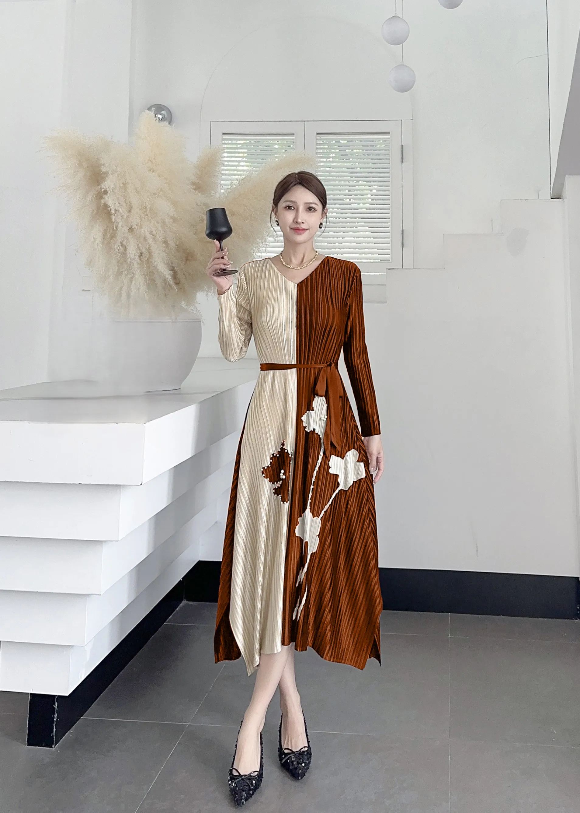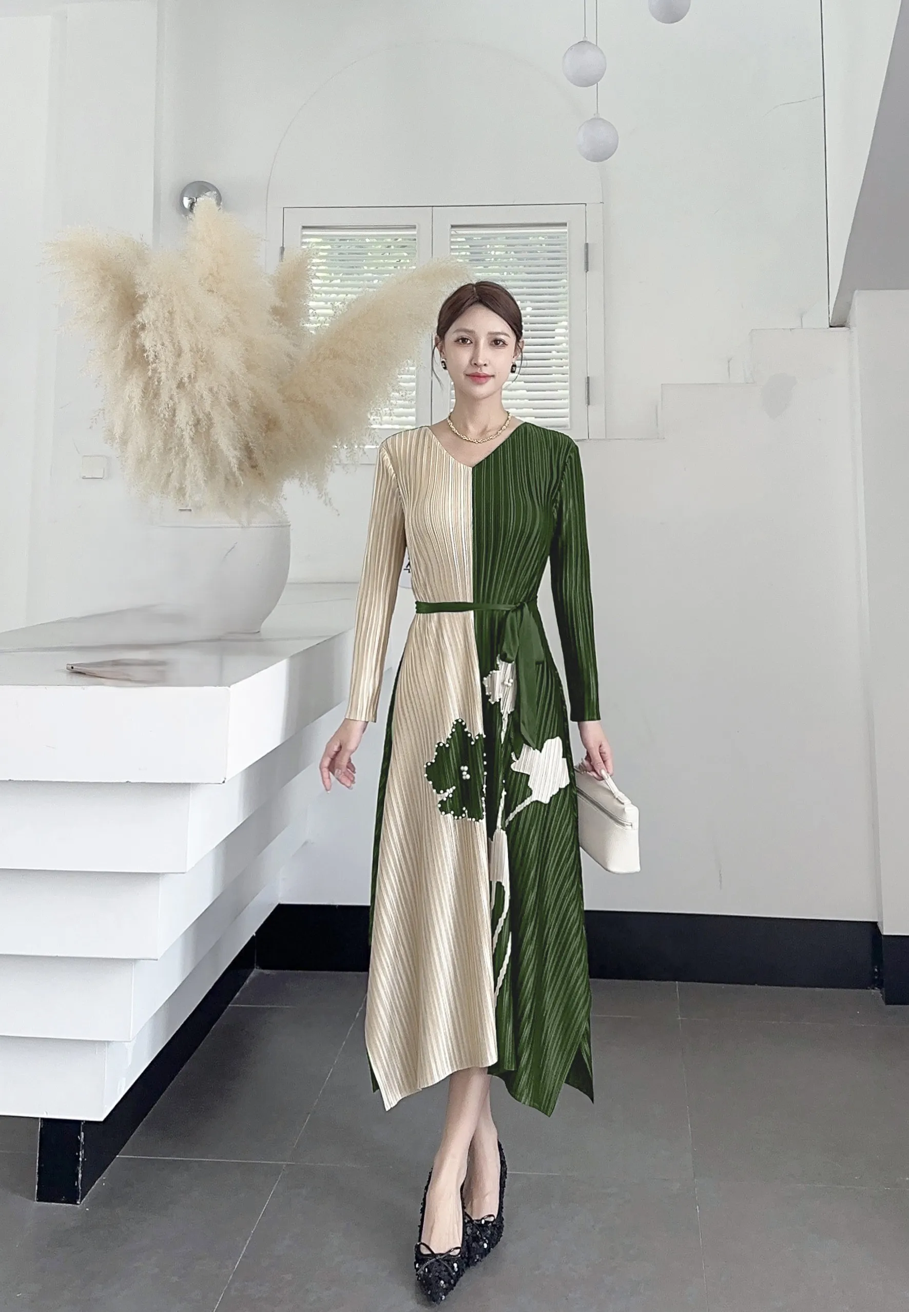 Lady's Elegant Plus-size Pleated Dress in Double-color Design with Fashionable Prints and Elastic Waistline