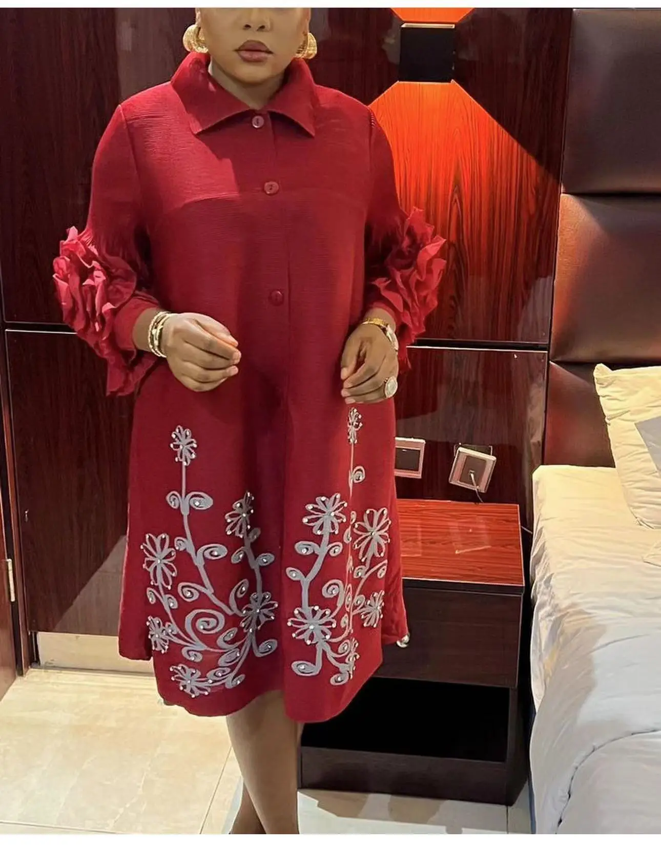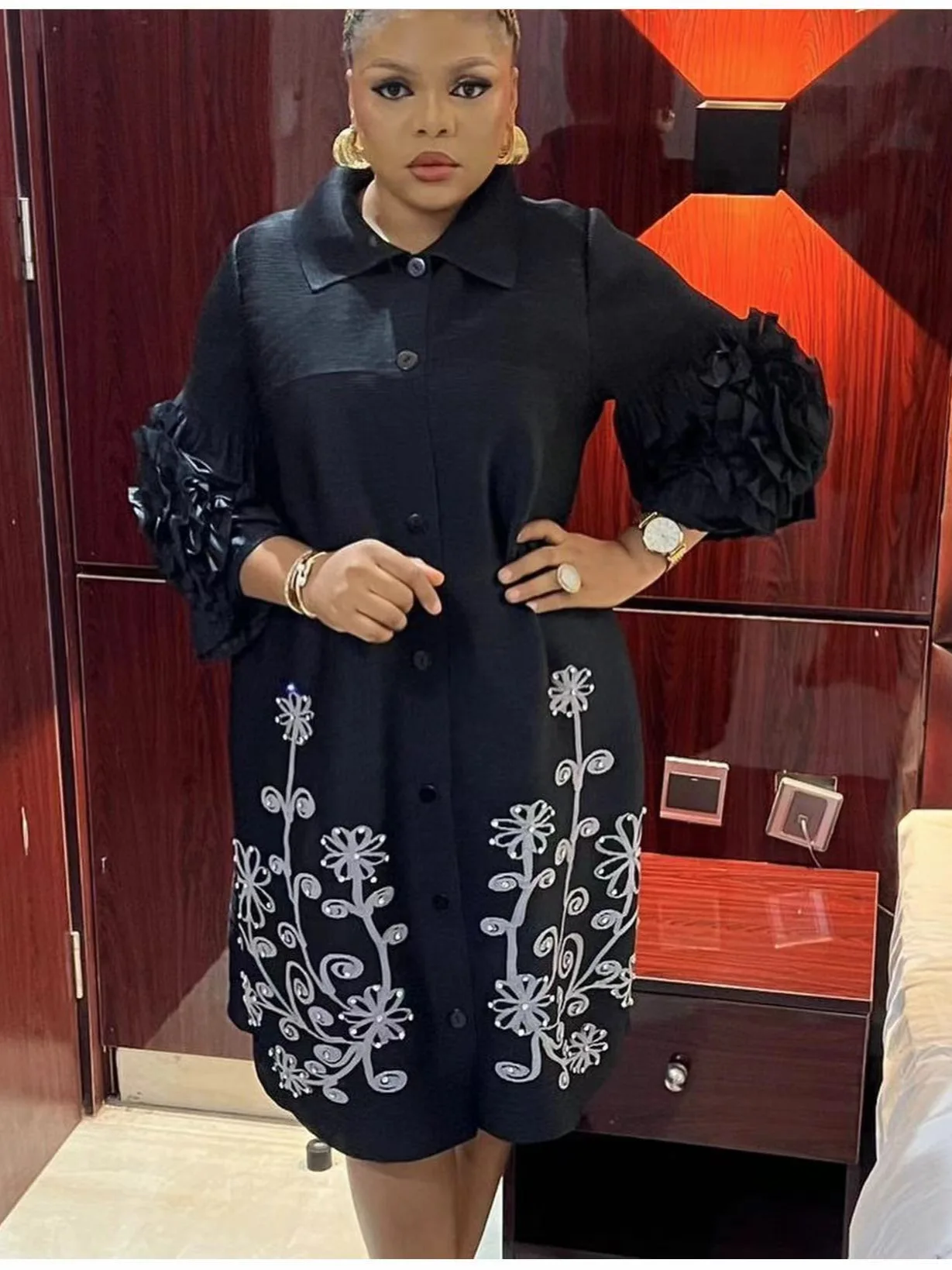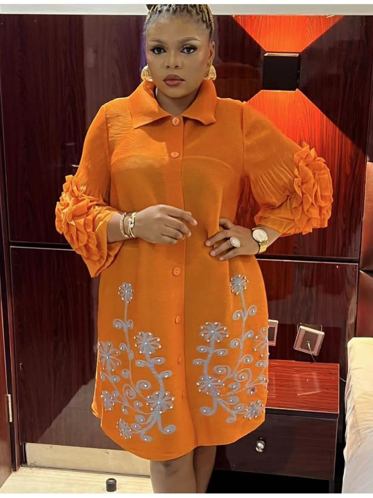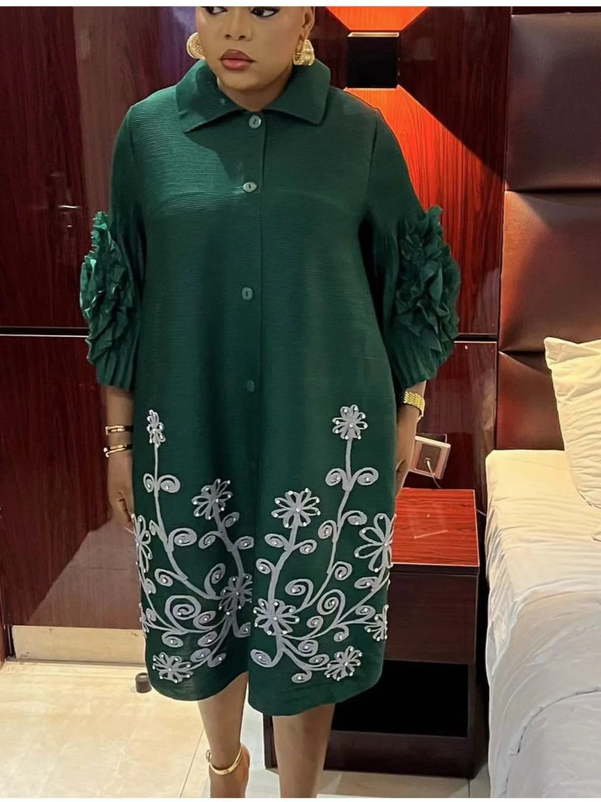 Miyake Pleated Dress with Turned-up Collar Hand-woven Sequined Floral Print Long Dress