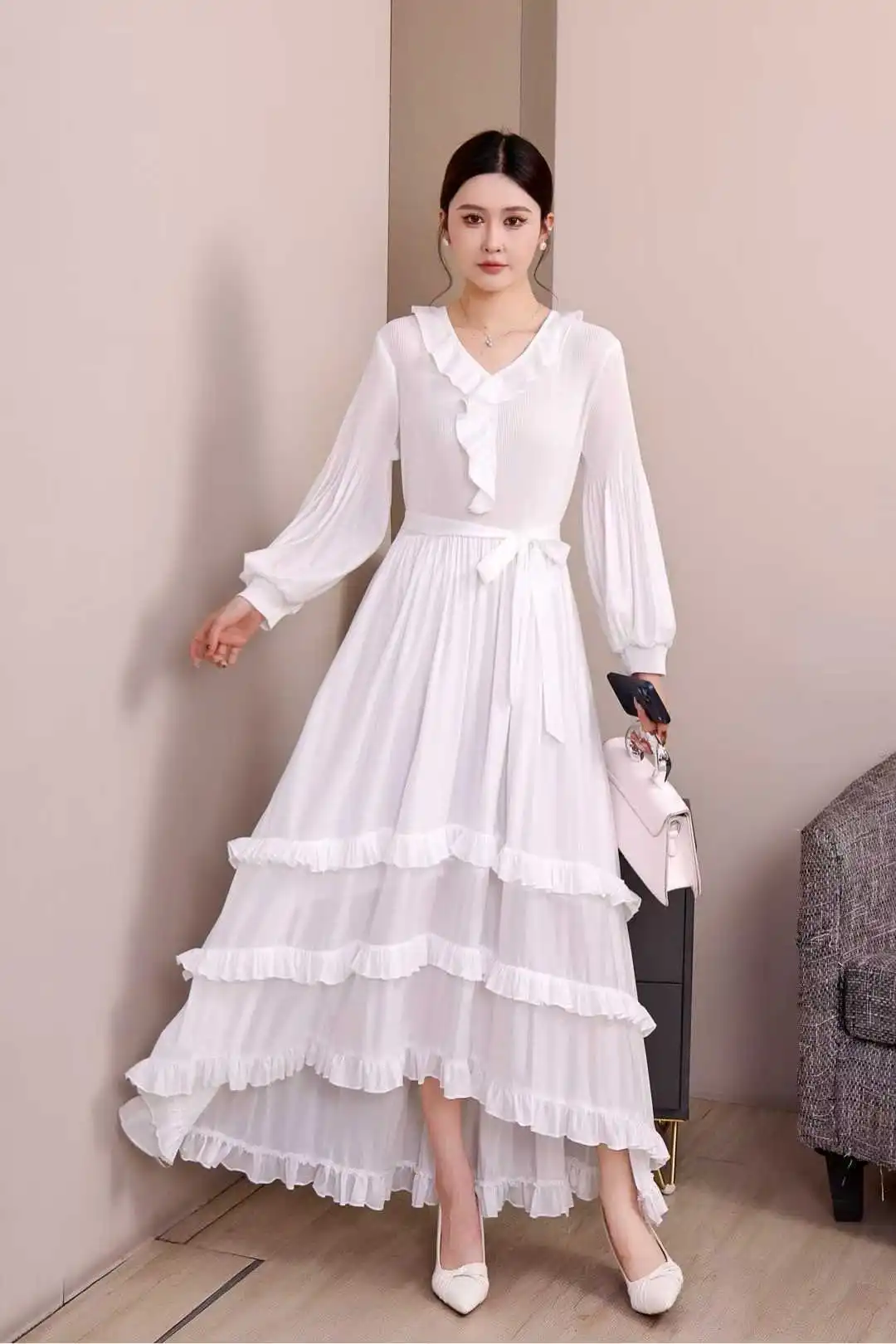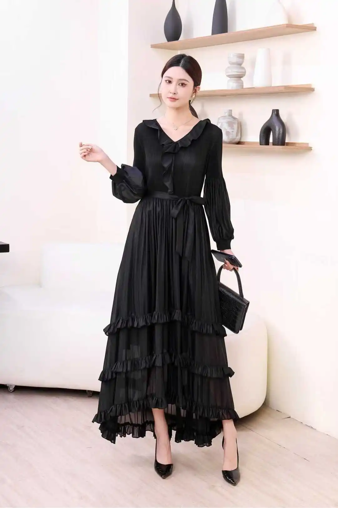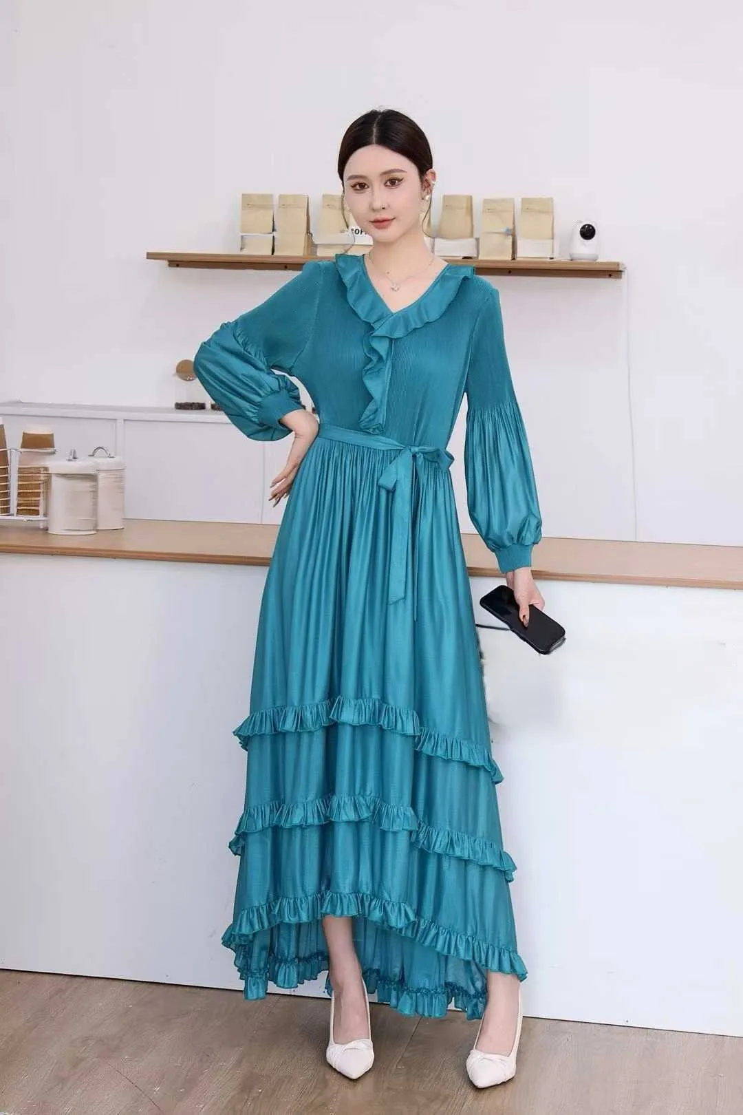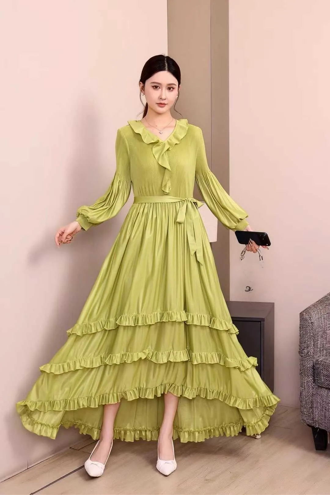 Big Size Ruffled V-neck Pleated Dress with Waist Tie and Layered Design - Elegant Daily Date Wear Item