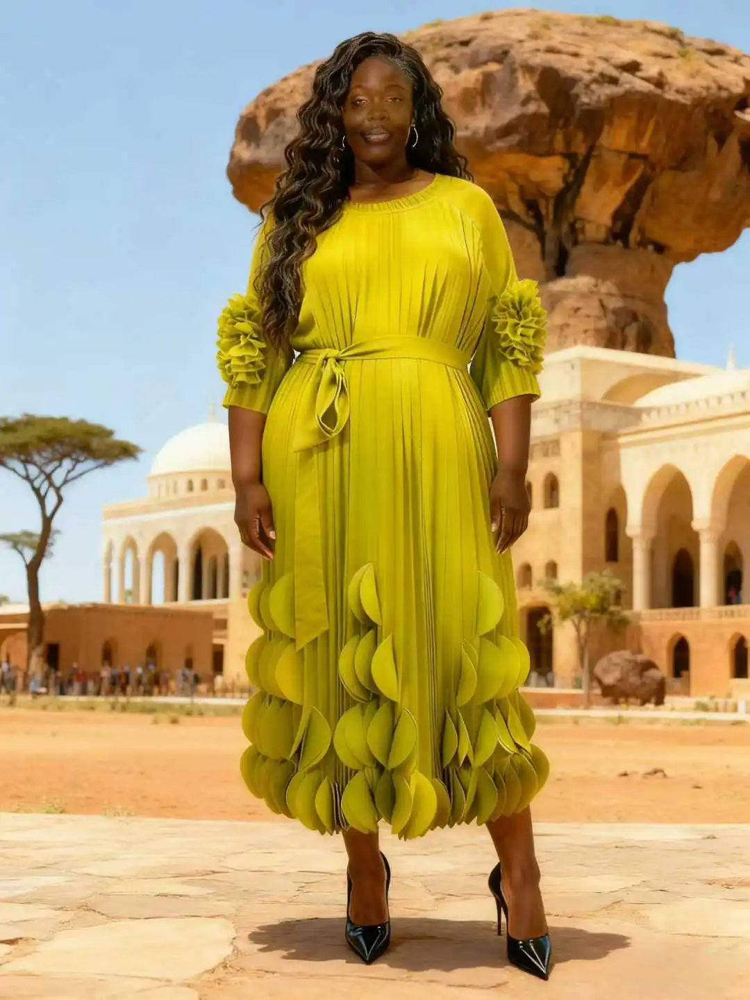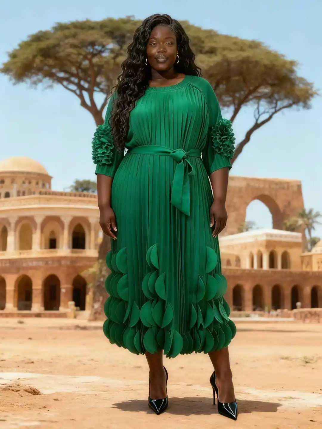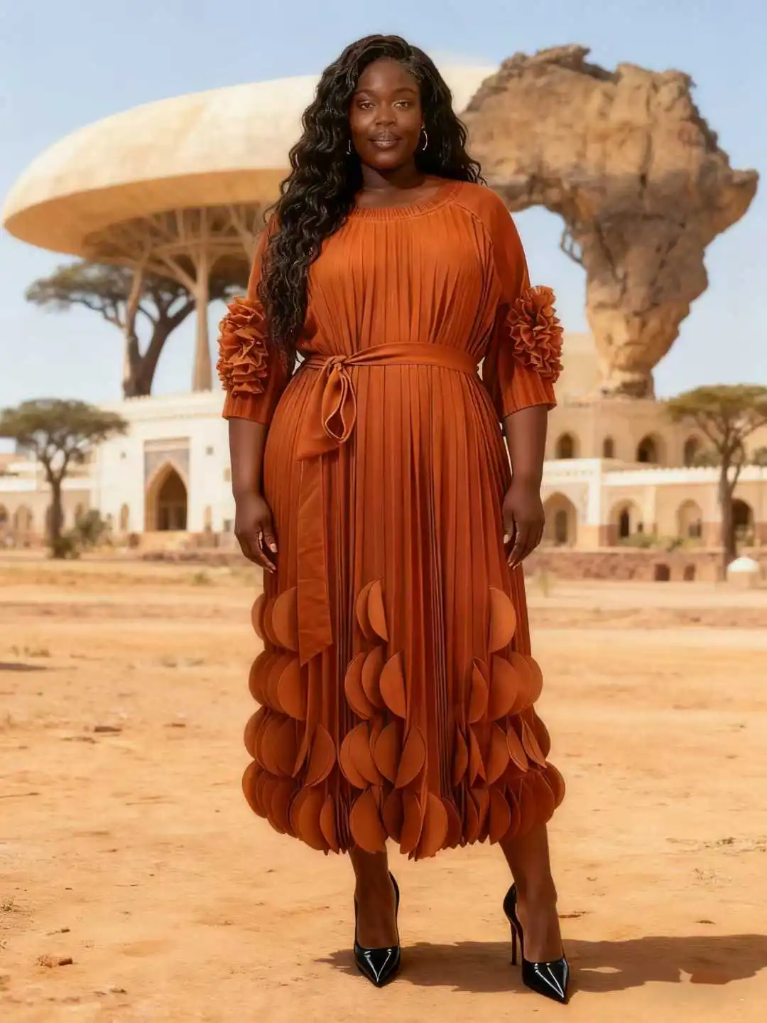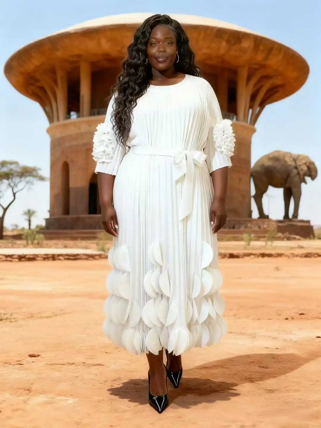 Plus Size Pleated Midi Dress with 3D Details | Fashion-forward Daily Occasion Wear