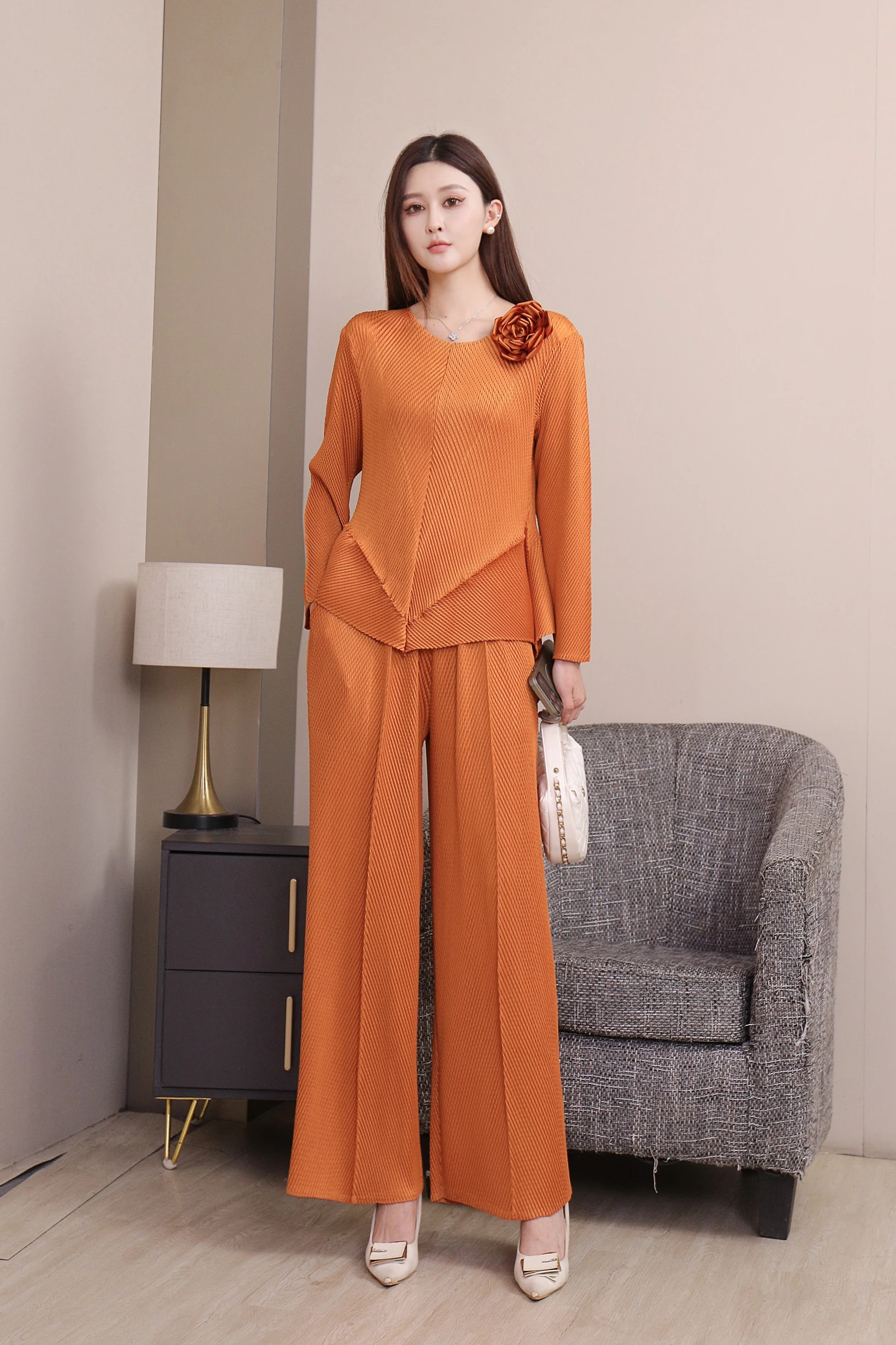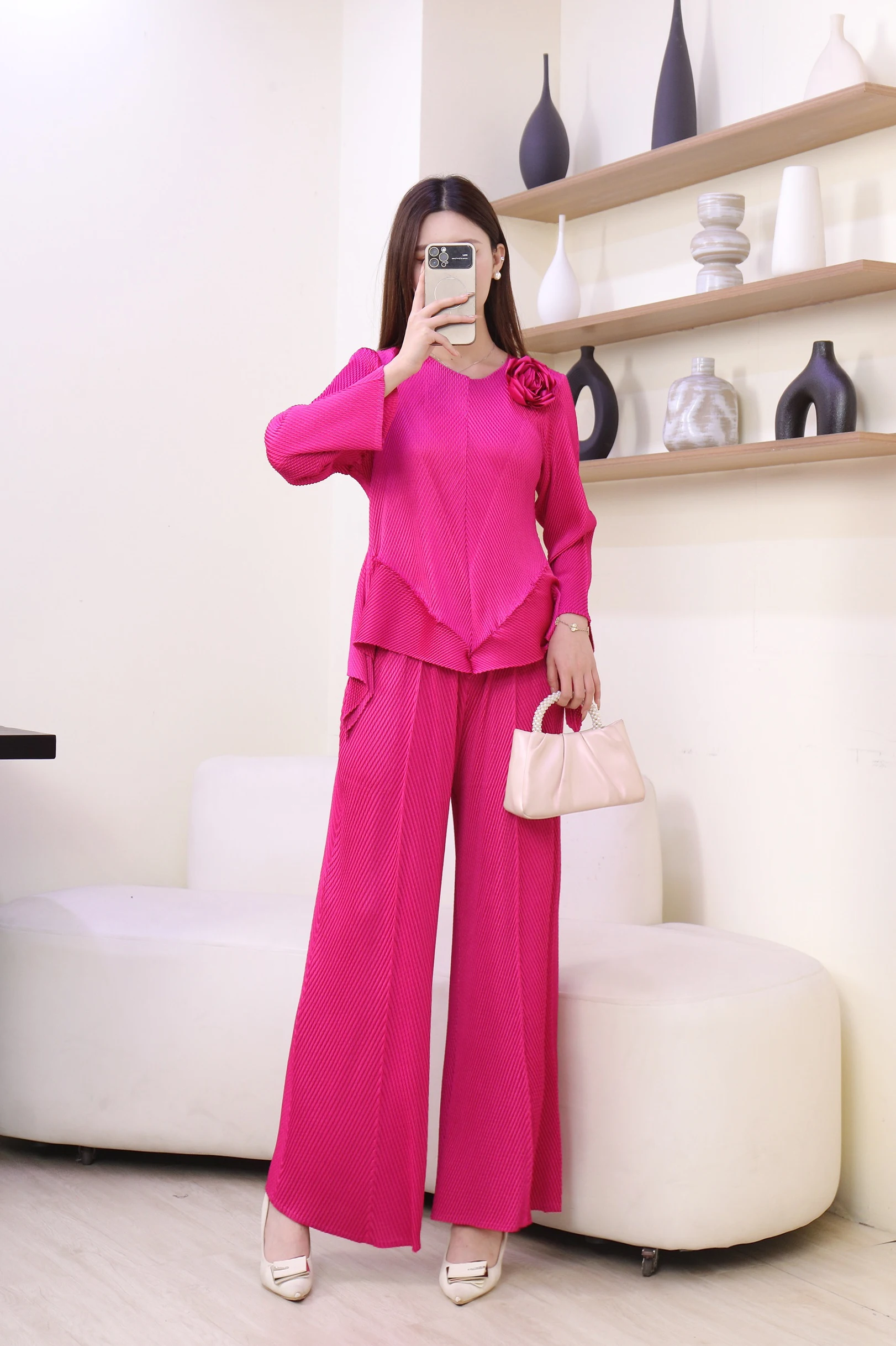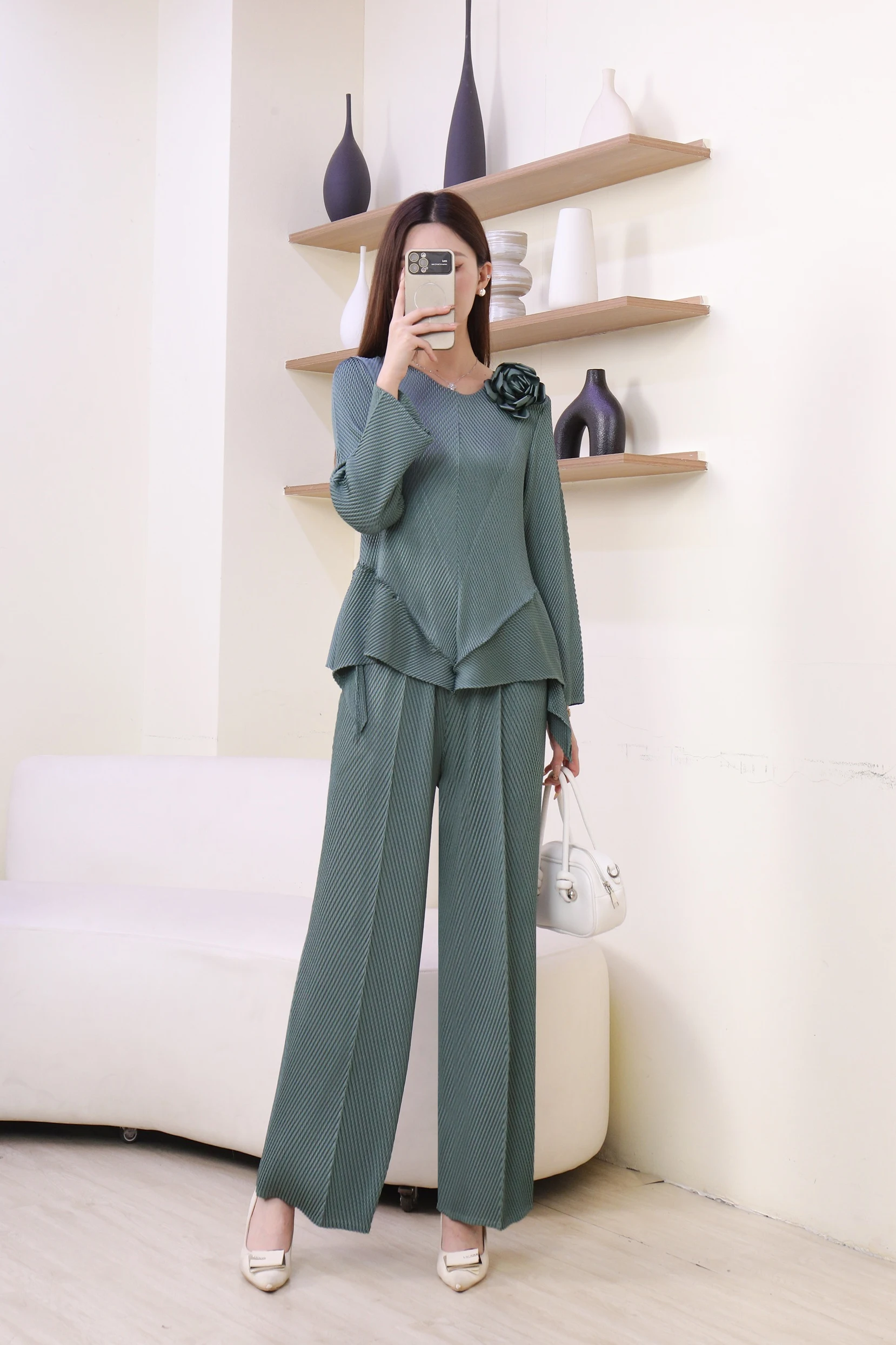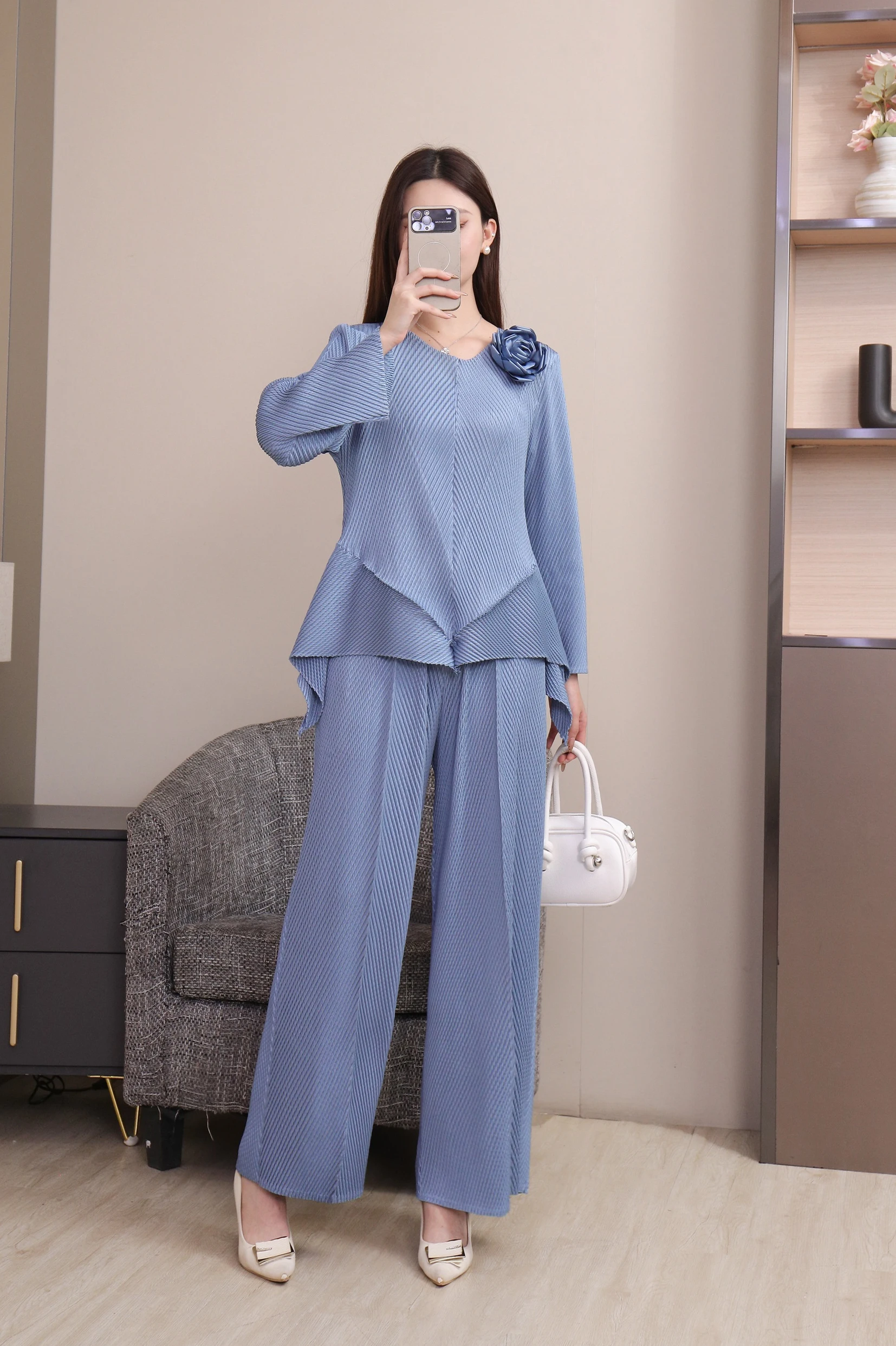 European and American Large-size Women's Two-piece Solid-color Elegant Business Fish-scale Miyake Pleated Suit Set