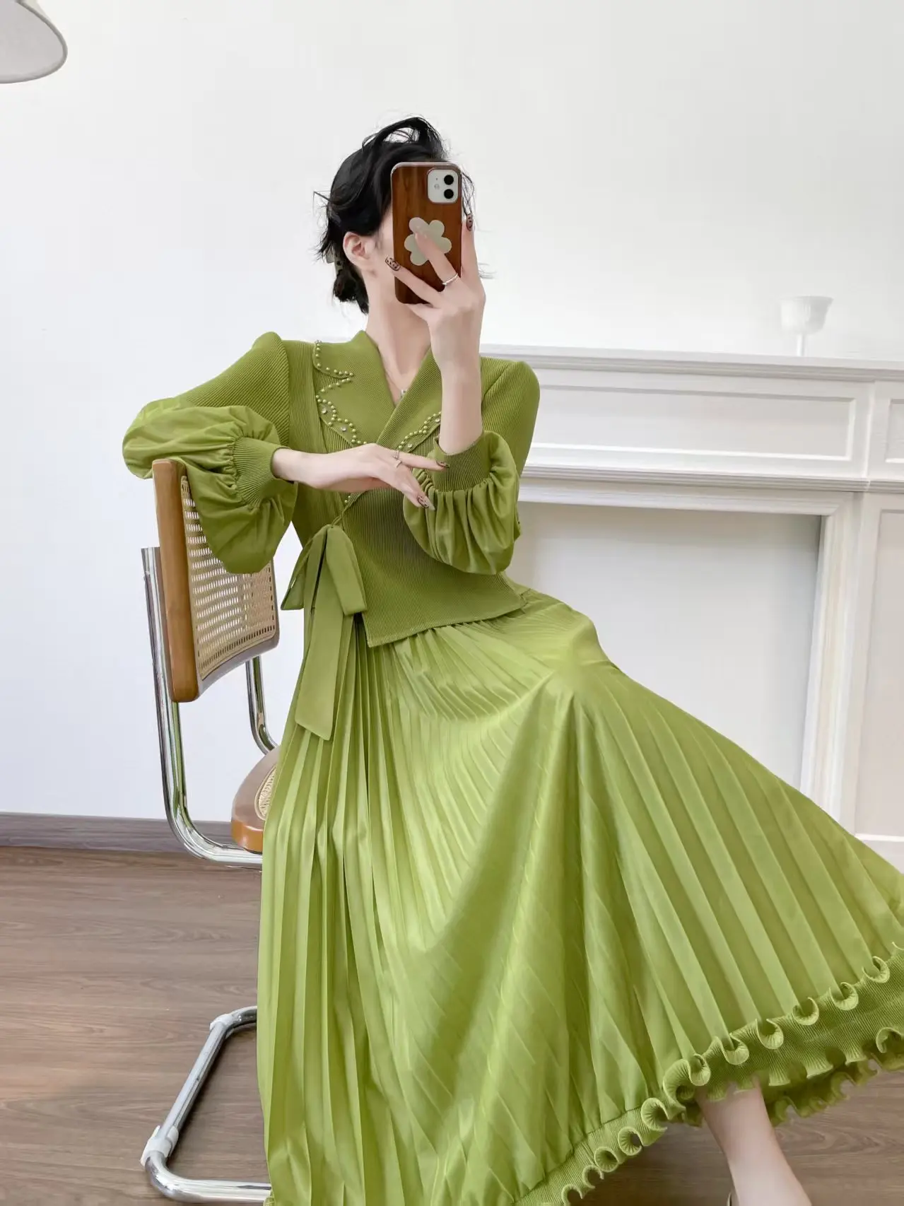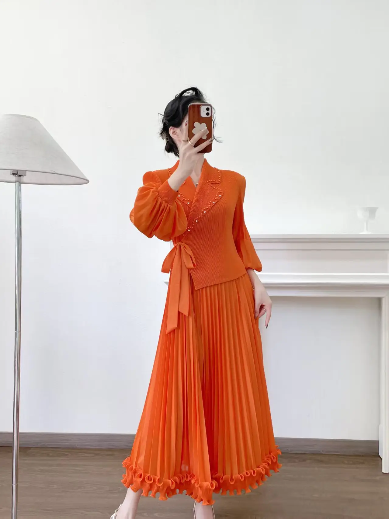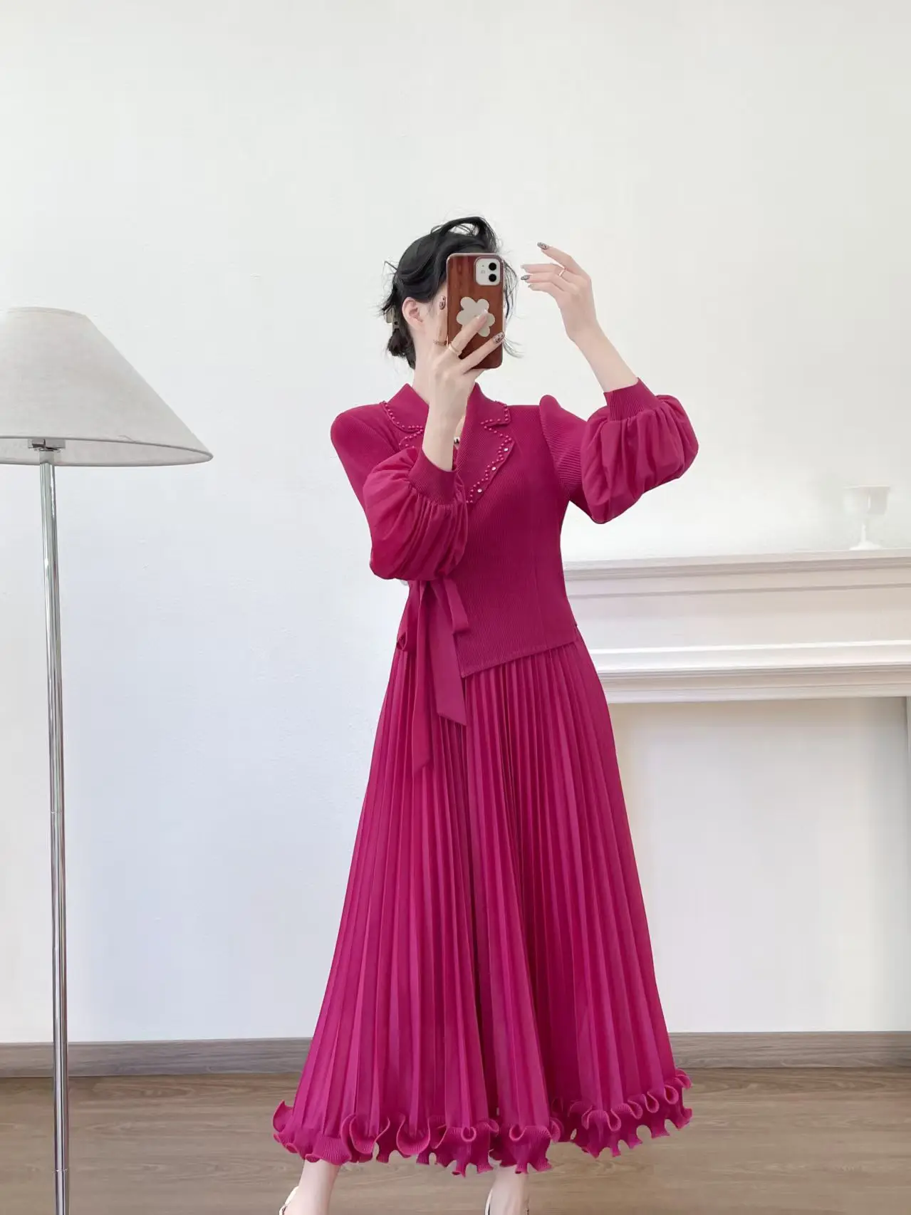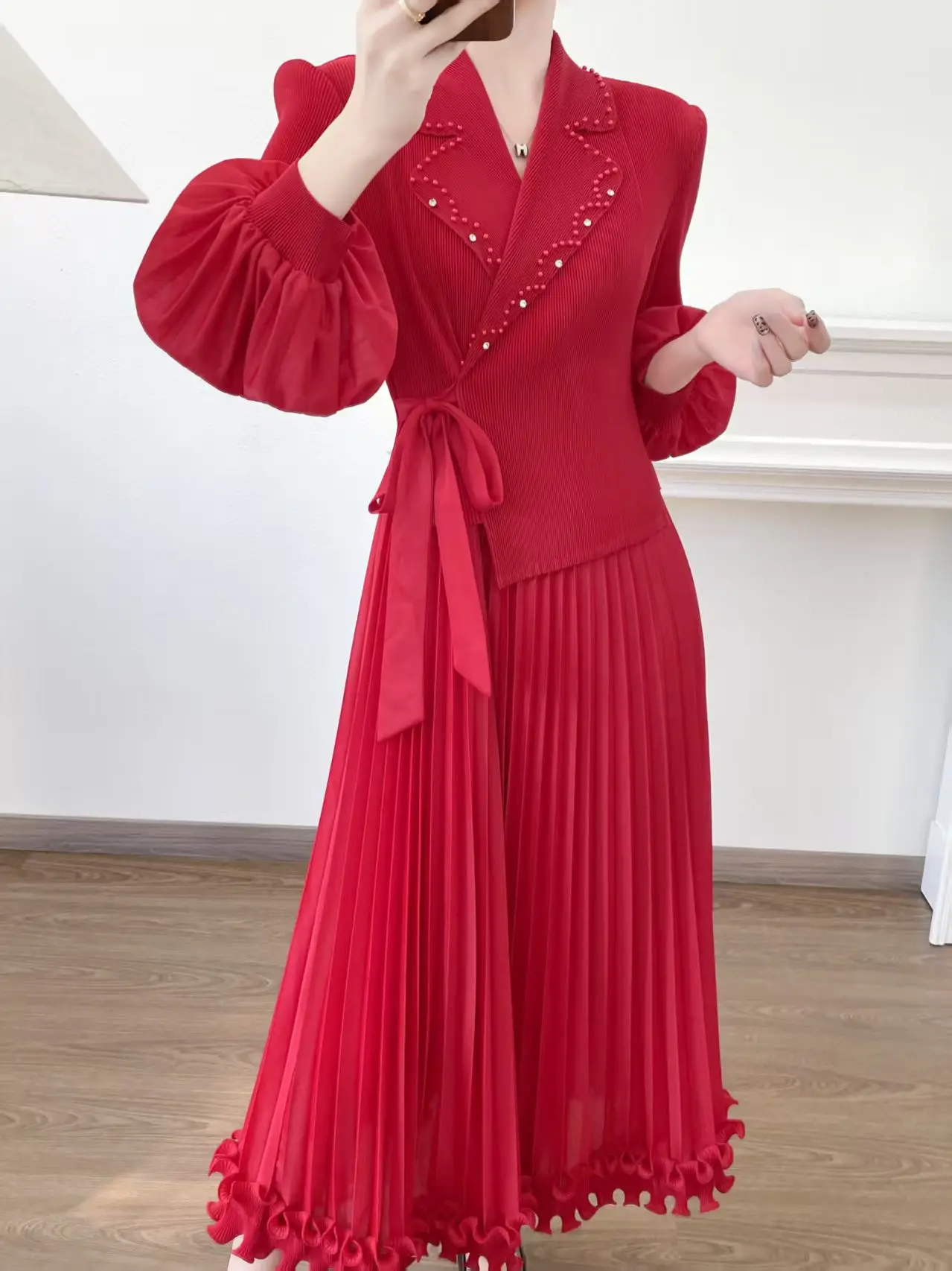 Extra-large Size Pleated Dress for Wholesale Miyake Dress with a Collar and Frilly Sleeves