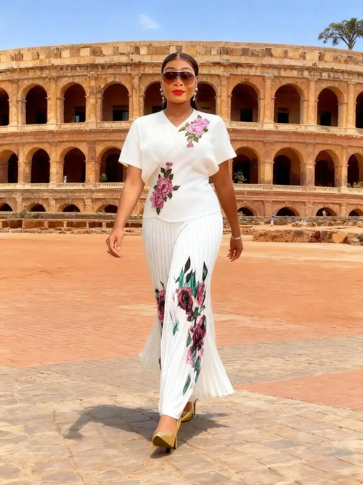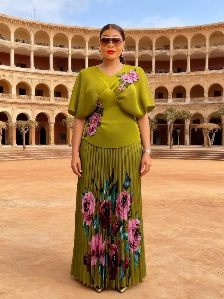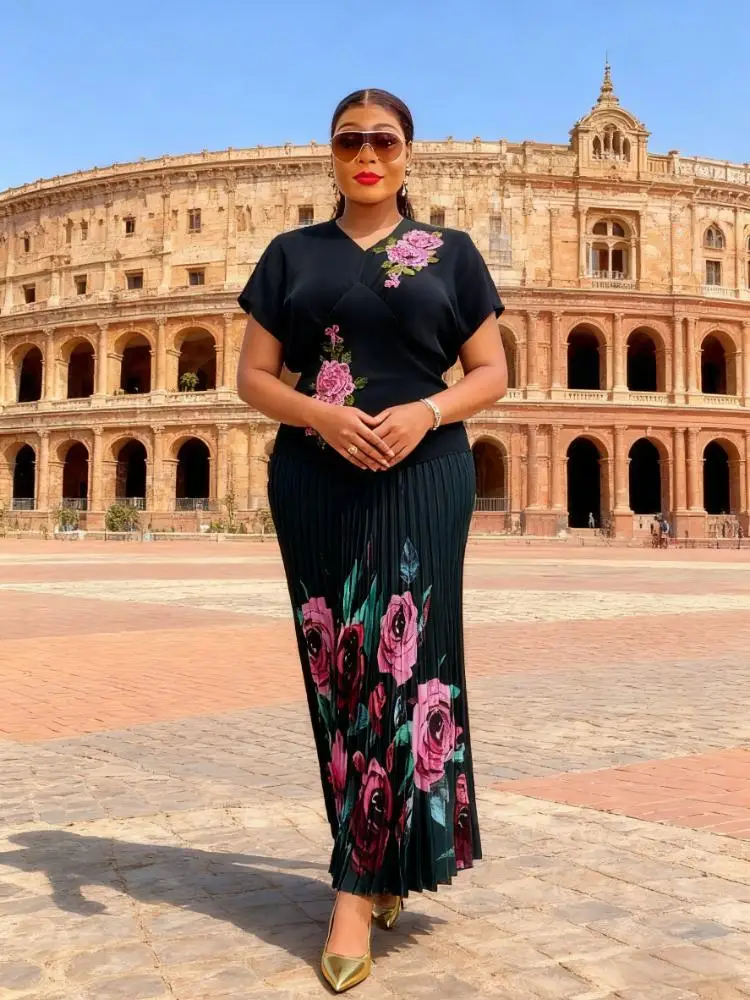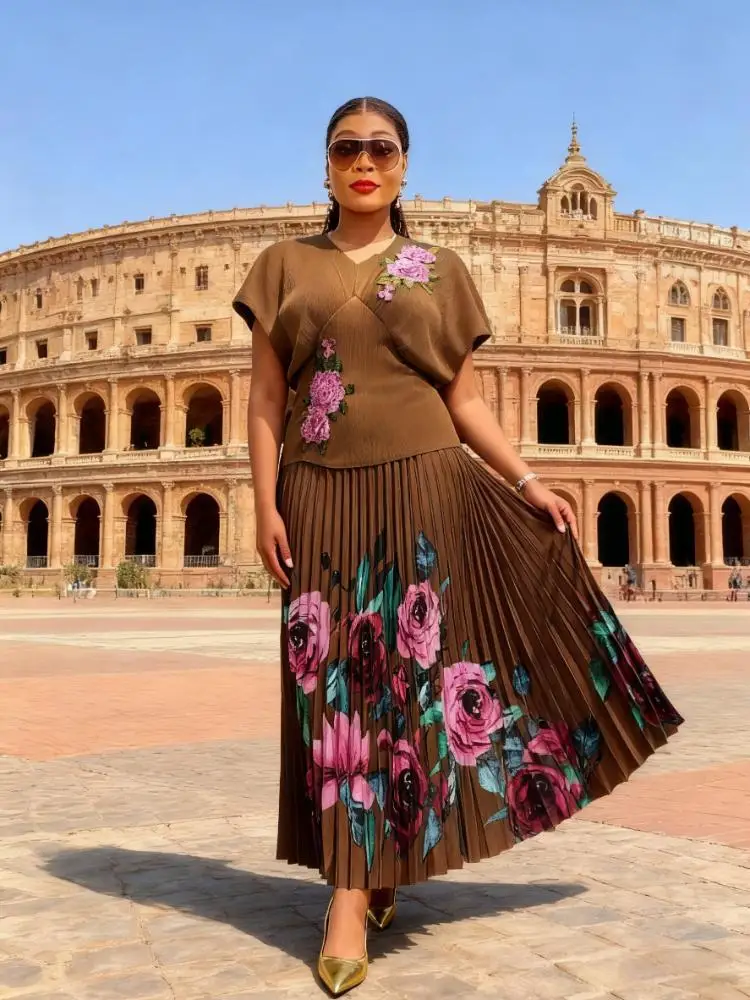 European and American Large-size Women's Blouses Paired with Skirts - Fashionable Printed Pleated Sets