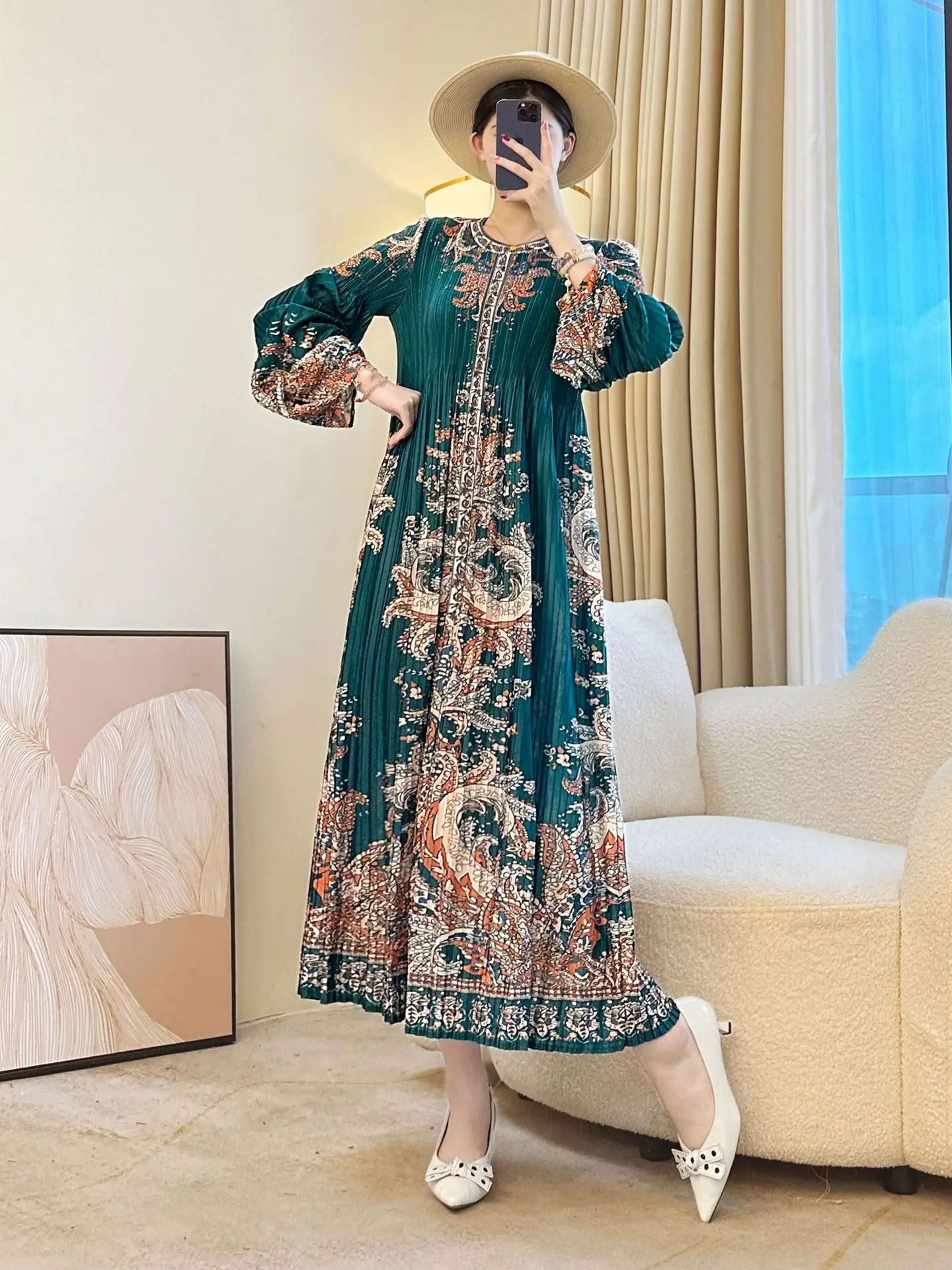 High-end Vintage Pleated Long Dress Manufacturer - Wholesale Chinese Round-neck Long-sleeved Loose Dress