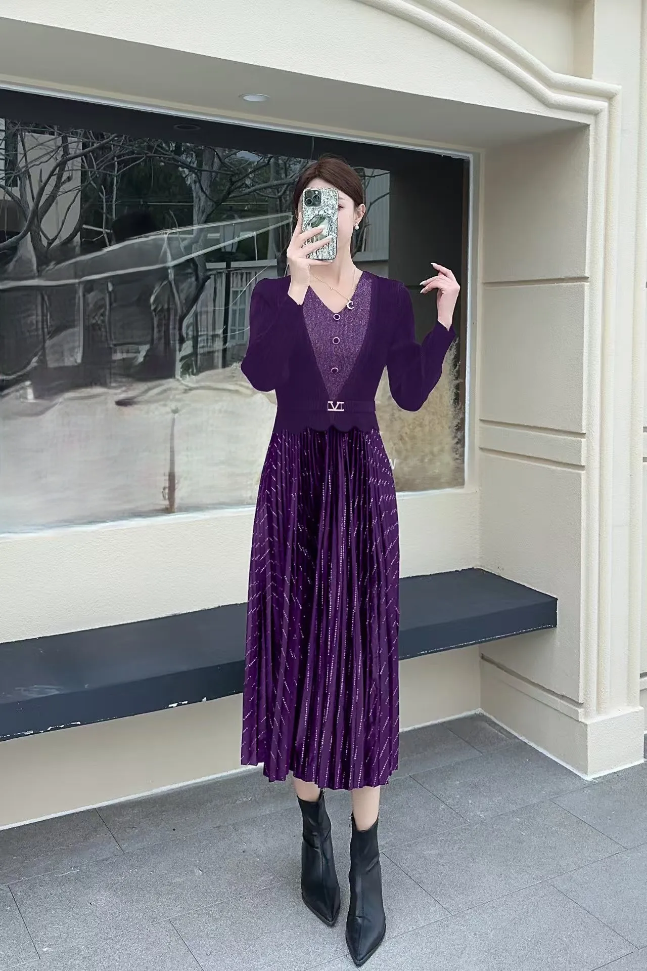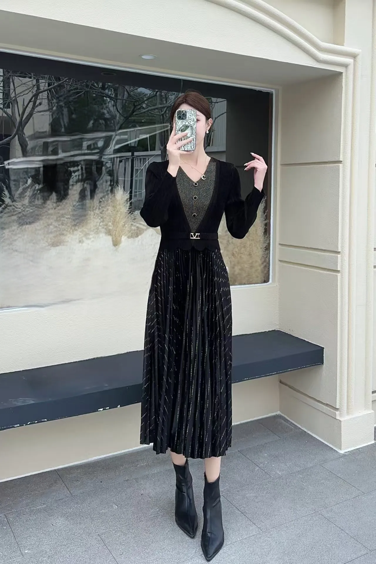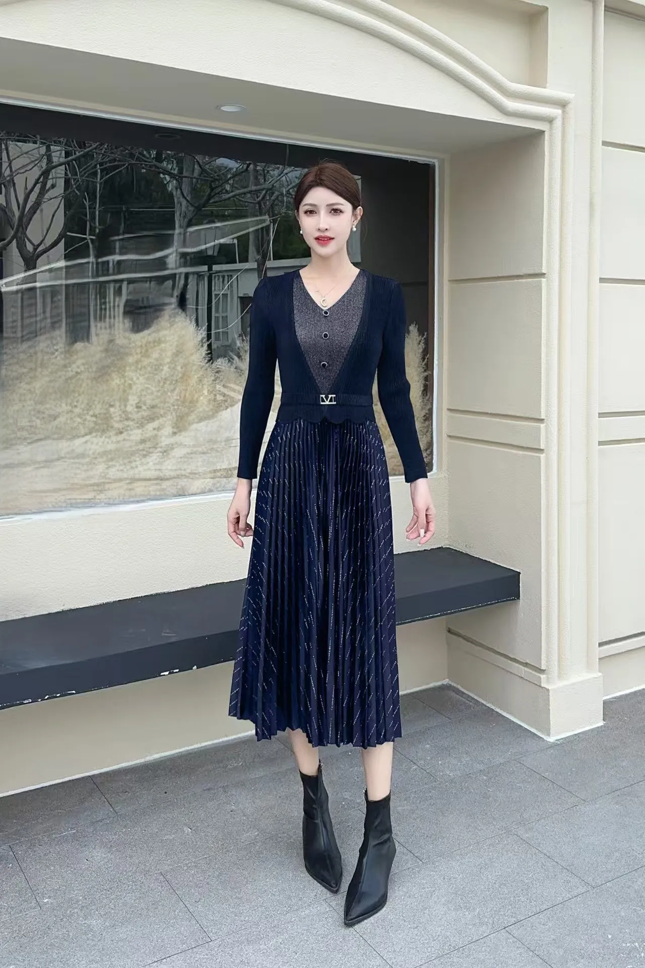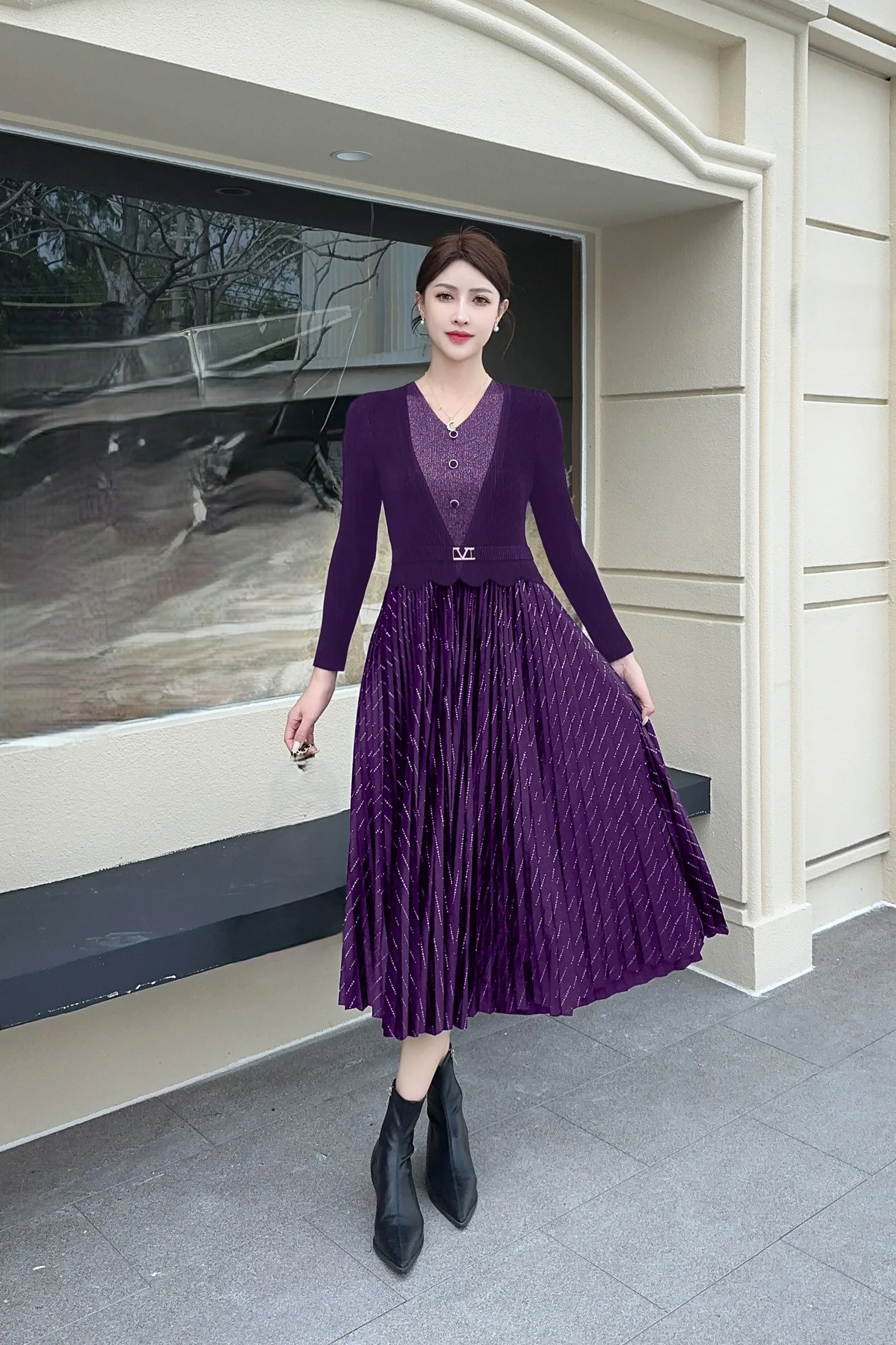 European-style Plus-size Pleated Dress with Ample Elasticity for a Fitted Look, Suitable for Professional Wear for Ladies