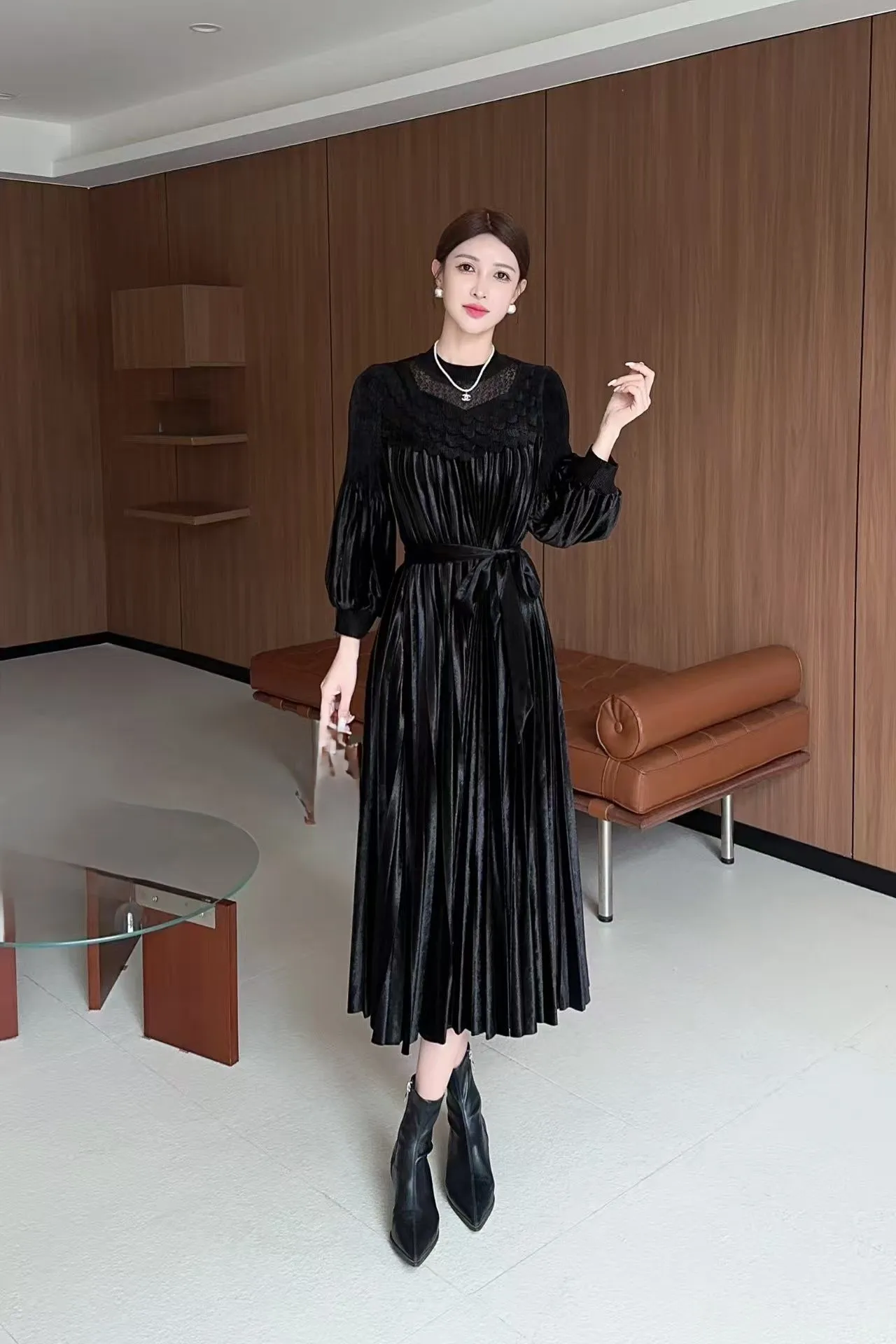 ZYHT 21541 Wholesale Crew Neck High Waist Casual Dresses Elegant Lace Velvet Mermaid Hem Ruched Long Sleeve Dresses for Women
