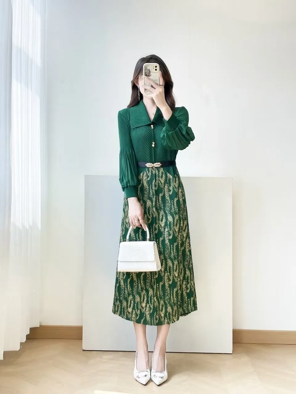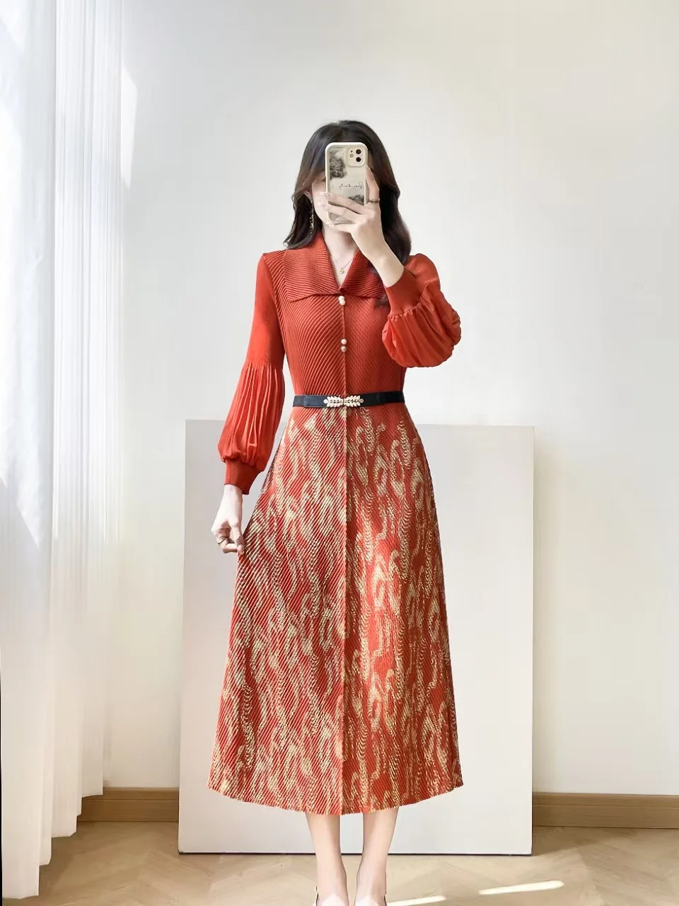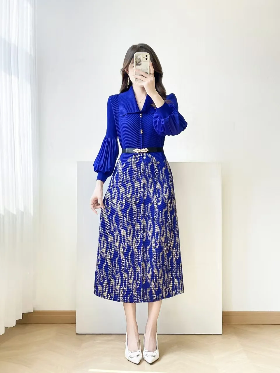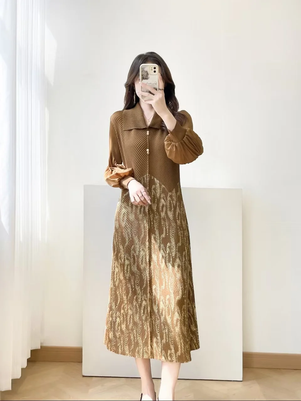Casual Plus-size Dress Manufacturer - Collarless Lantern Sleeve Dress with Gold Embossing and Pleated Dress