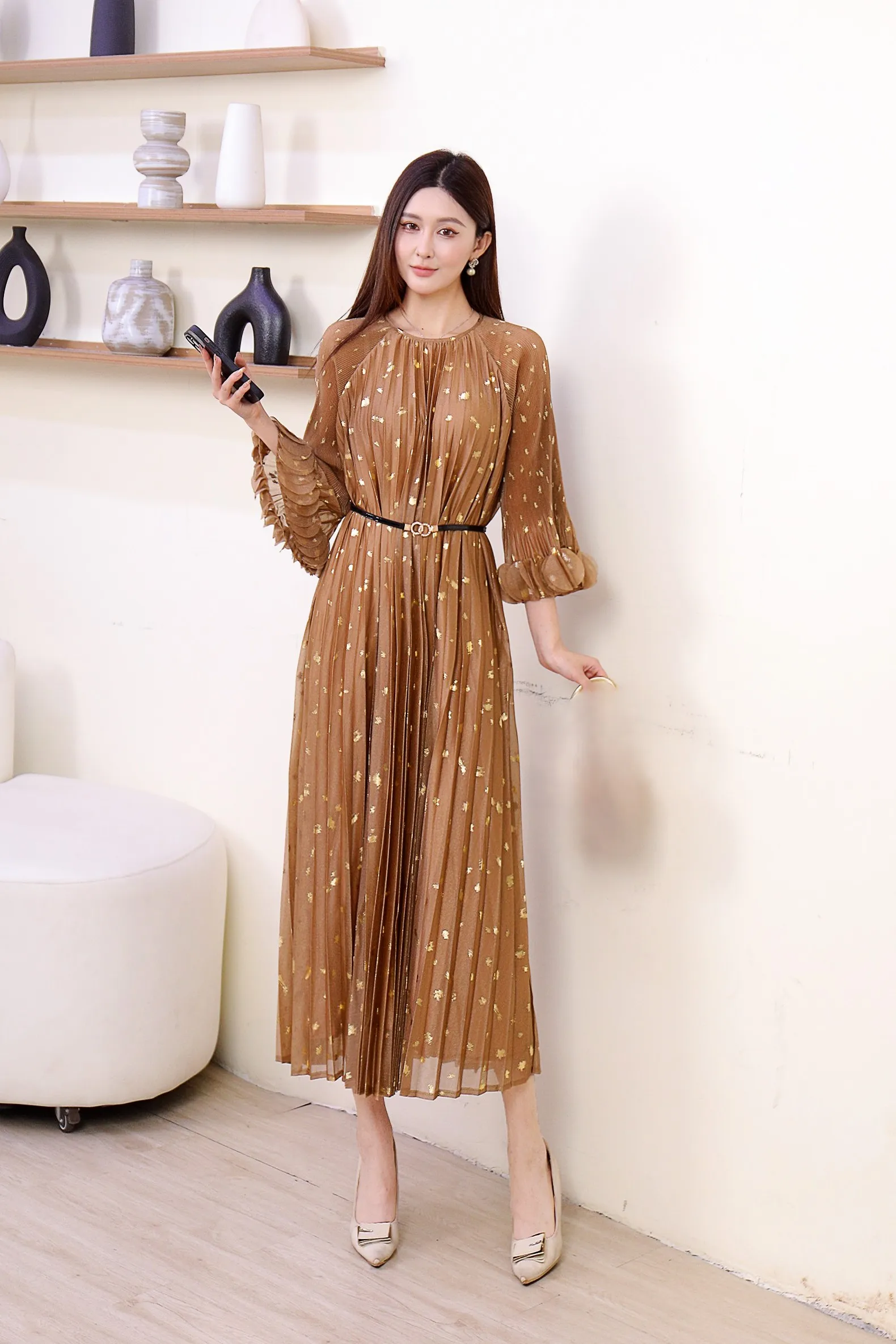 ZYHT 21541 Wholesale Crew Neck High Waist Casual Dresses Elegant Lace Velvet Mermaid Hem Ruched Long Sleeve Dresses for Women