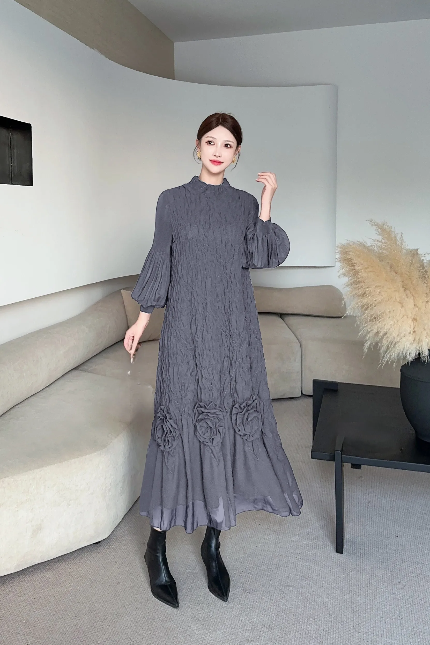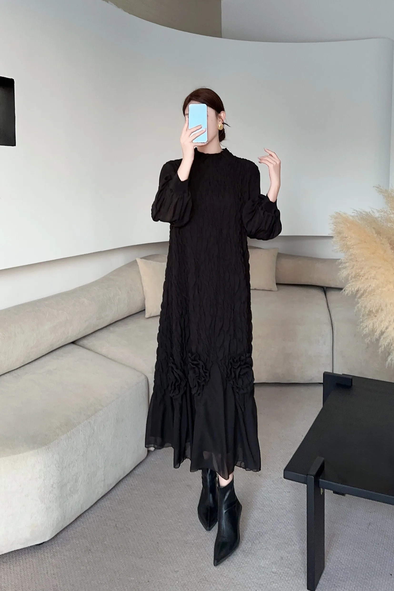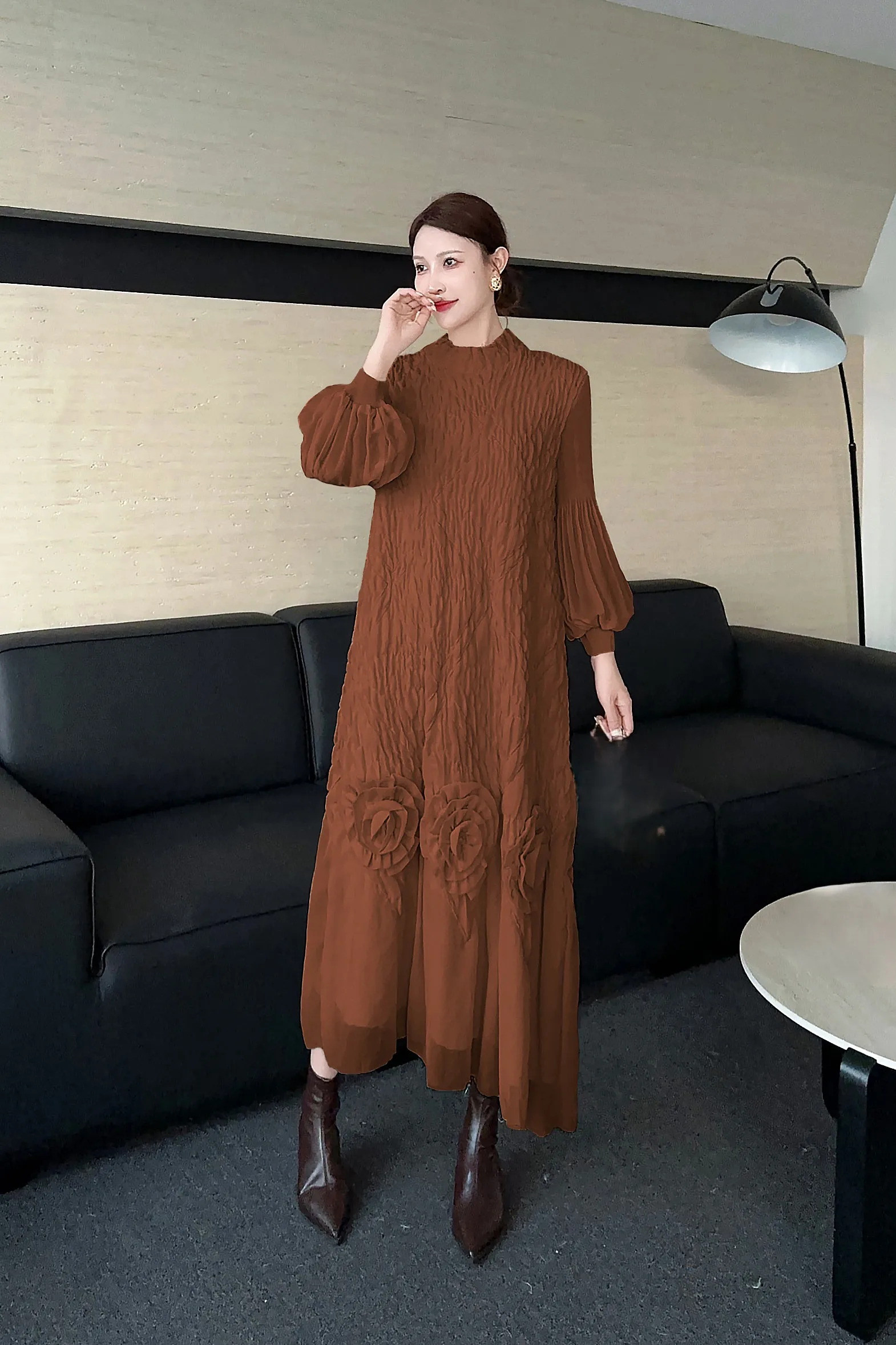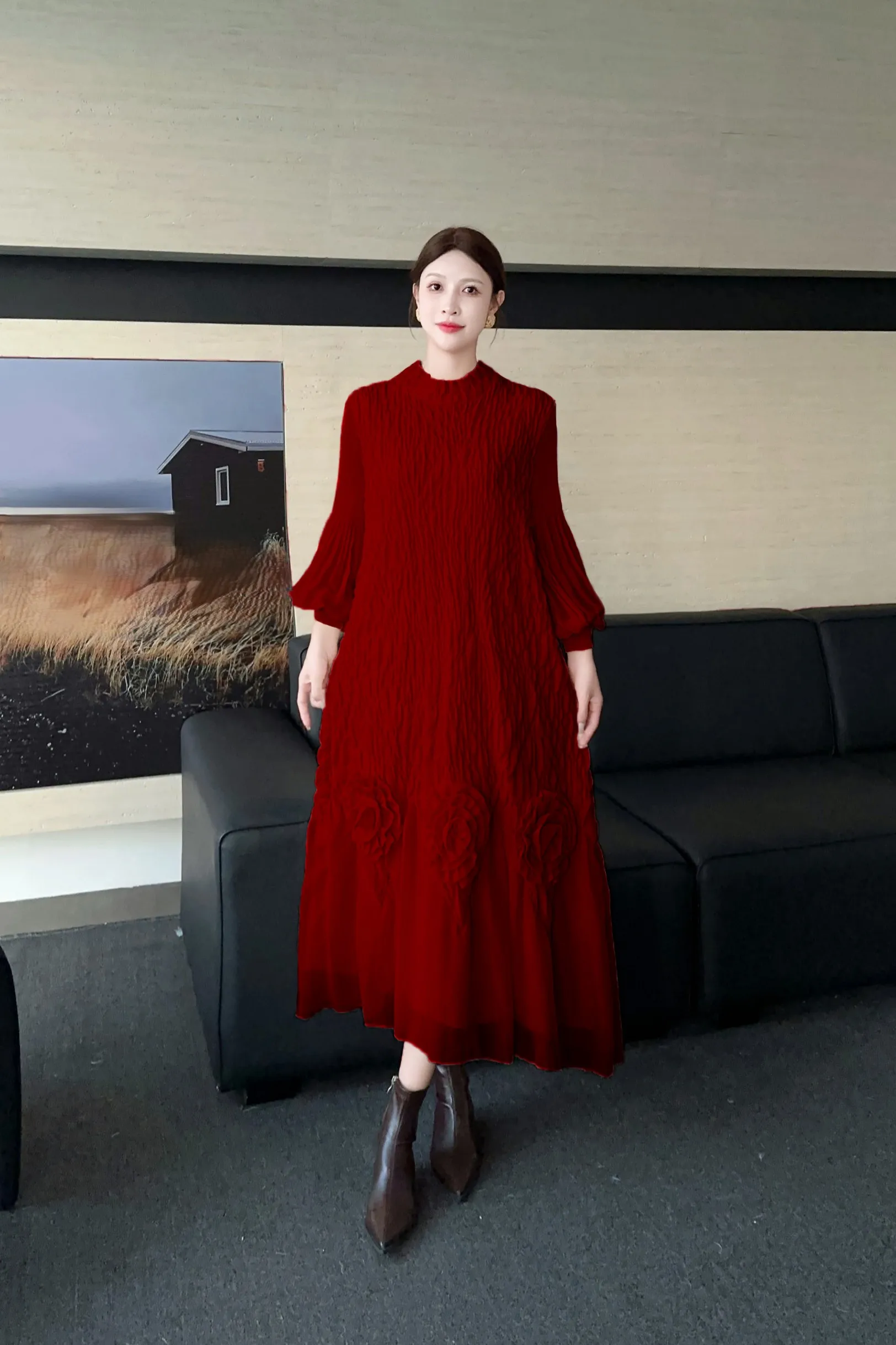 ZYHT 21541 Wholesale Crew Neck High Waist Casual Dresses Elegant Lace Velvet Mermaid Hem Ruched Long Sleeve Dresses for Women