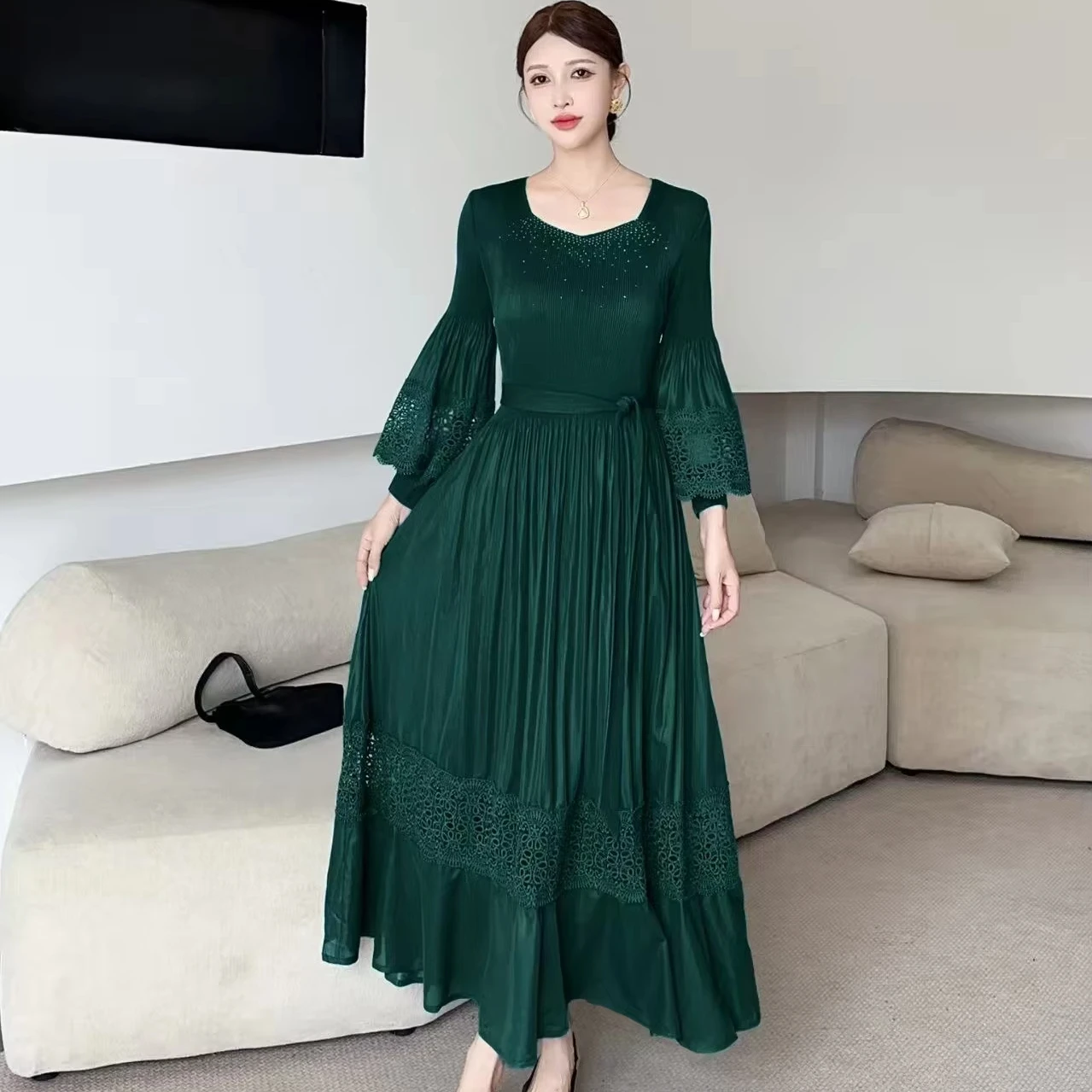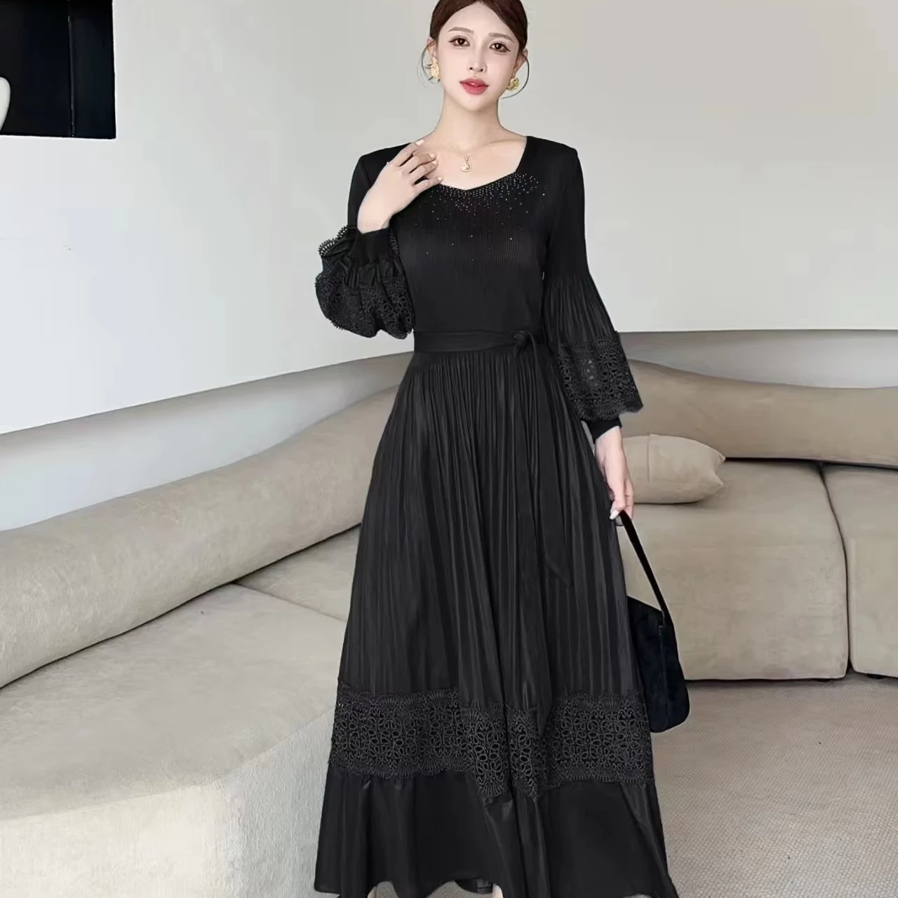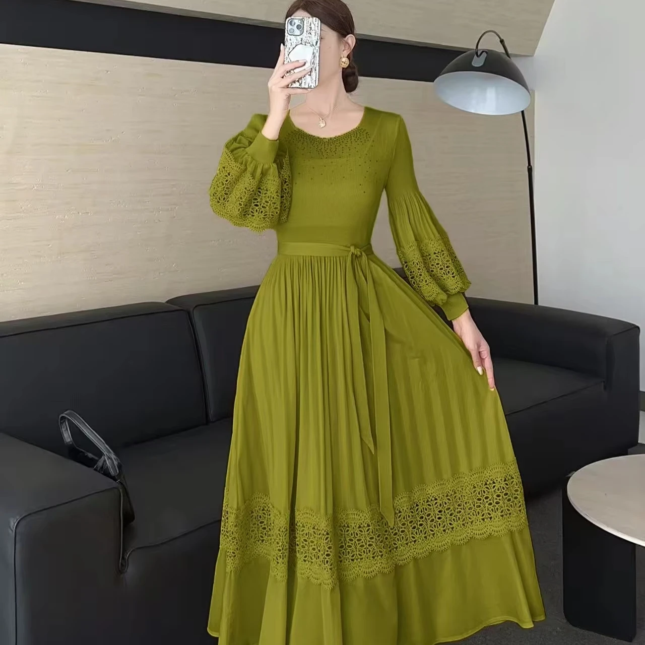 ZYHT 21541 Wholesale Crew Neck High Waist Casual Dresses Elegant Lace Velvet Mermaid Hem Ruched Long Sleeve Dresses for Women