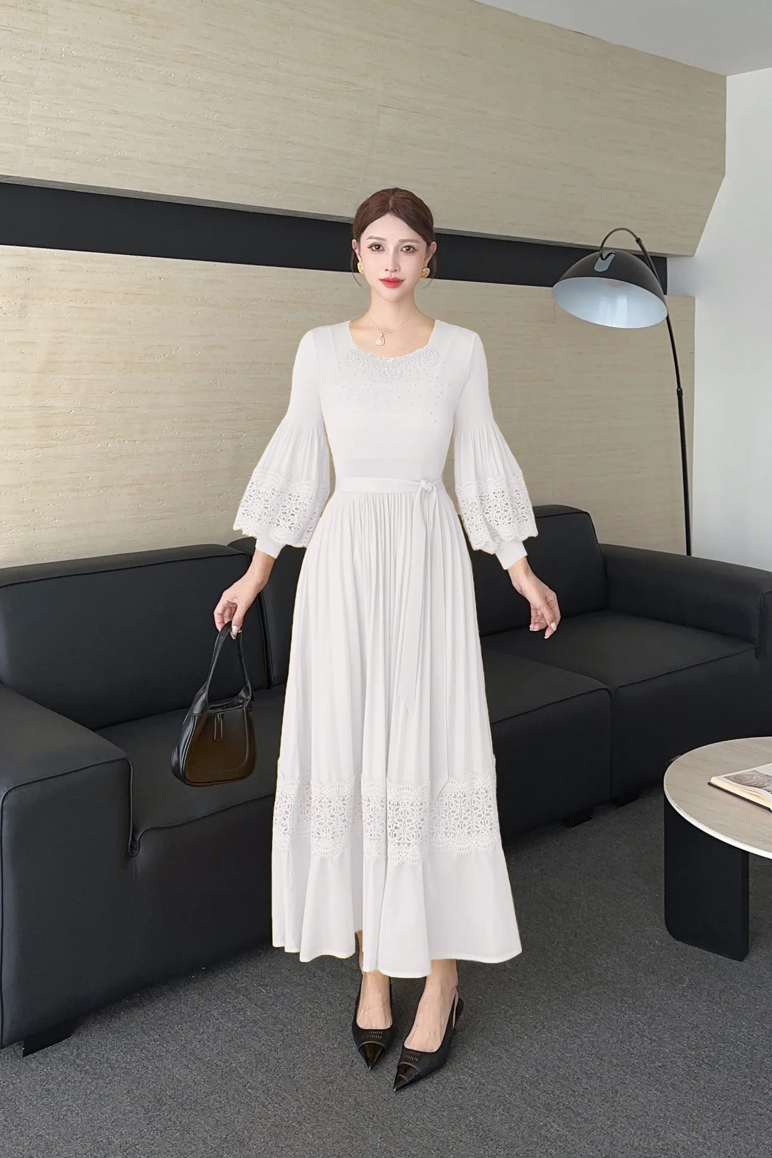 ZYHT 15325 Wholesale Spring Trendy Fashion Long Sleeve Dinner White Lace Black Velvet Elegant Party Dress Women Evening Dresses