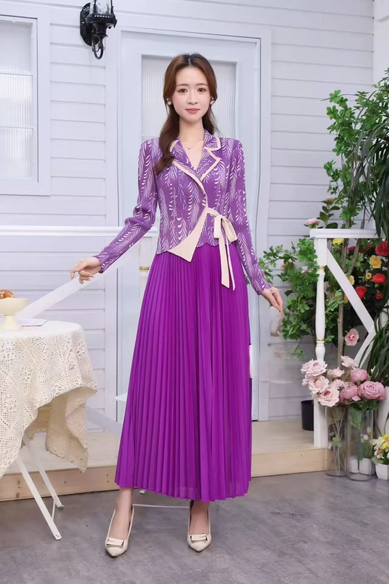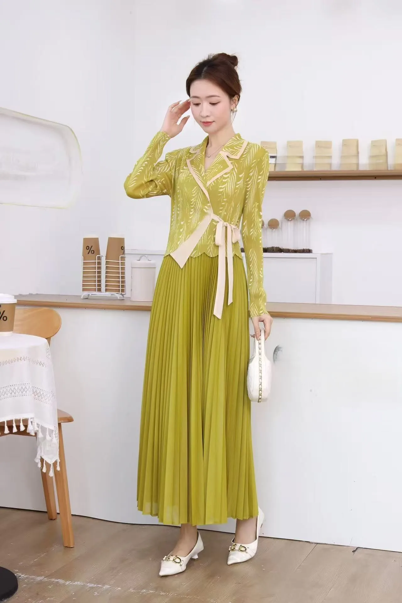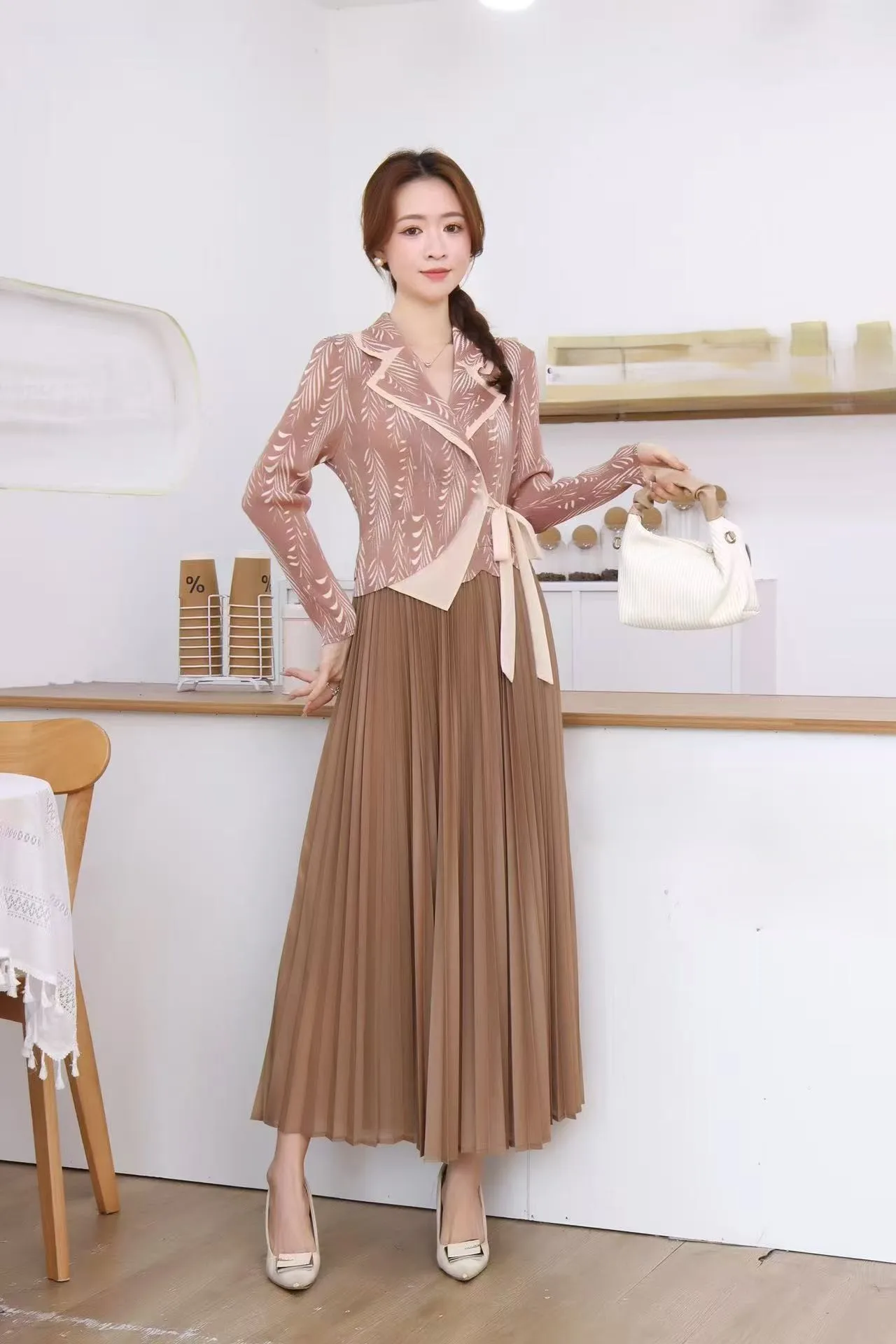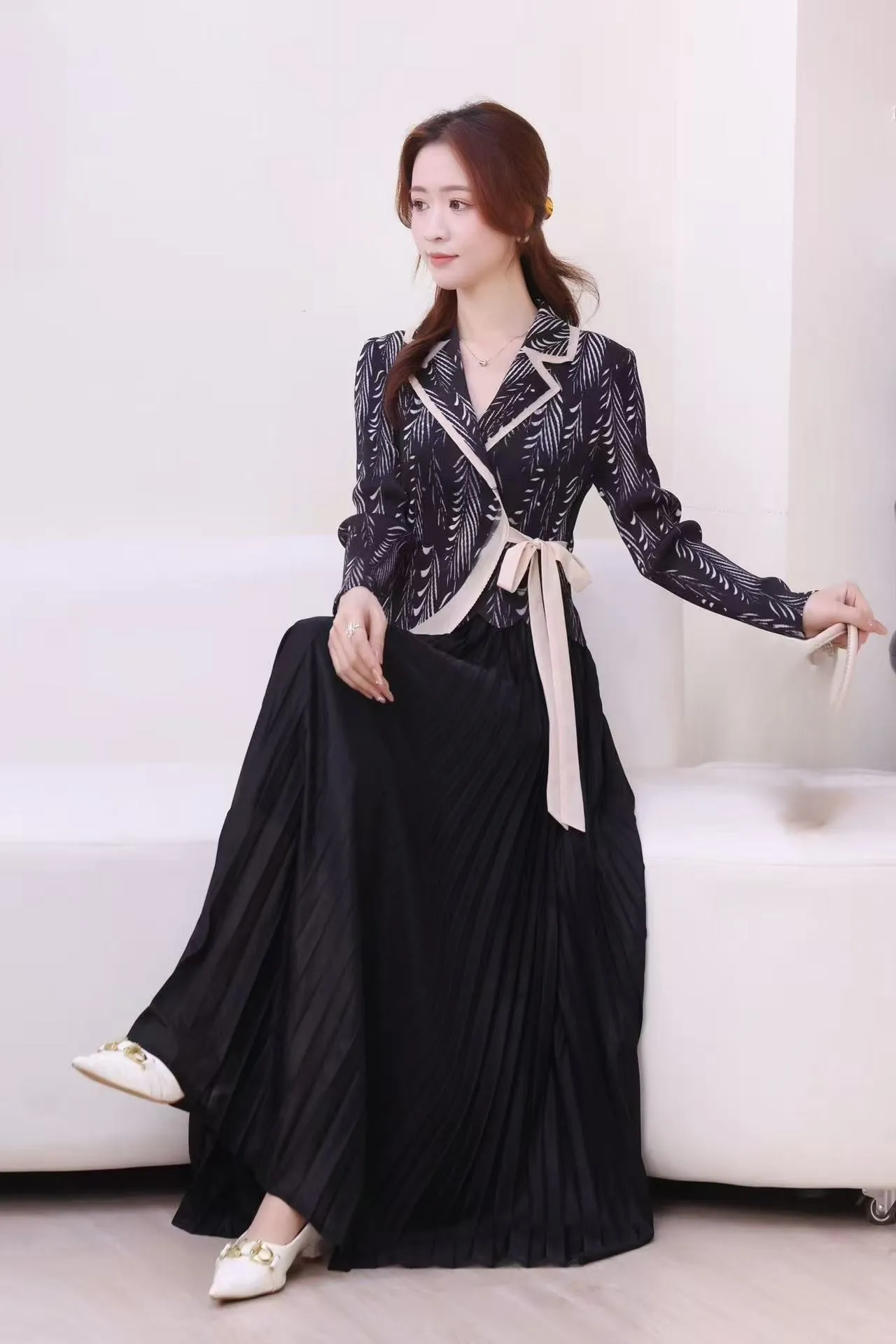 Stylish Women's Printed Lapel Long Sleeve Pleated Dress for Formal Daily Wear