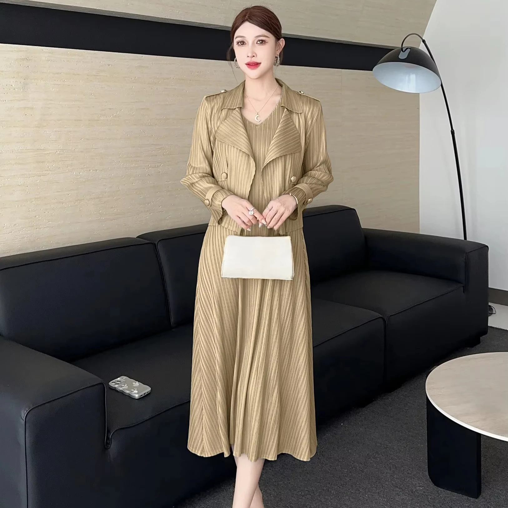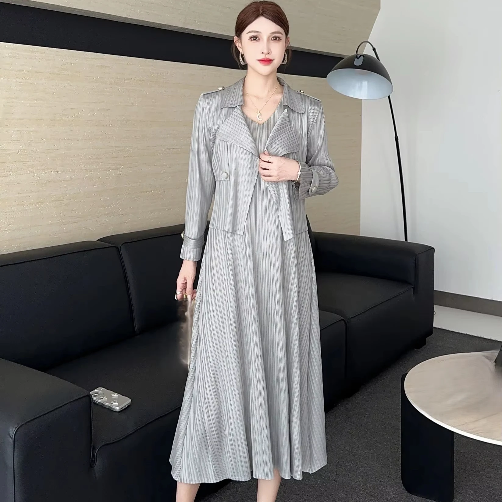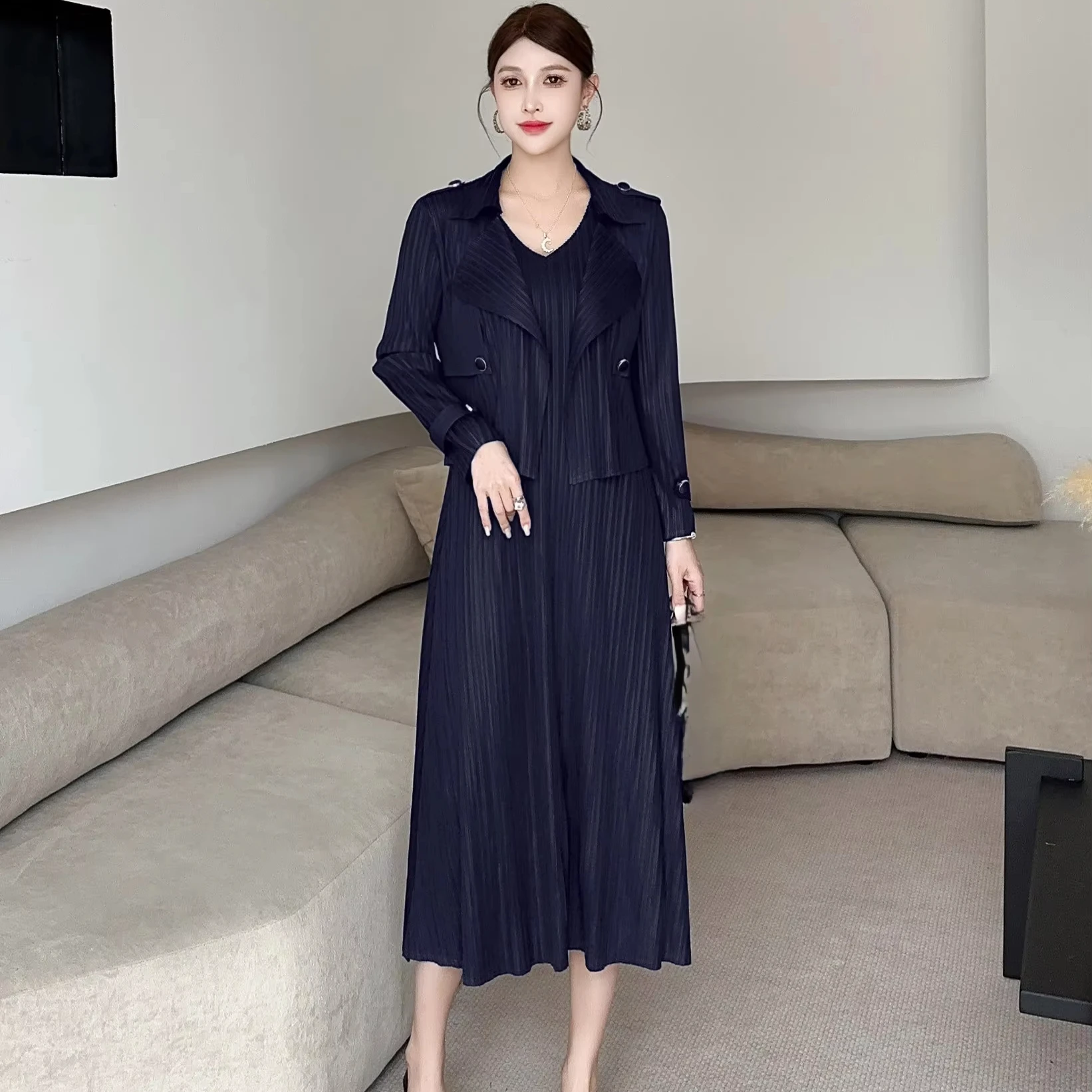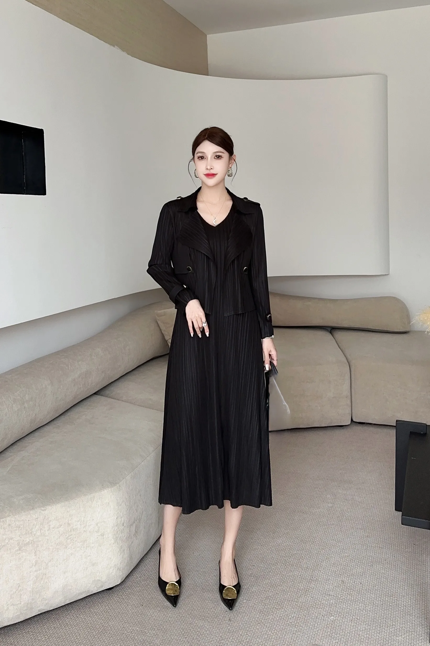 Women's Black Pleated Two - Piece Set: Trench Coat + Midi Dress for Elegant Occasions