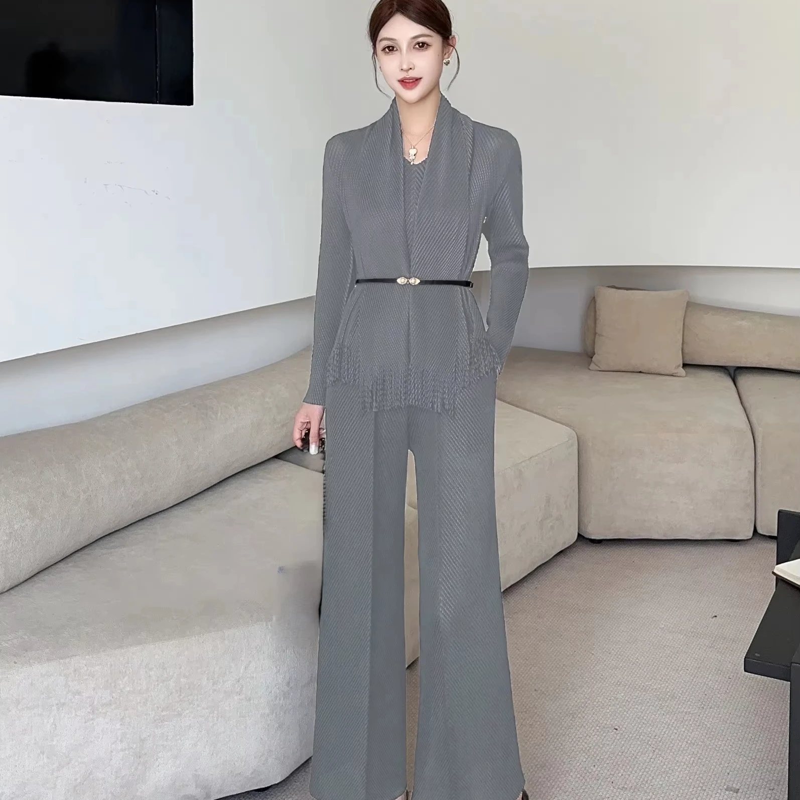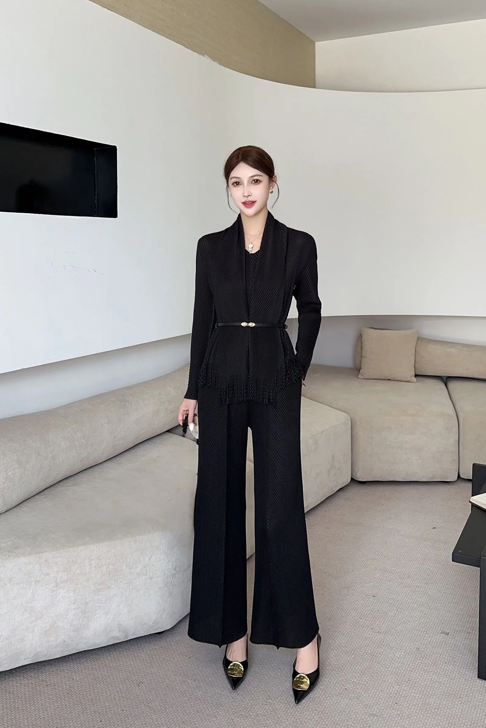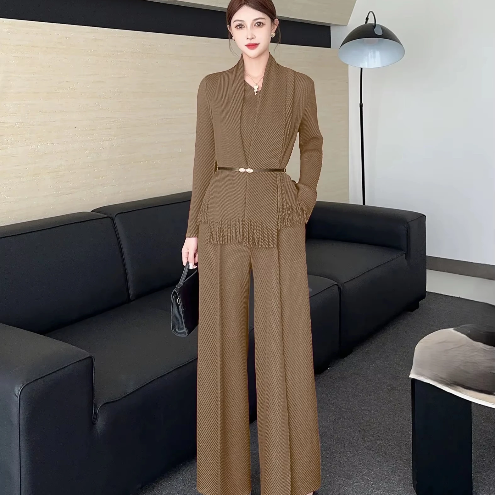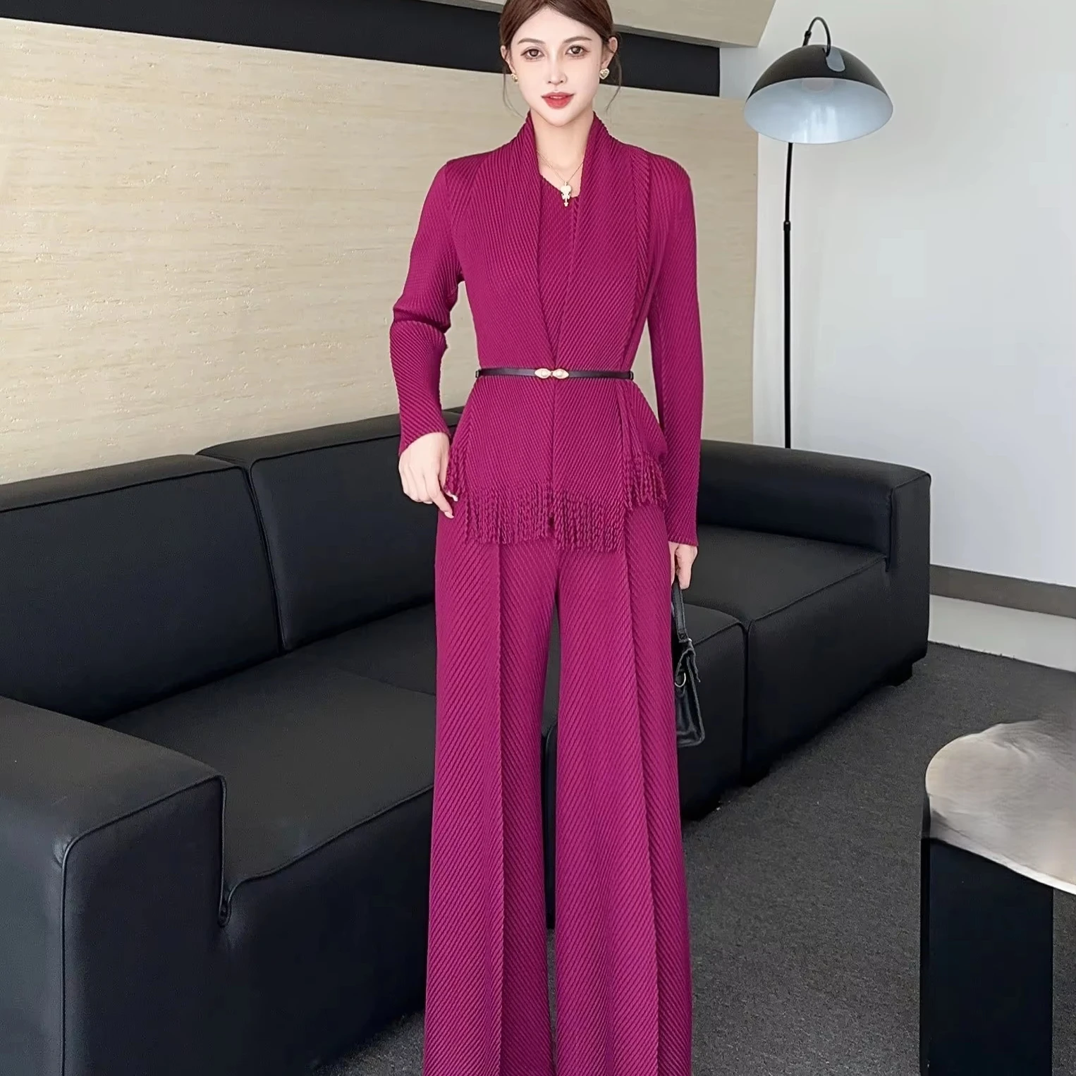 Women's Elegant Pleated Two-Piece Set: Fringe Cardigan Wide-Leg Pants with Belted Waist for Office
