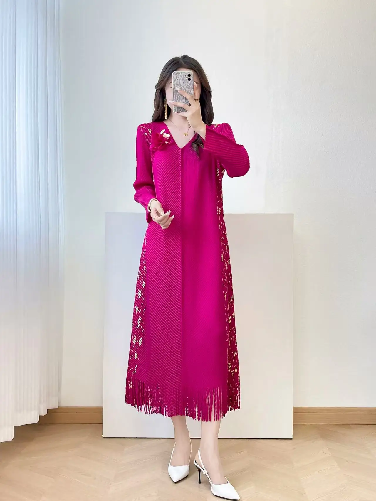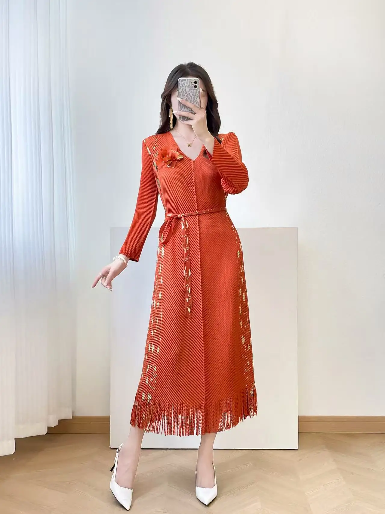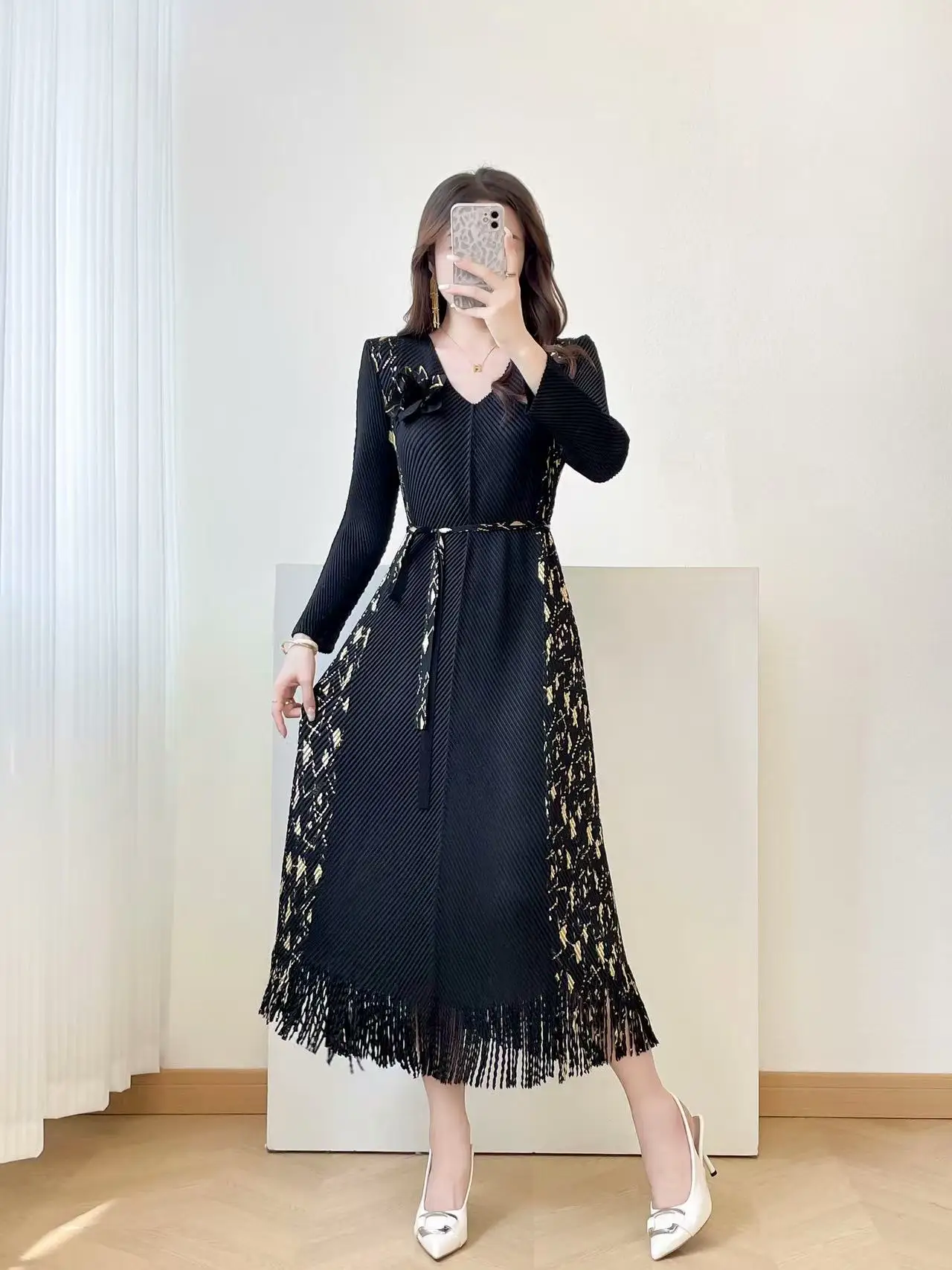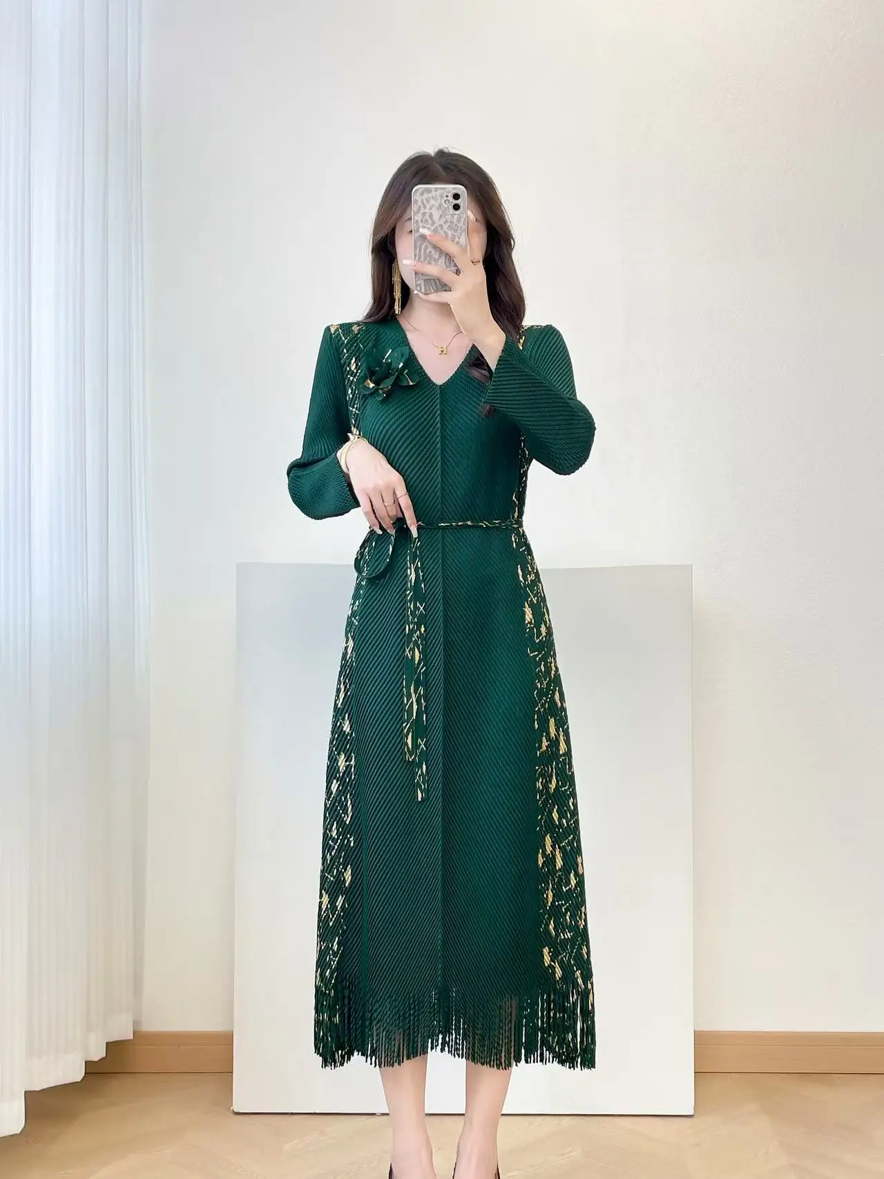 2025 New Women's Elegant Purple Pleated Midi Dress, V-Neck Long Sleeve with Gold Print, Fringe Hem, Belt Flower Detail