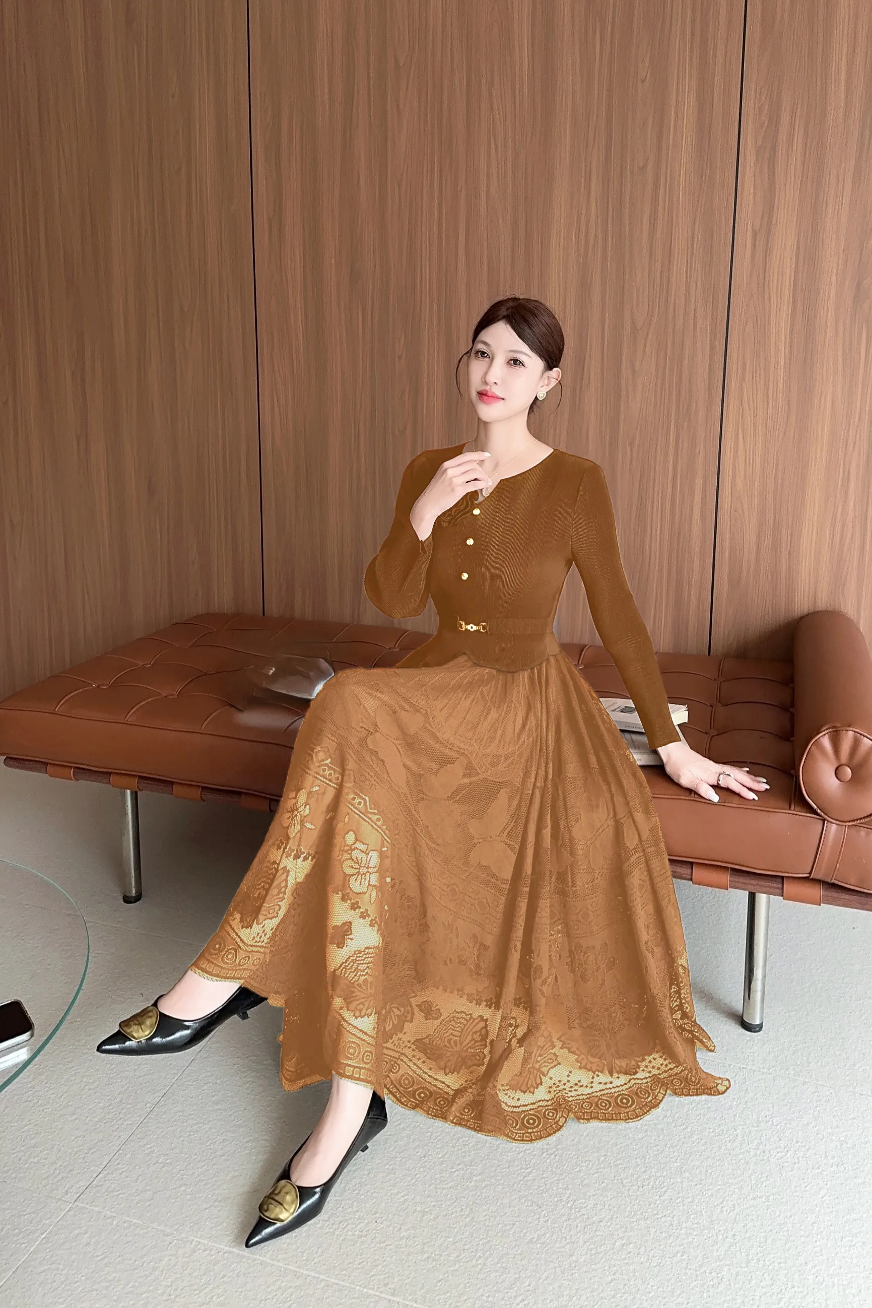 ZYHT 21541 Wholesale Crew Neck High Waist Casual Dresses Elegant Lace Velvet Mermaid Hem Ruched Long Sleeve Dresses for Women