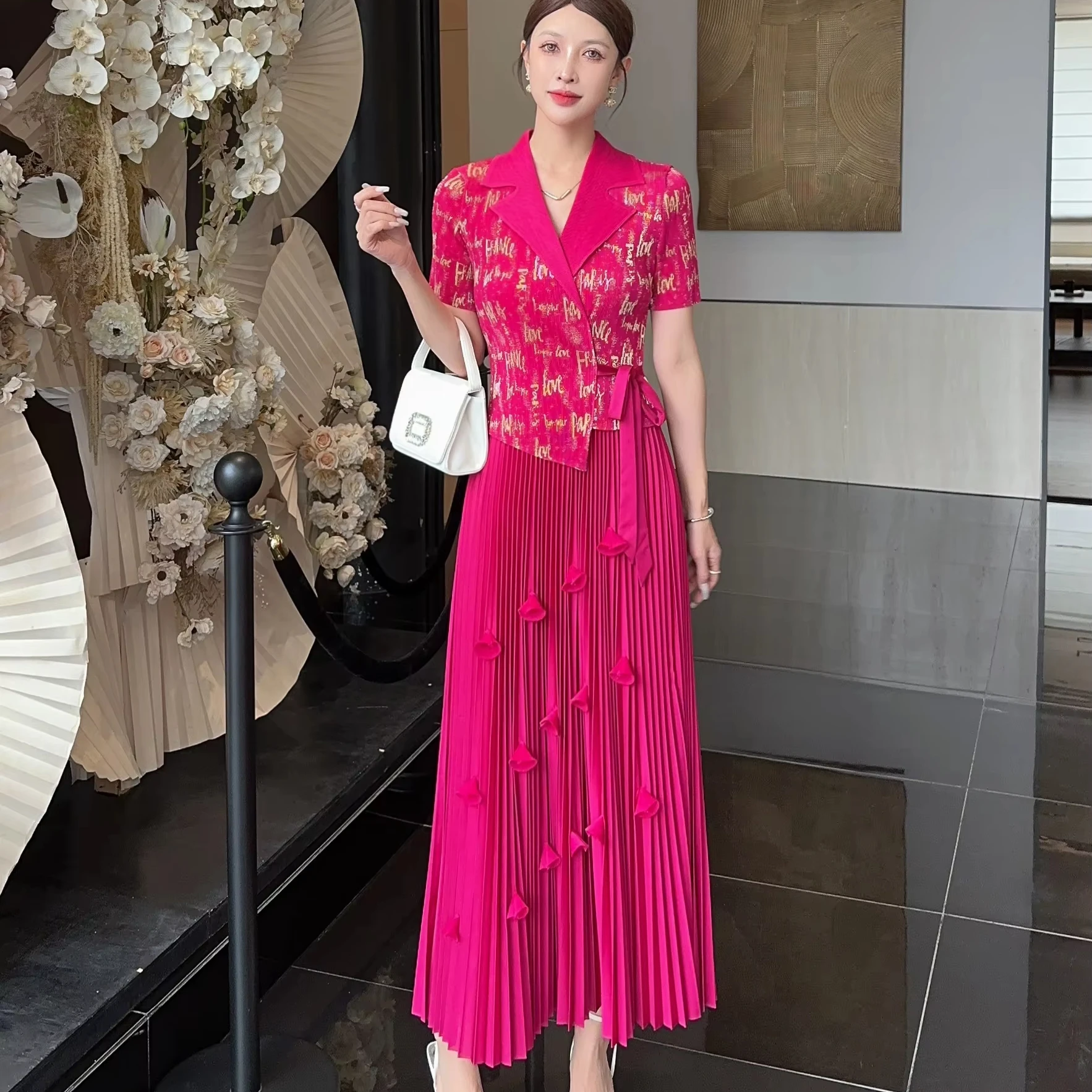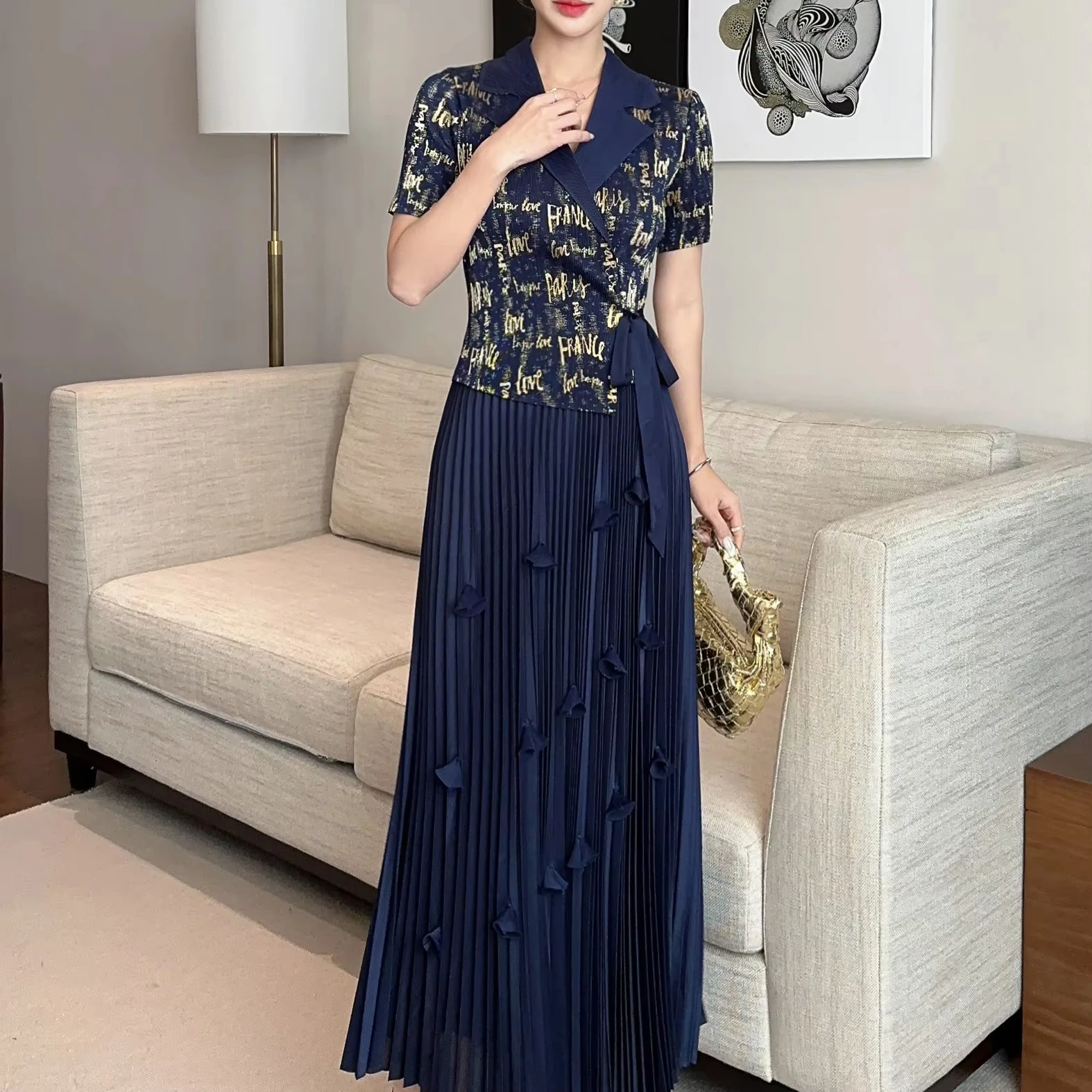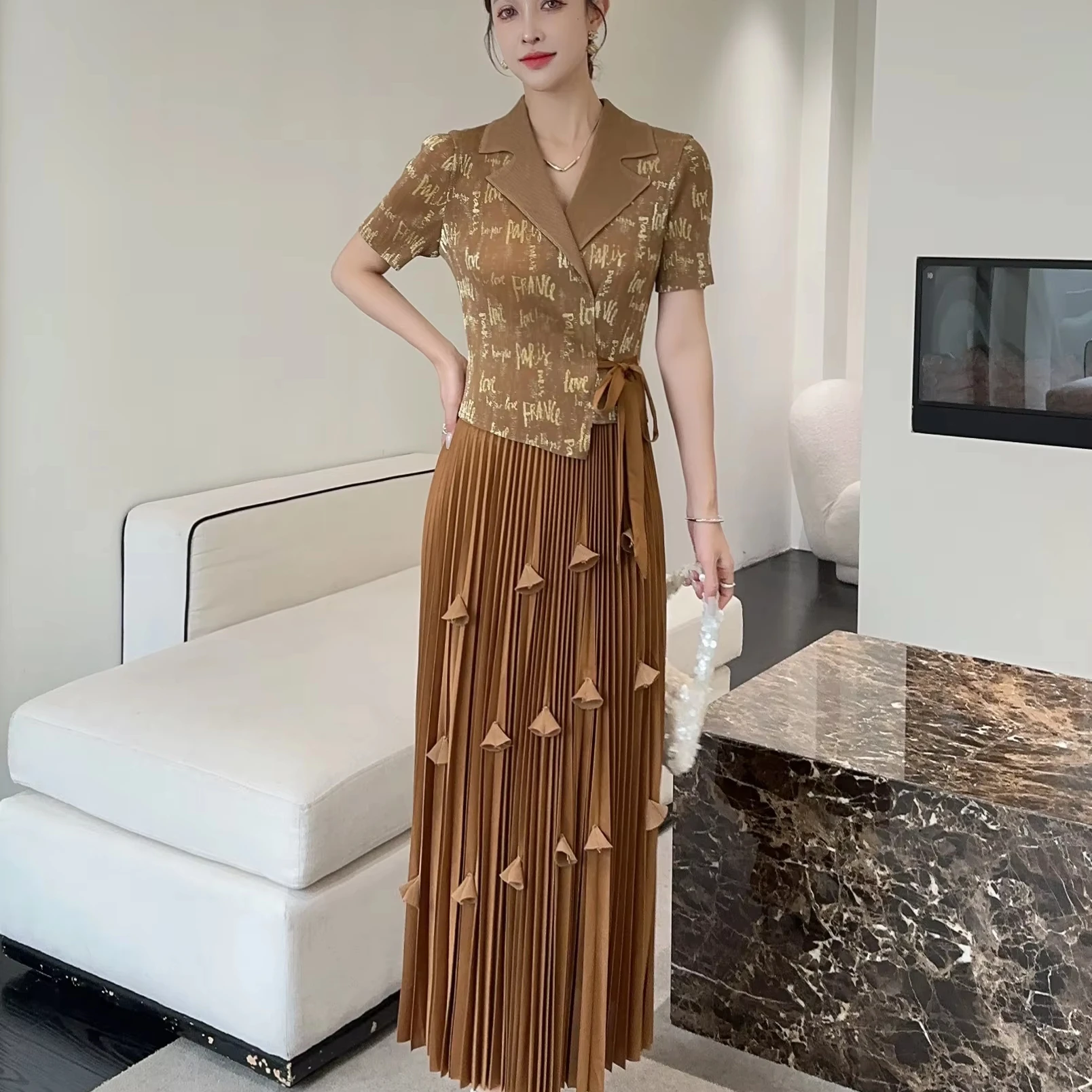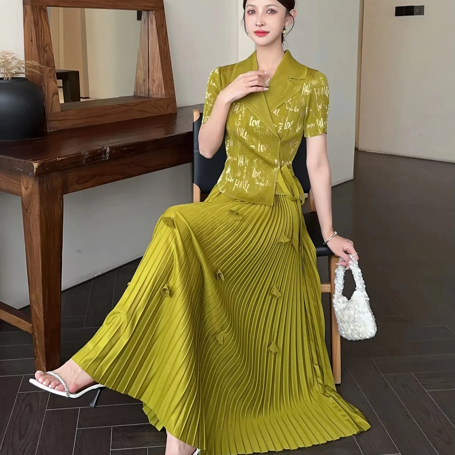 Gold-stamped Large-size Women's Suit with a Collar and Textured Pleats Set