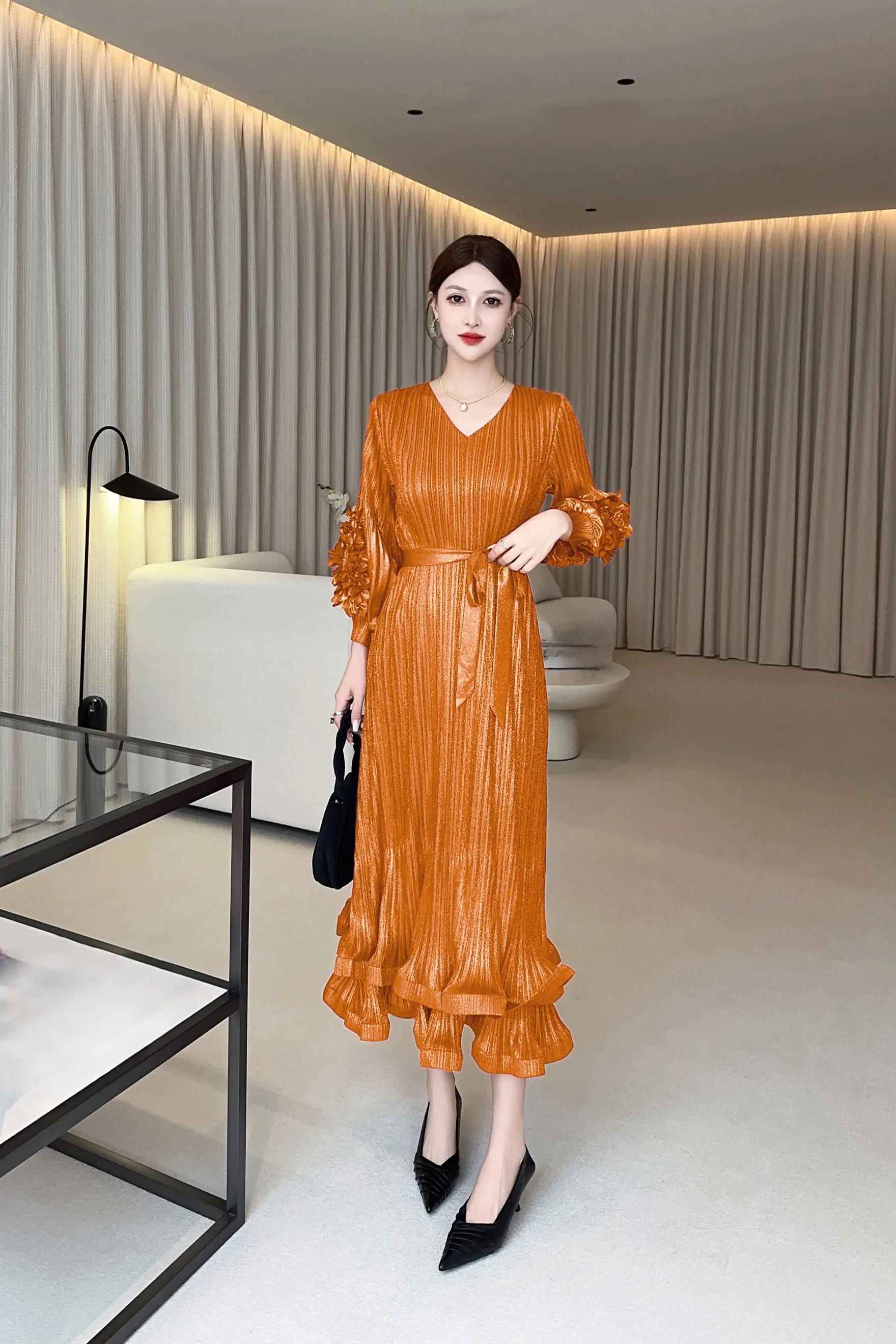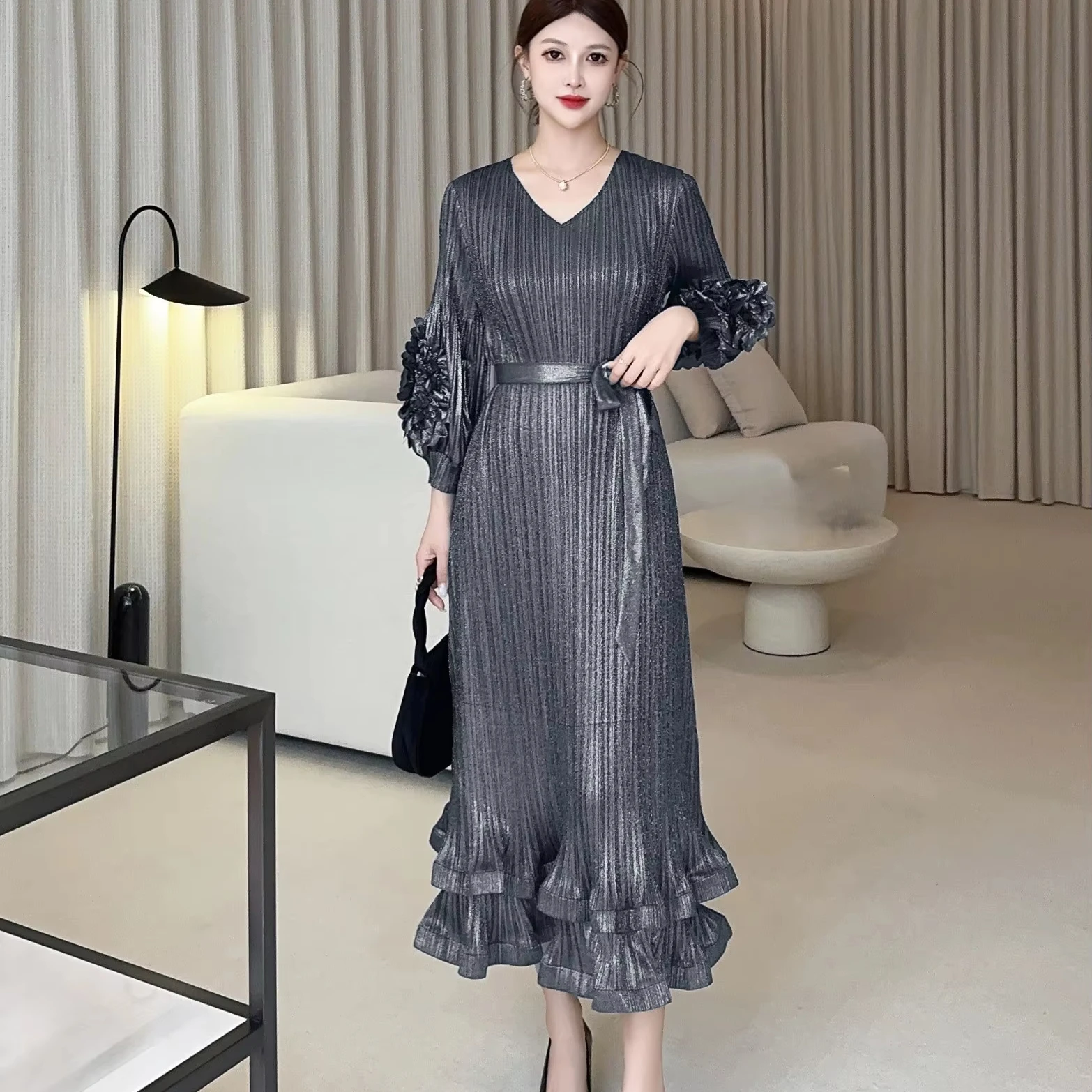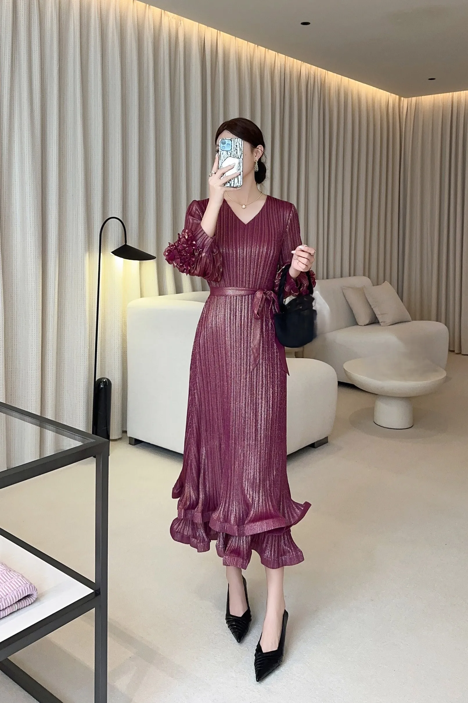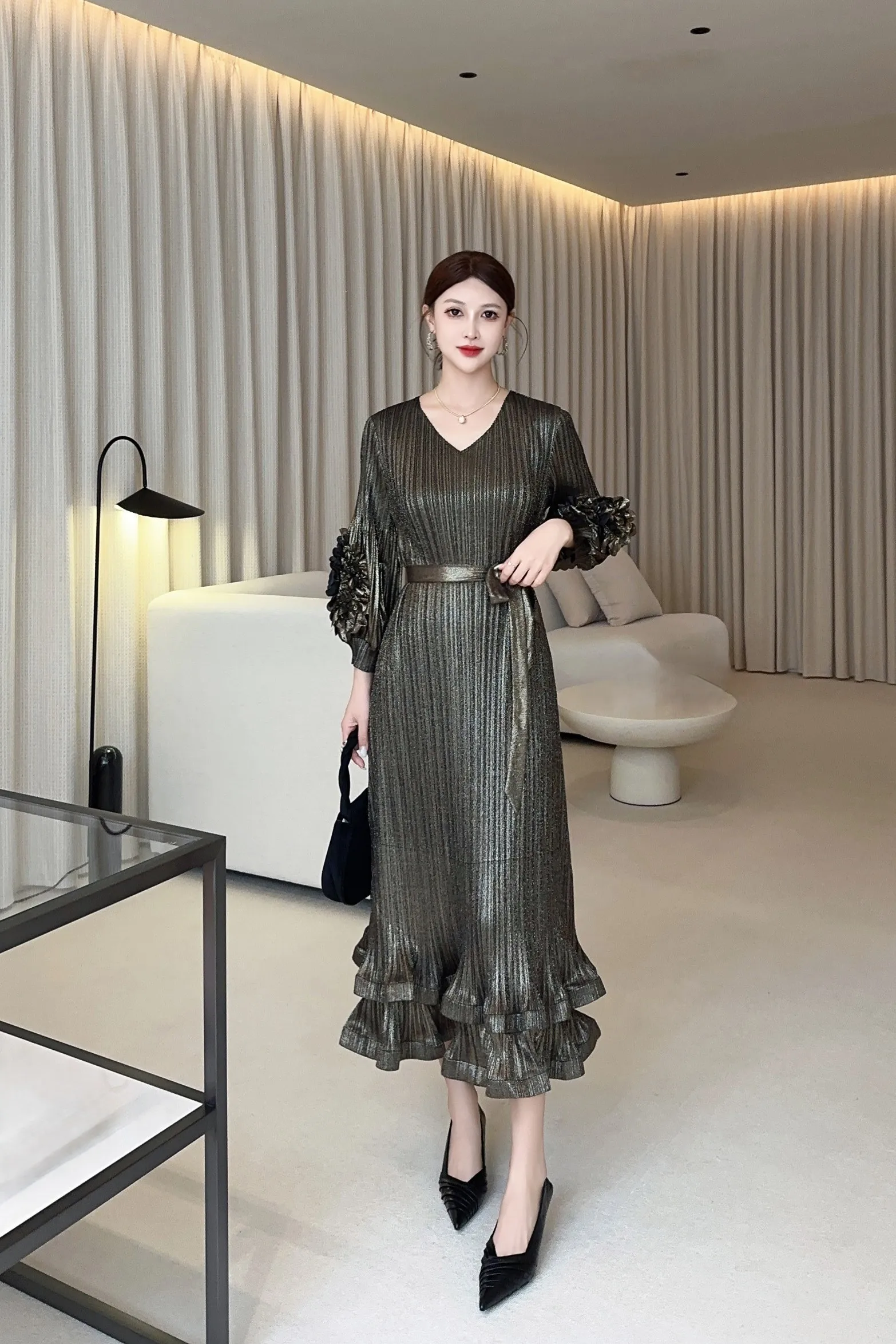 High-quality V-necked Flowered Sleeve Plus-size Dress for Wholesale - Elegant and Noble with Pleated Dress