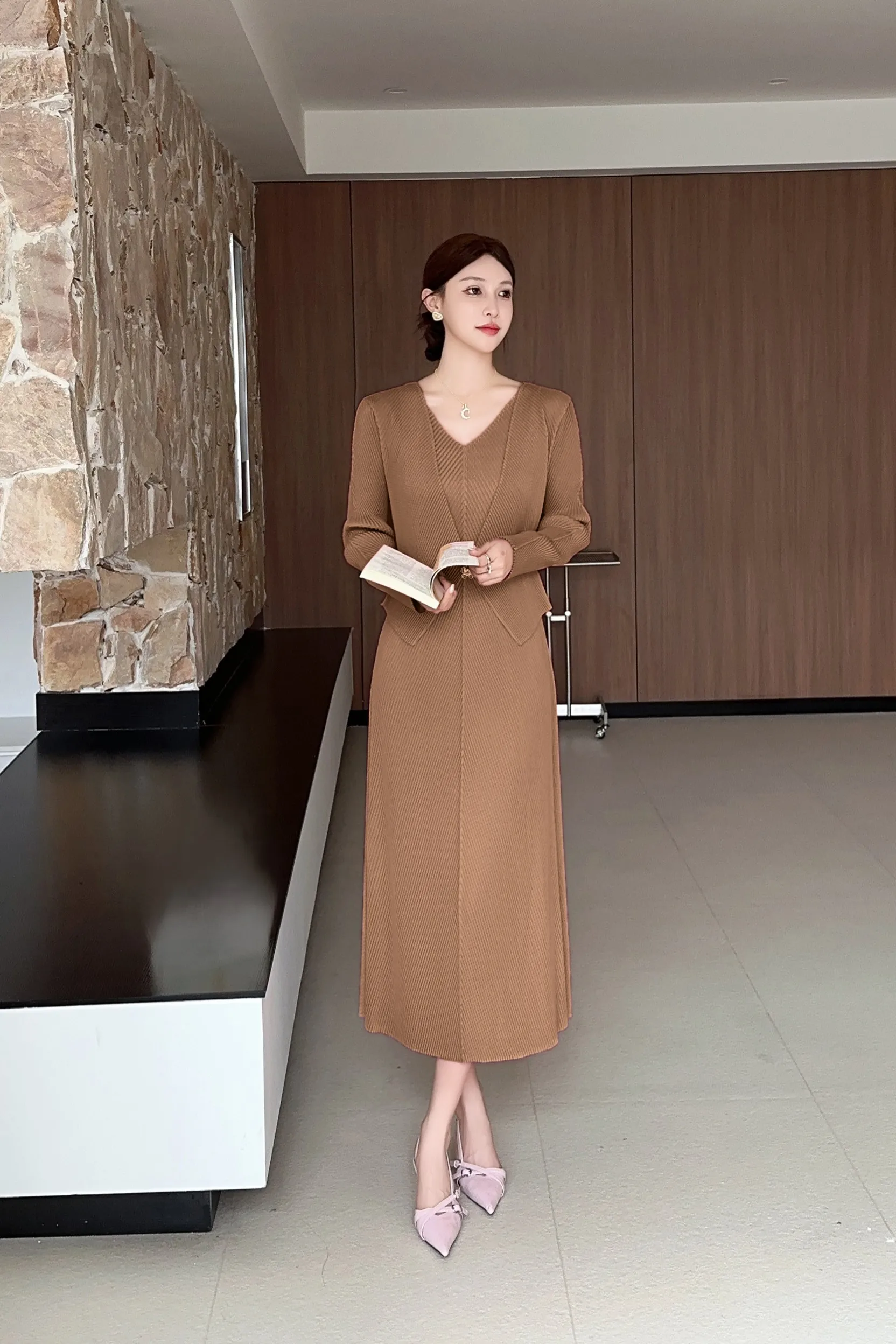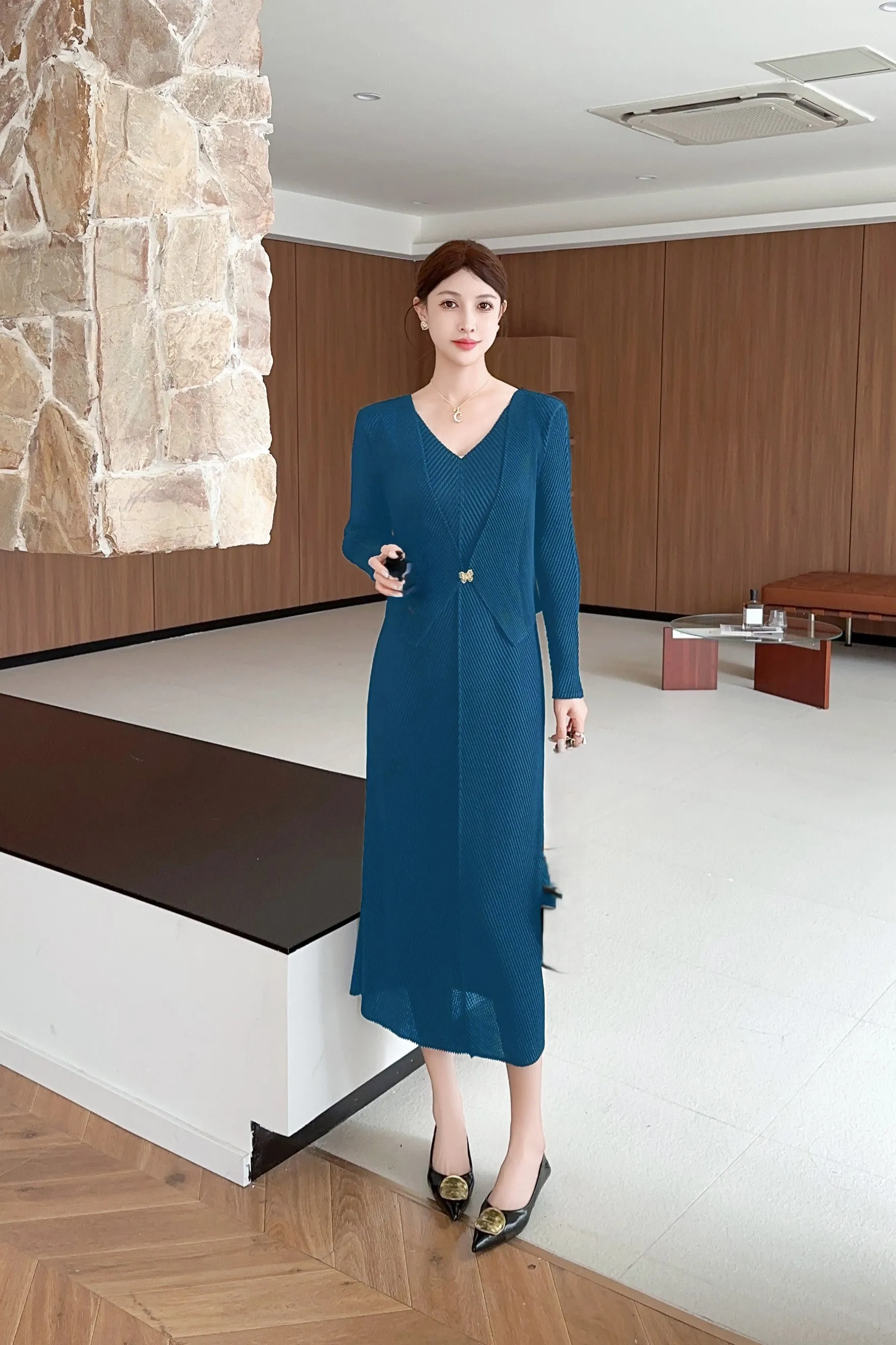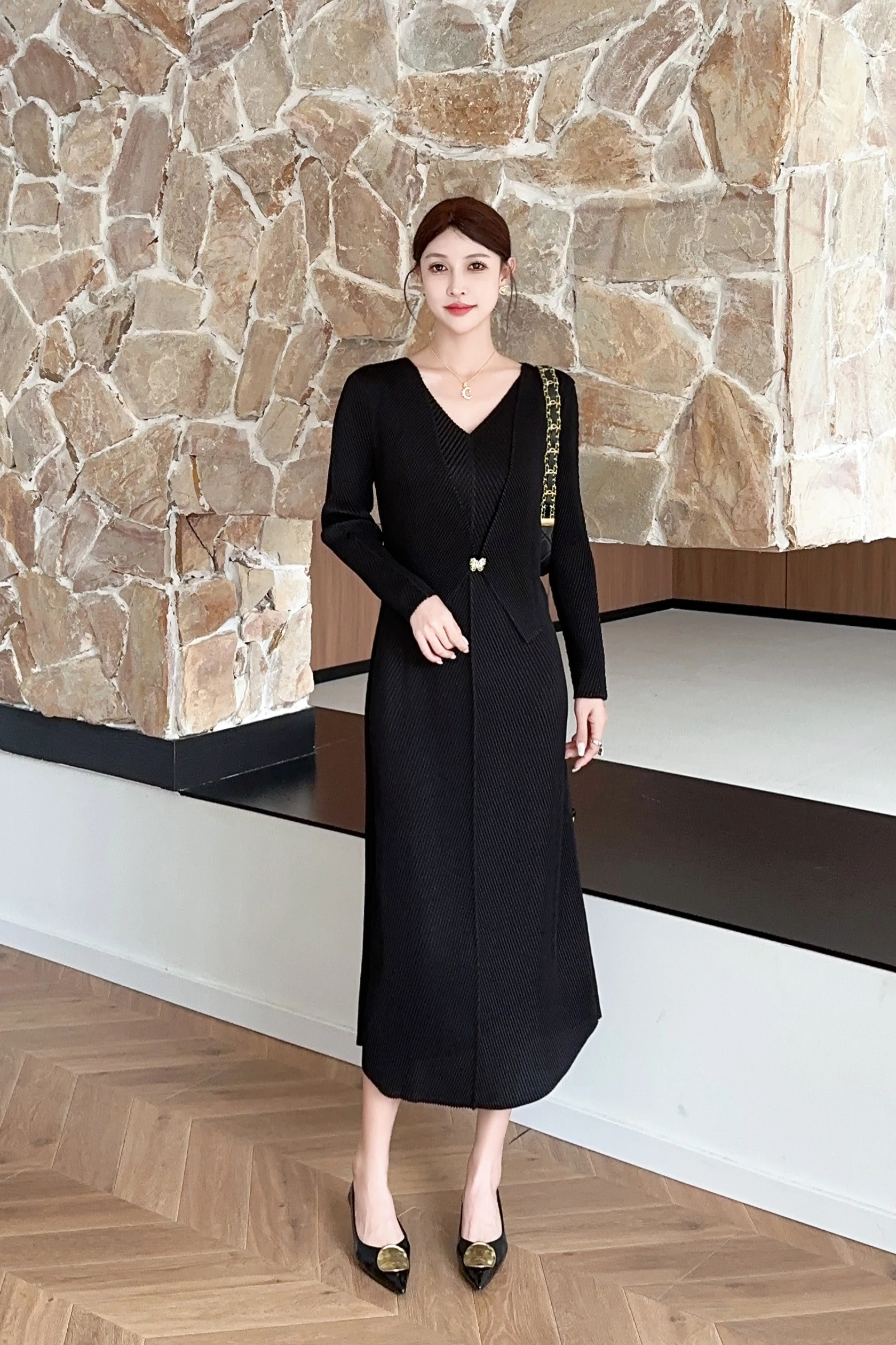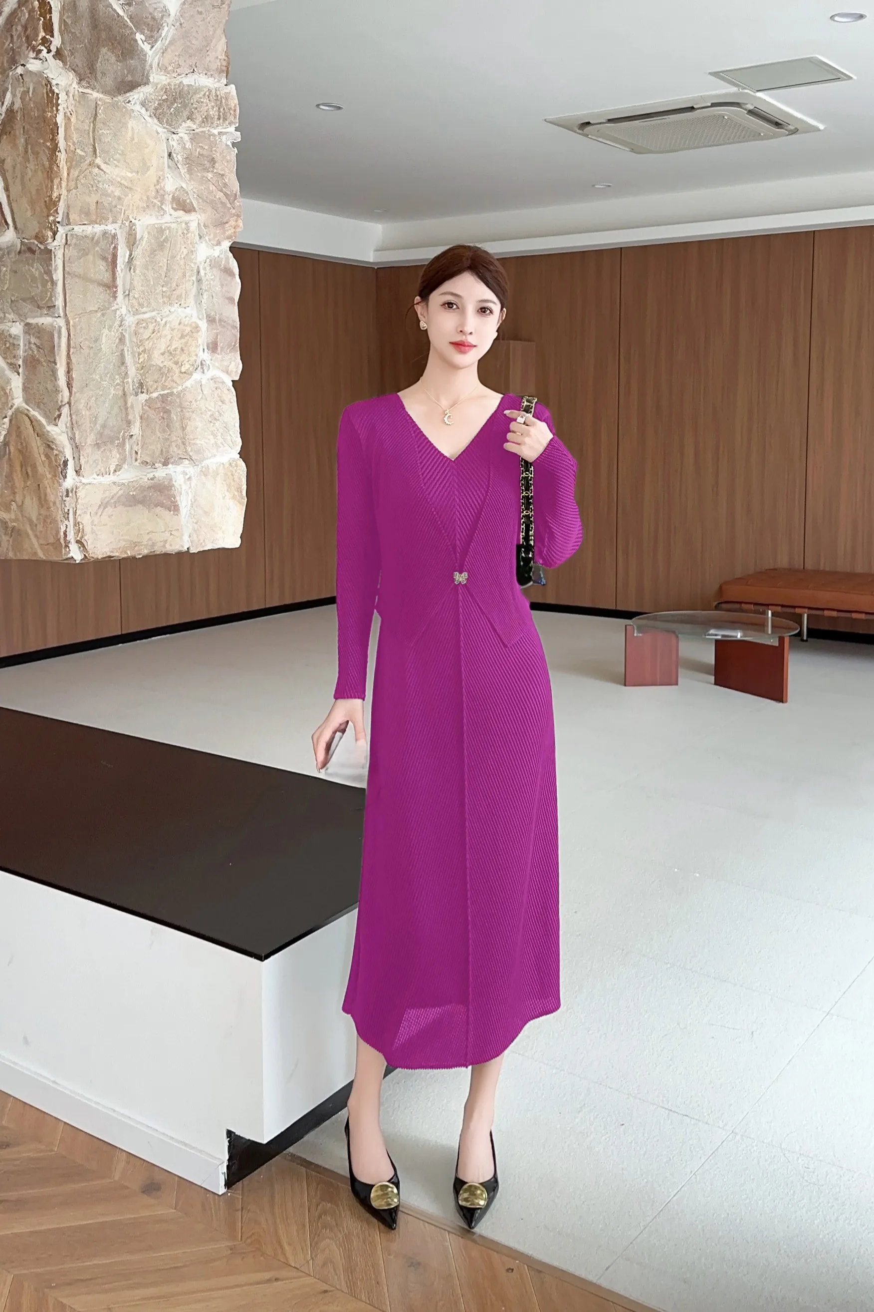 V-neck High-quality Stretch-fitting Plus-size Dress with Elegant Miyake Pleated Design