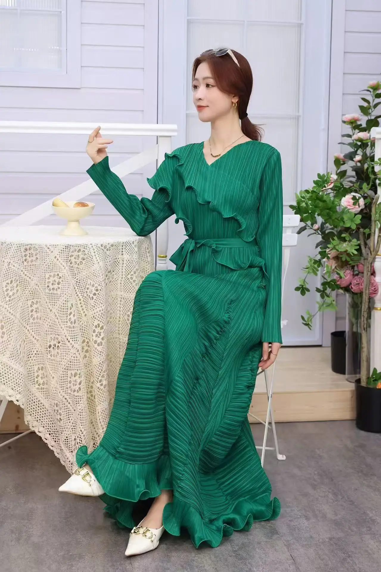 Women's Long Pleated Dress with Elegant V-neck and Wooden Earflaps in Large Size