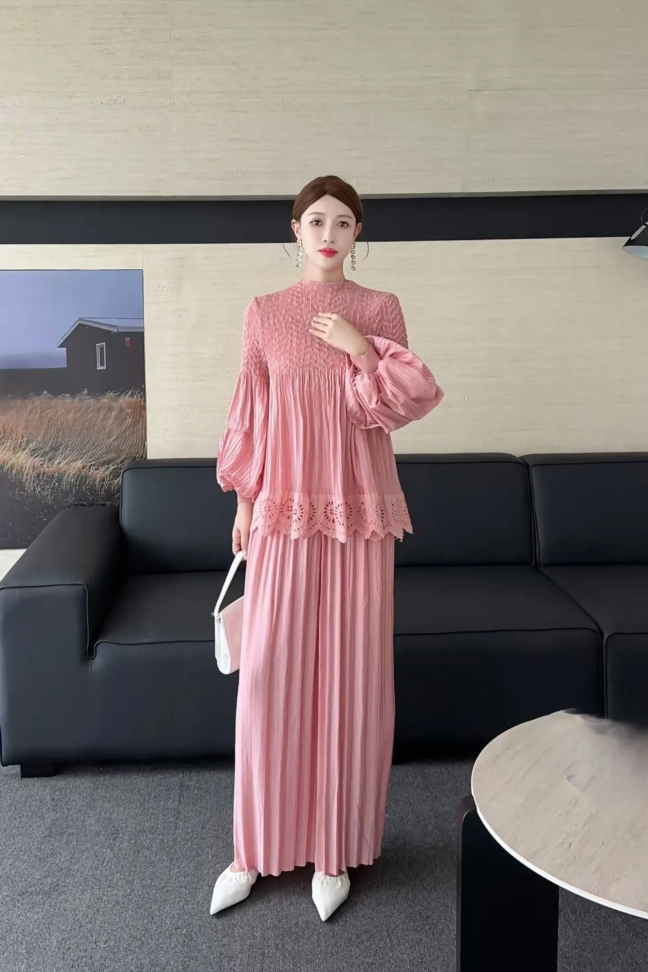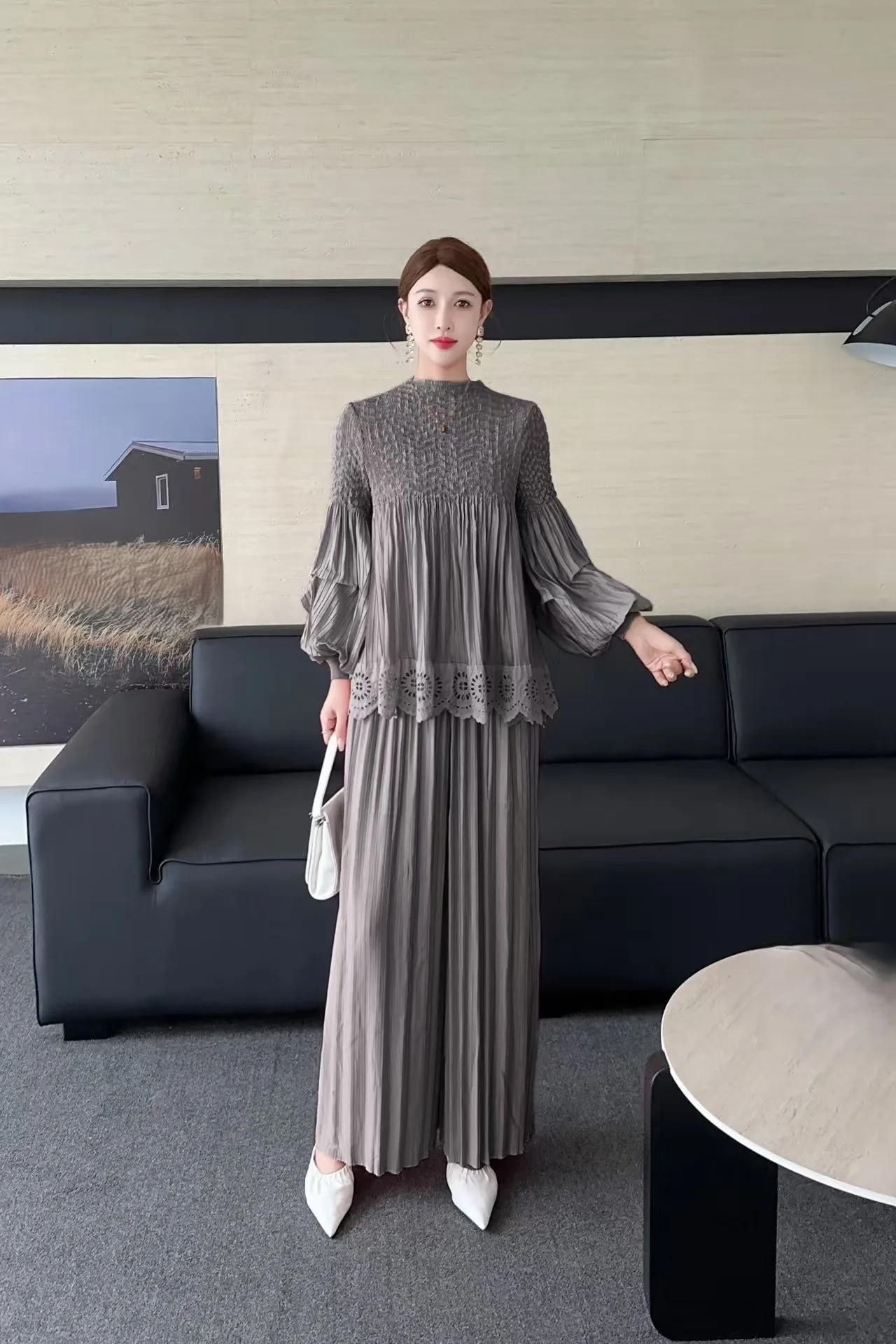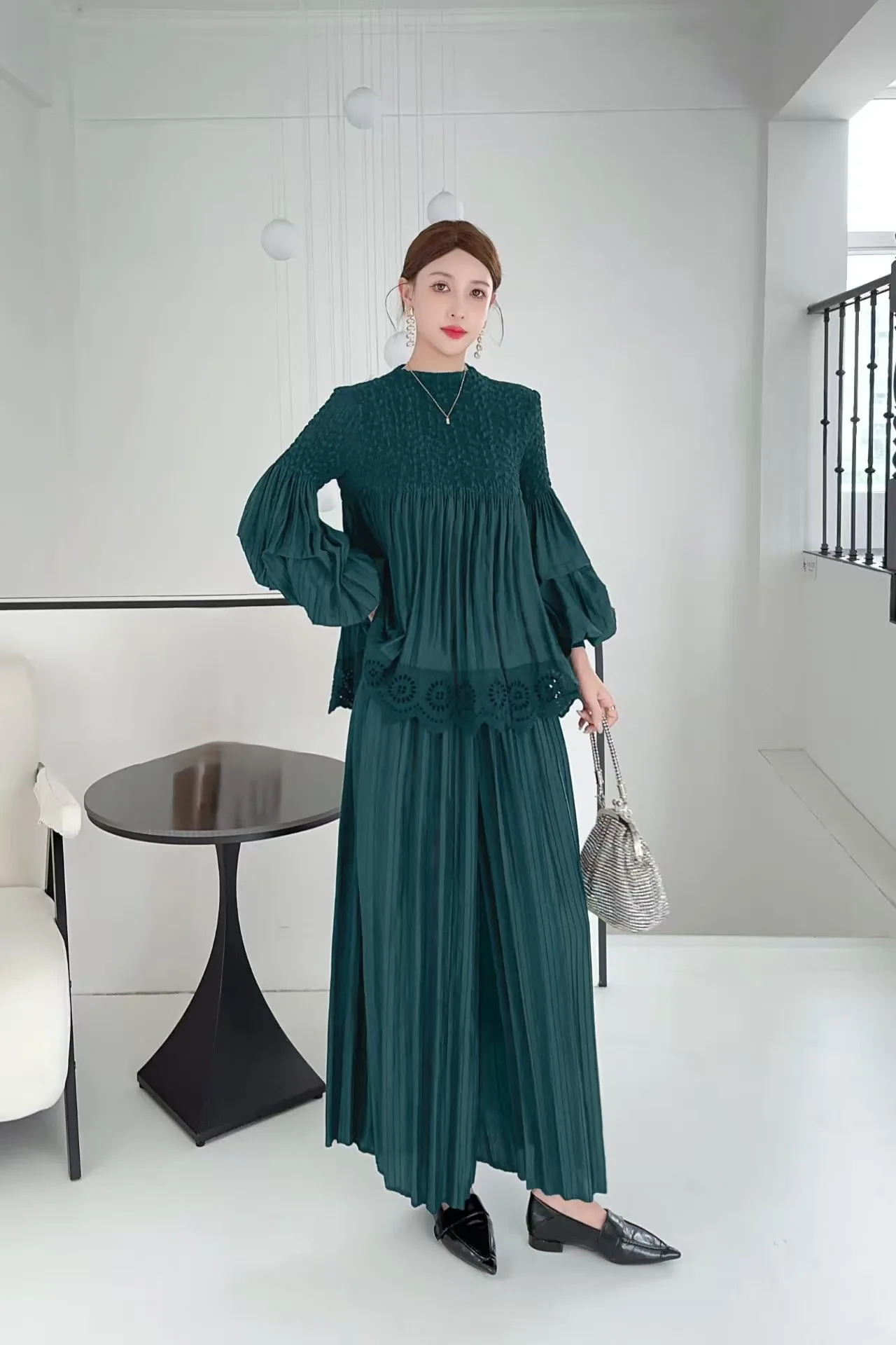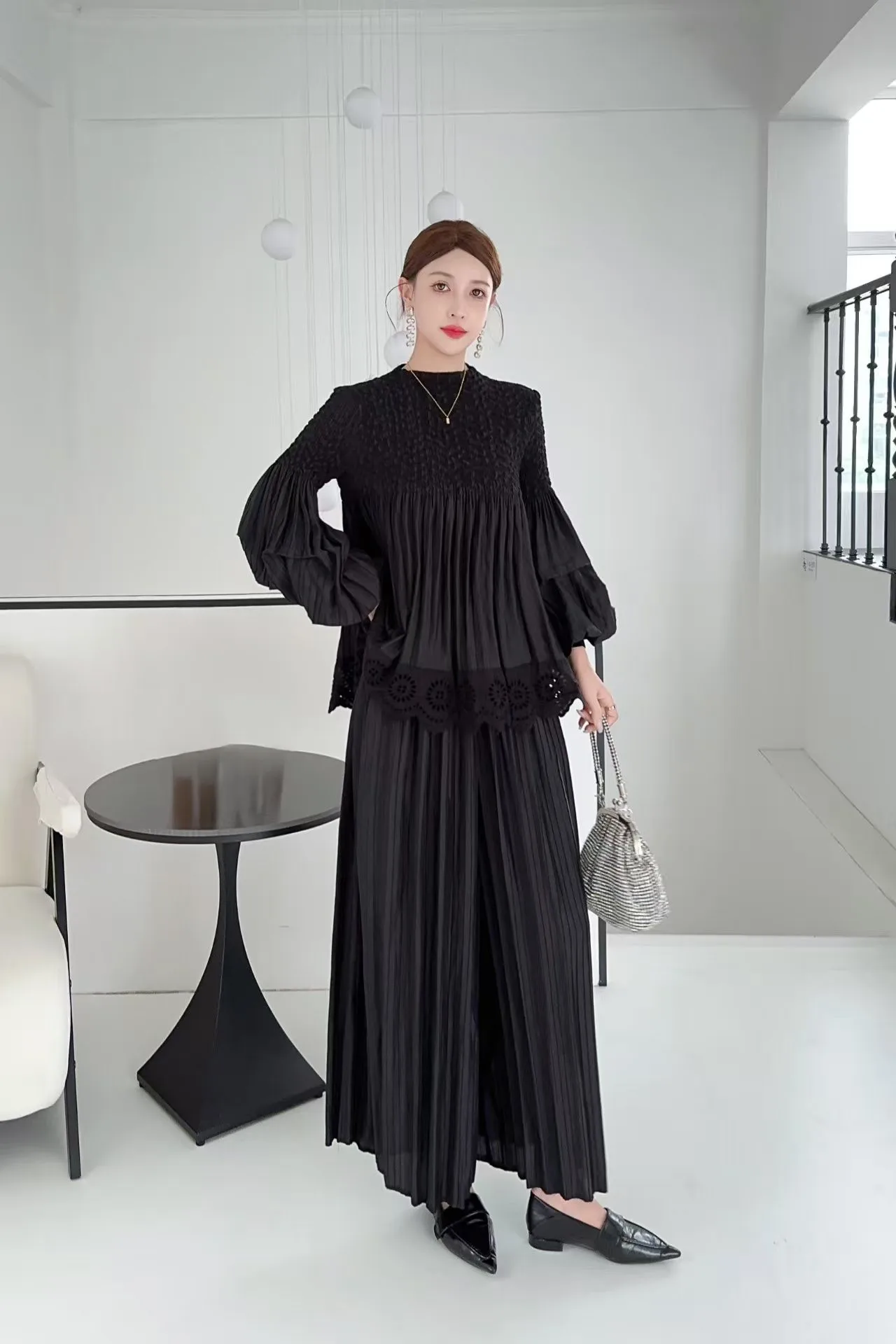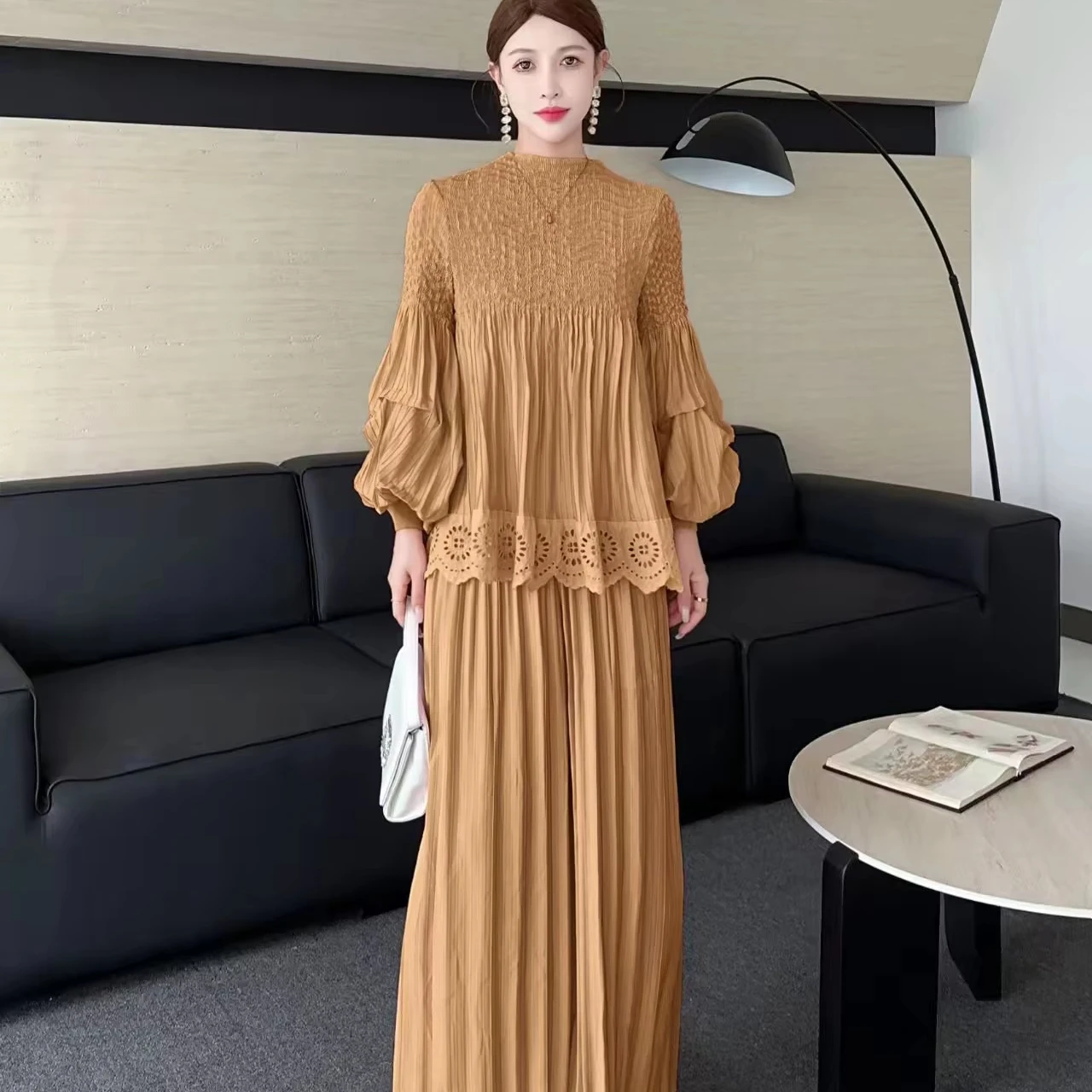 Heavy Crafted Women's Ruffled Set - Solid Color Miyake Large Size Two-Piece Set - High-Quality Texture