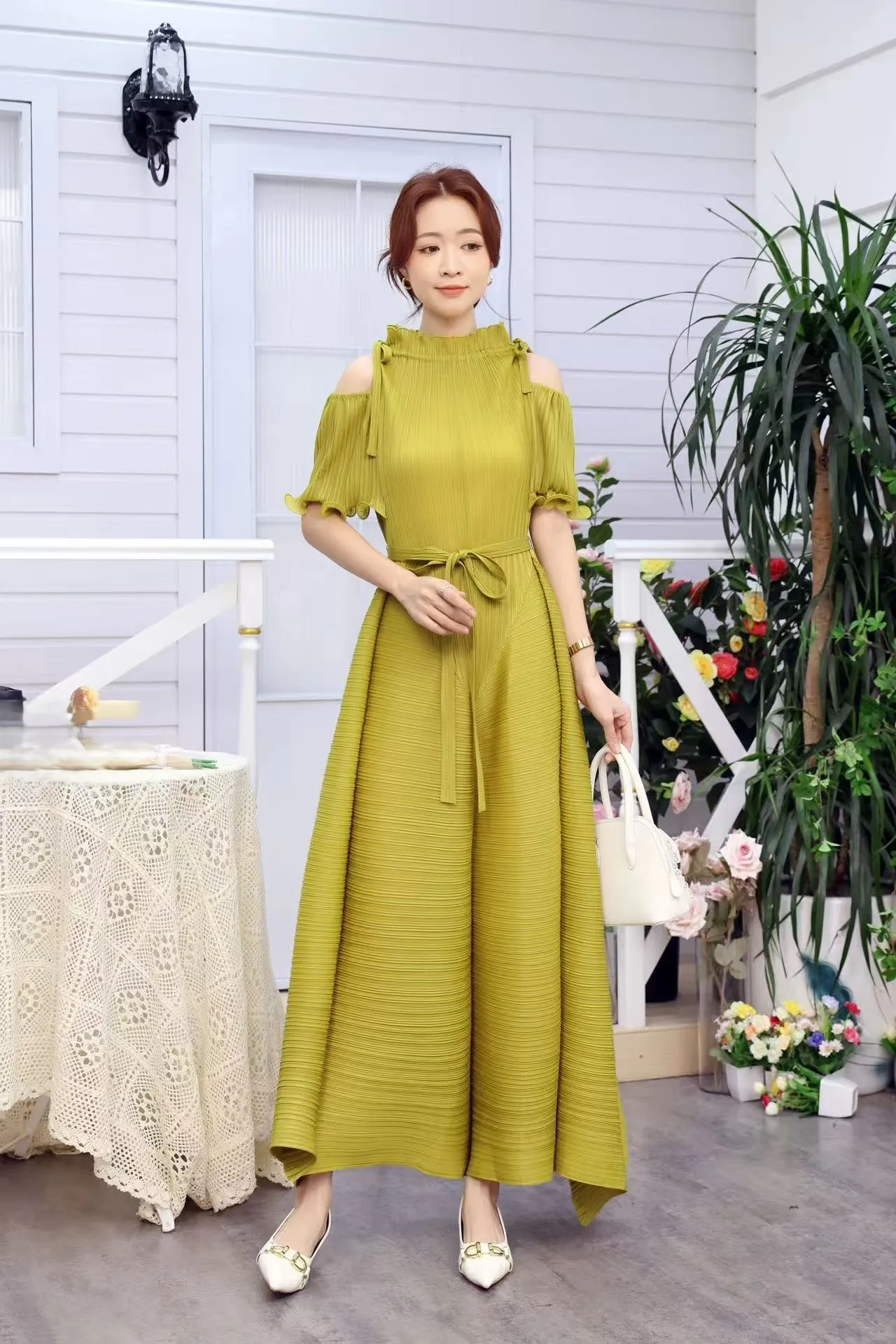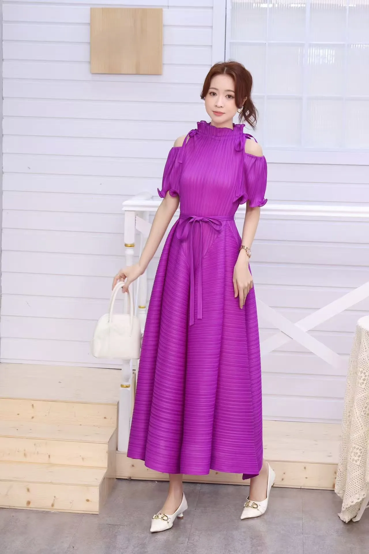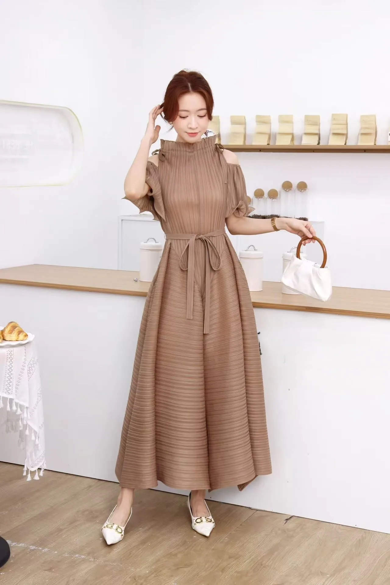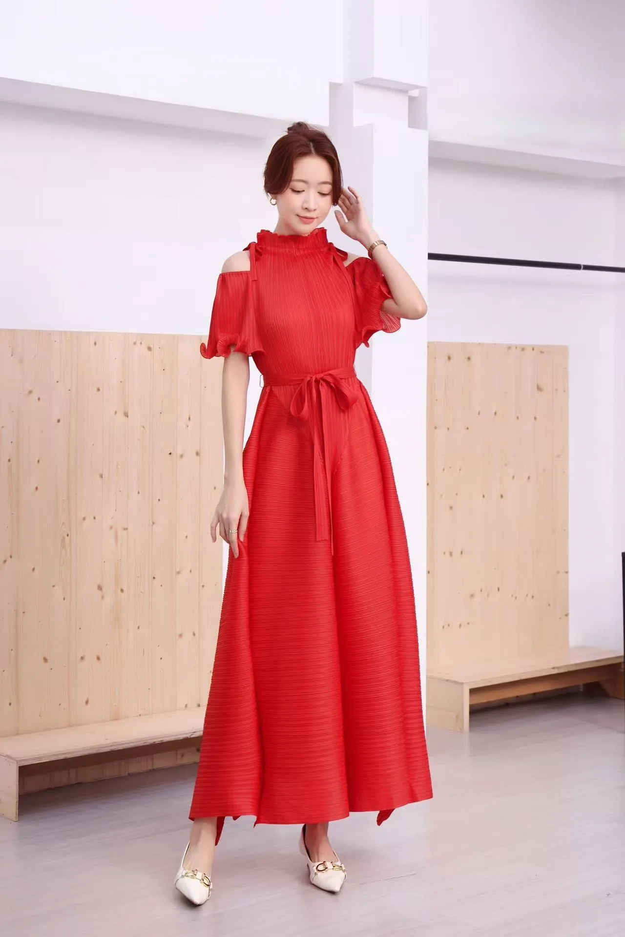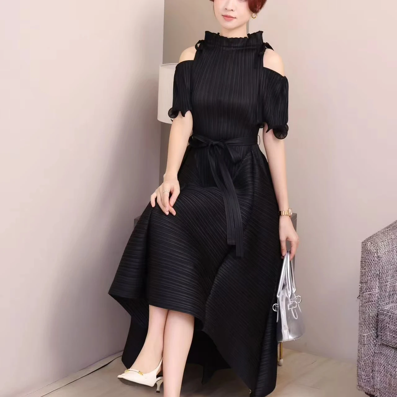 A Long-style Maxi Elastic Dress in a Certain Size, a Summer Short-sleeved Pleated Dress