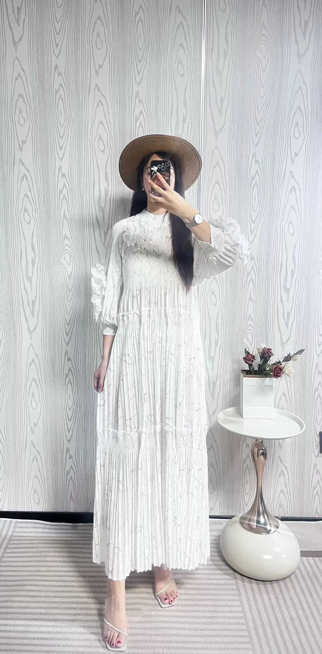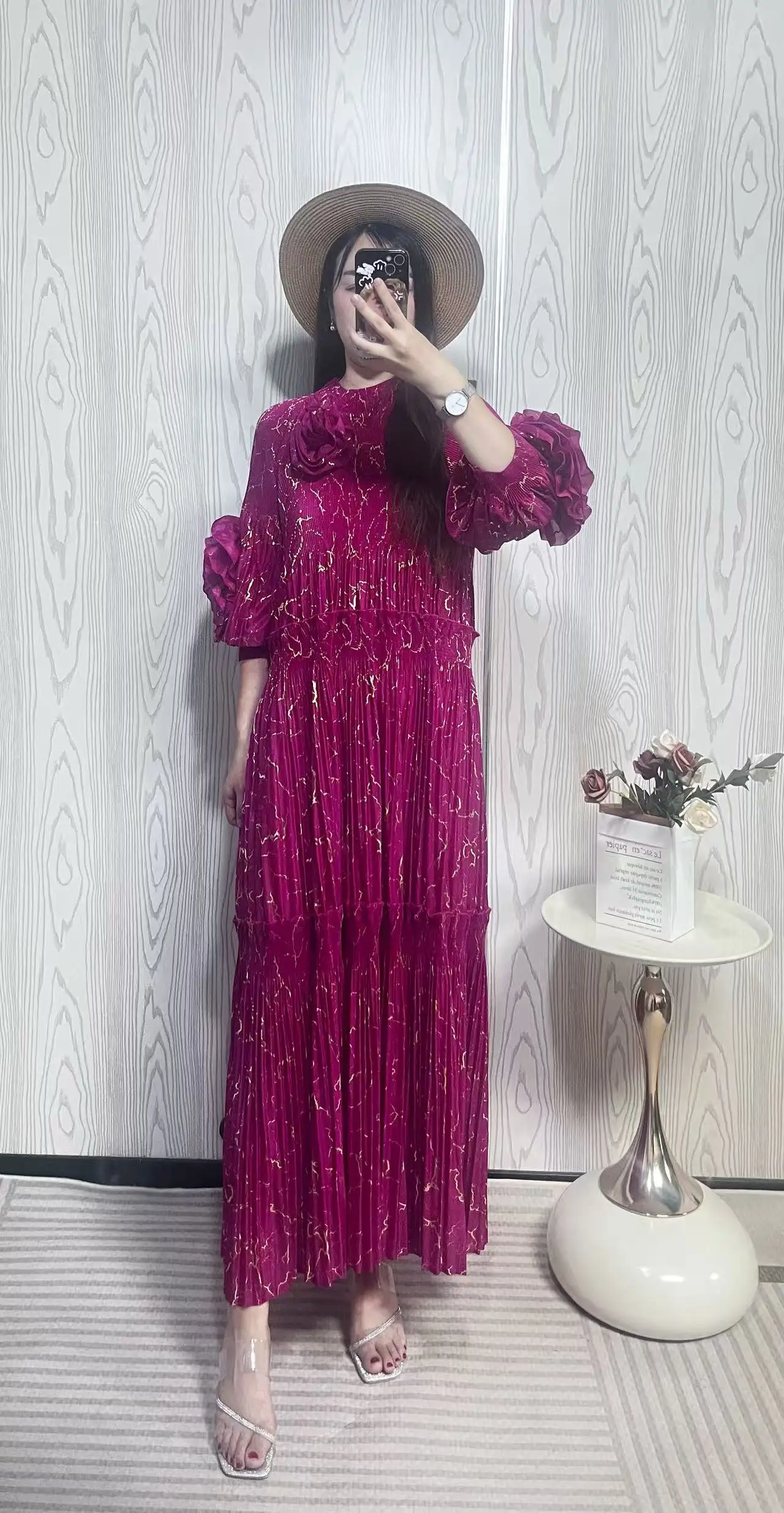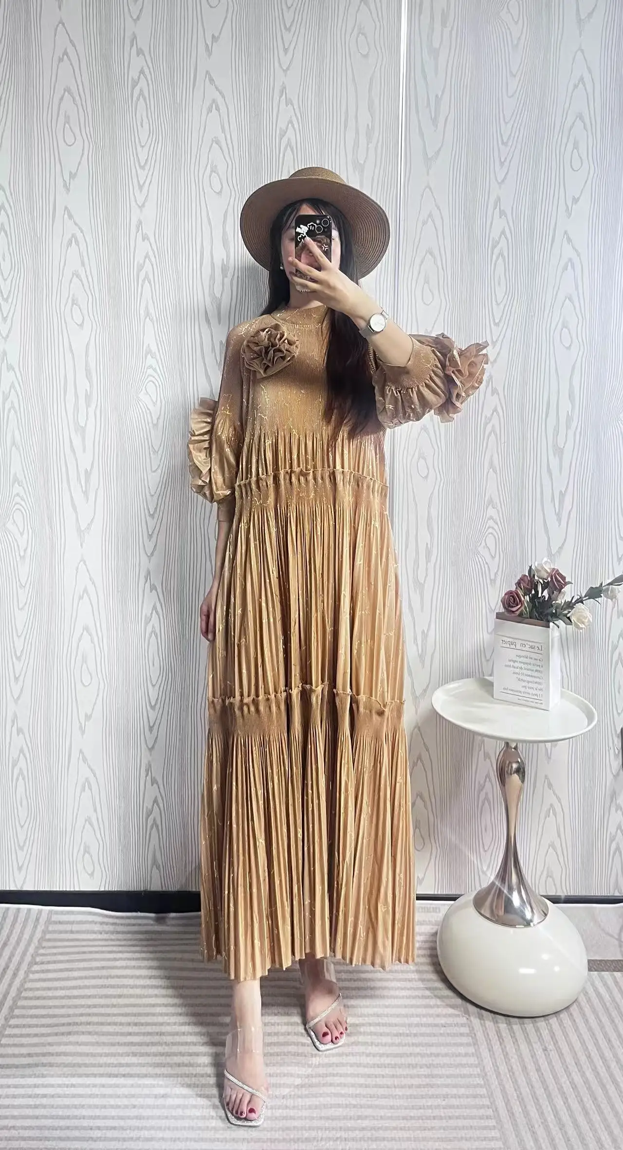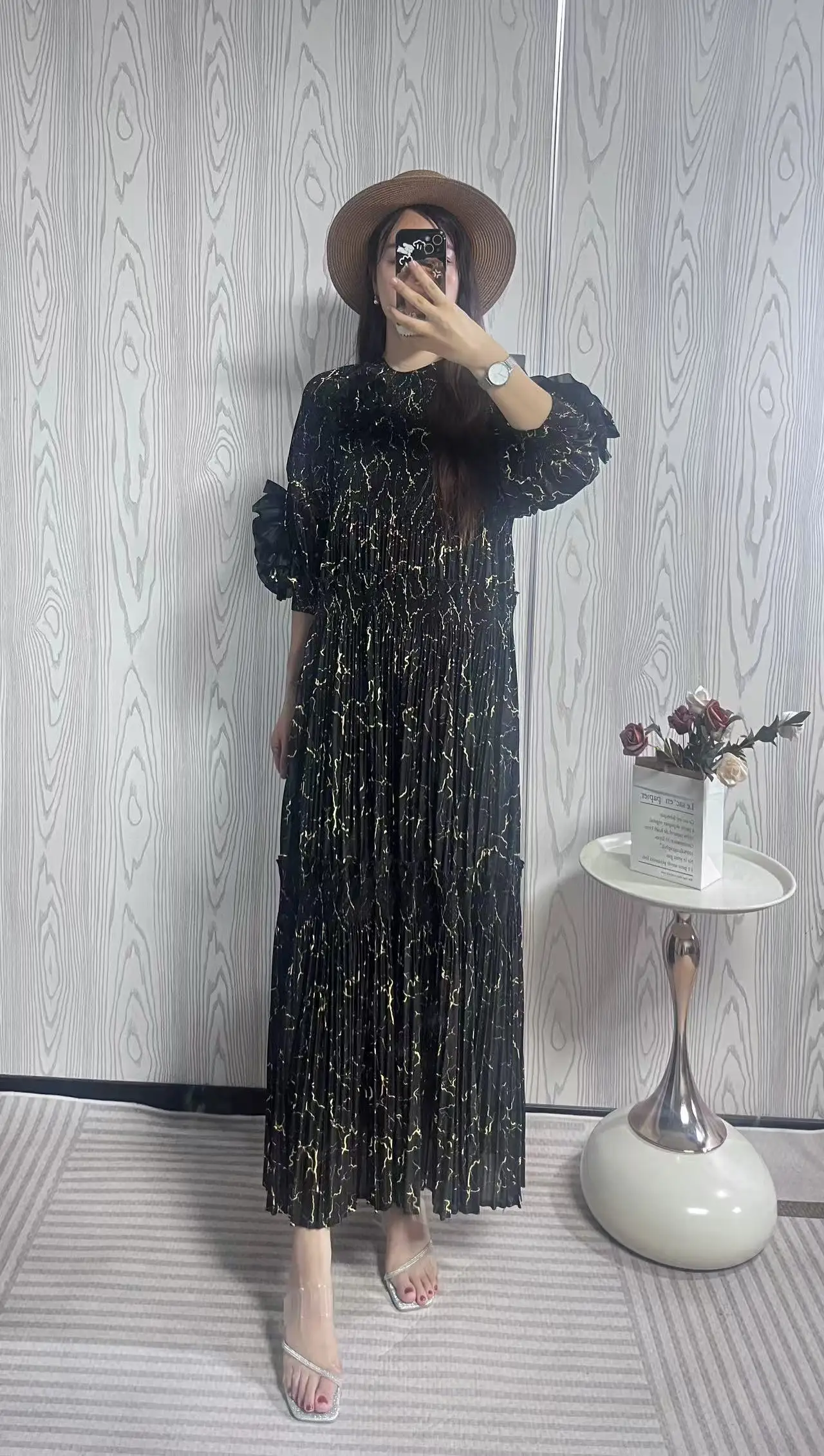 New High-quality Gold-stamped Pleated Dress with Ruffled Sleeves - Elegant and Casual Oversized Dress for Women