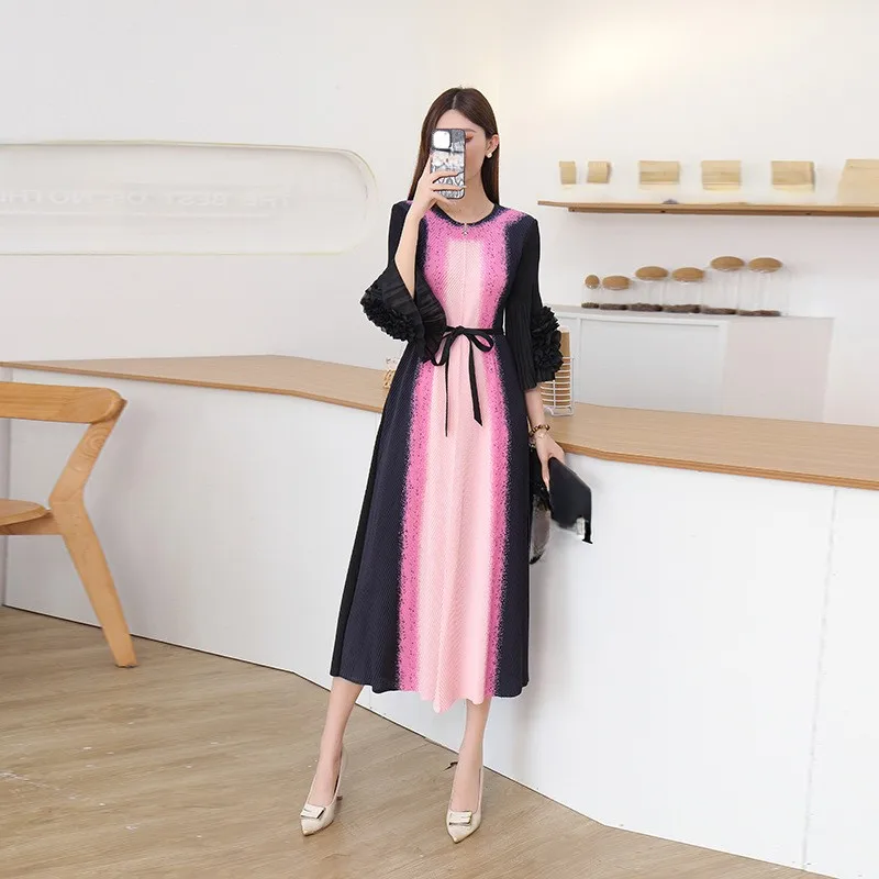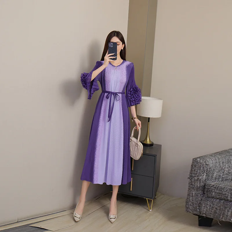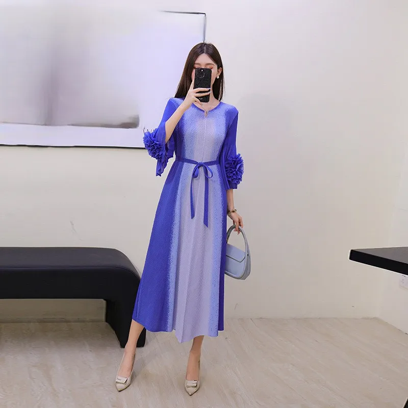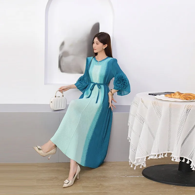 European and American Style Large-size Dress Manufacturer - Petal Sleeve Waist Cinched Pleated Dress