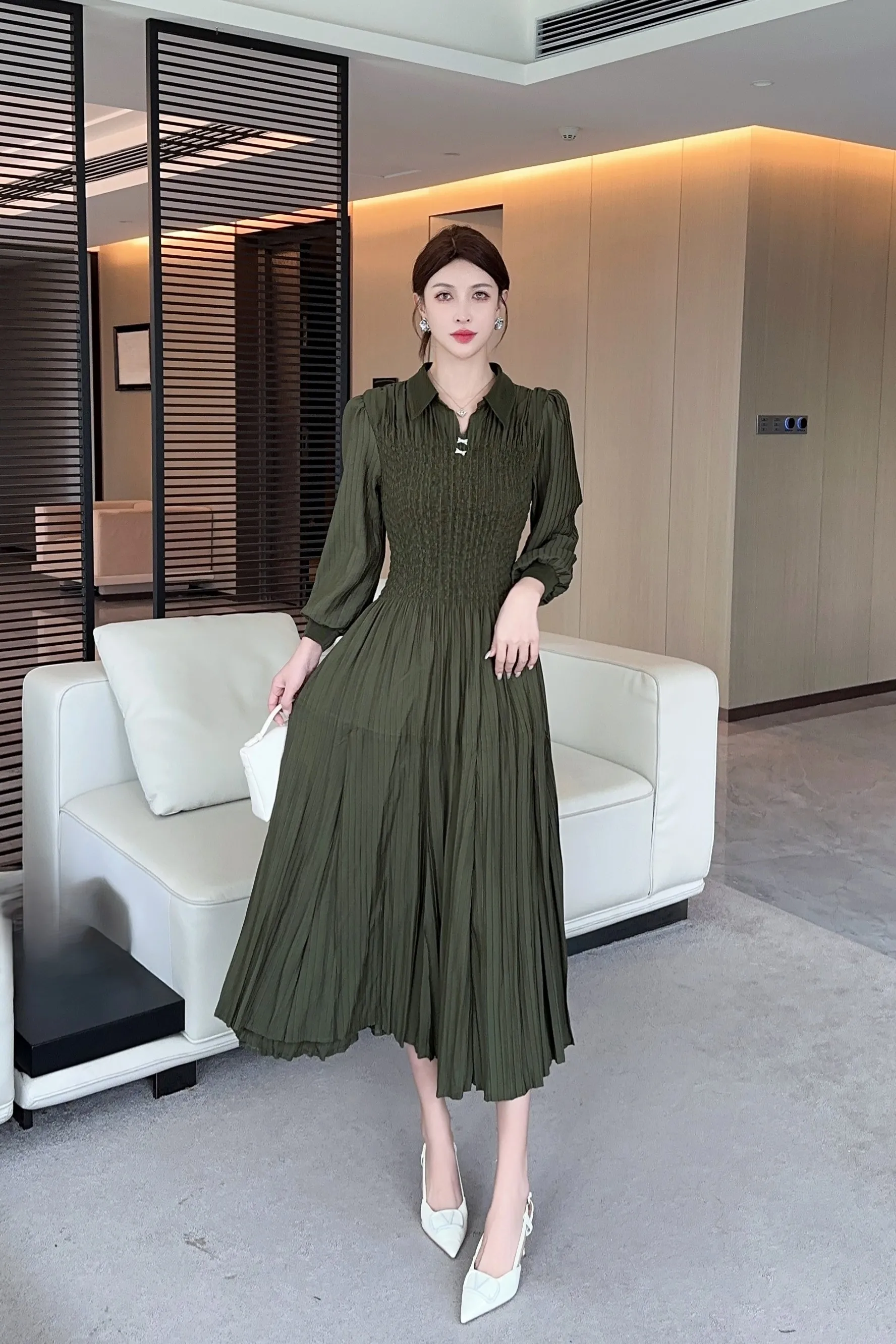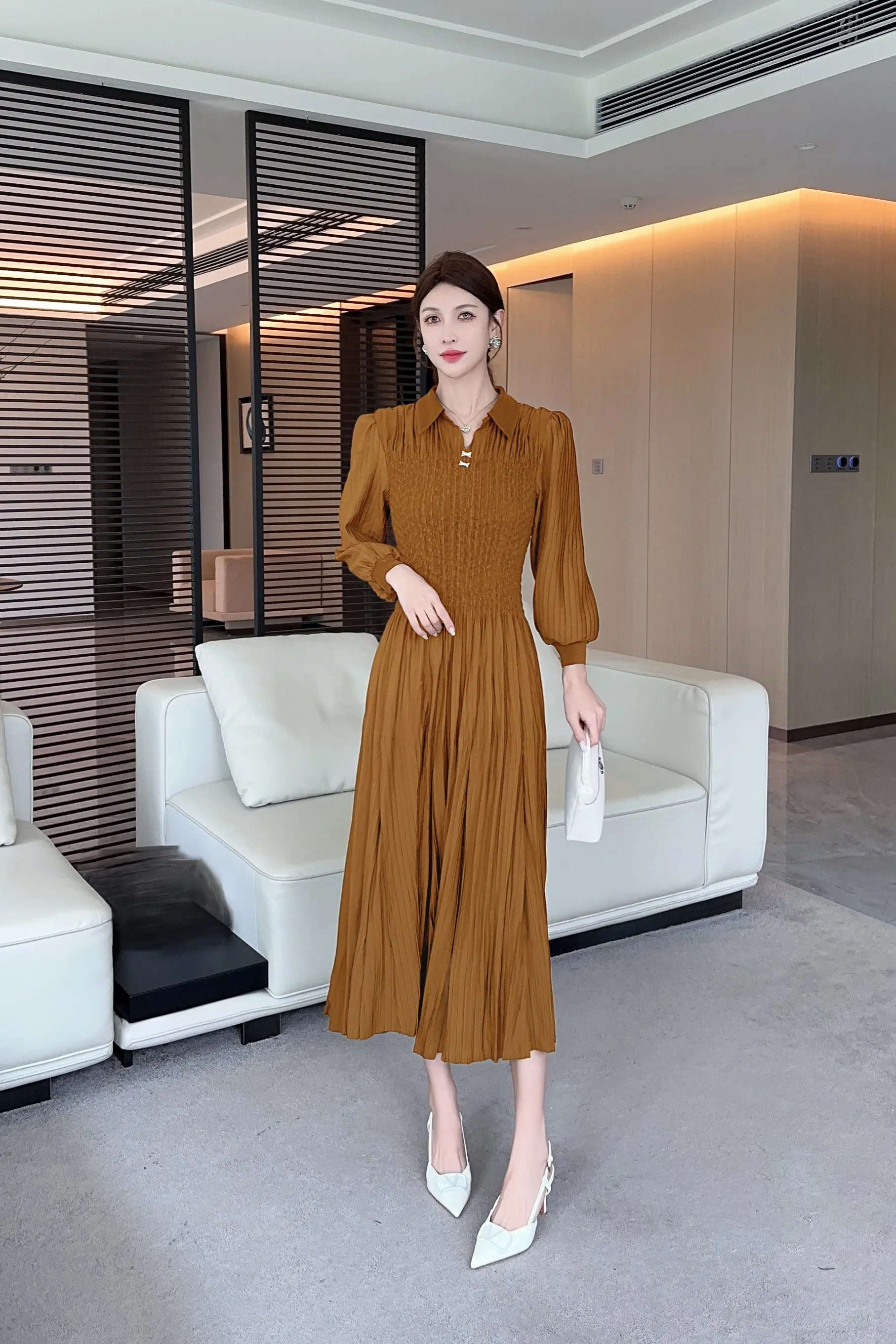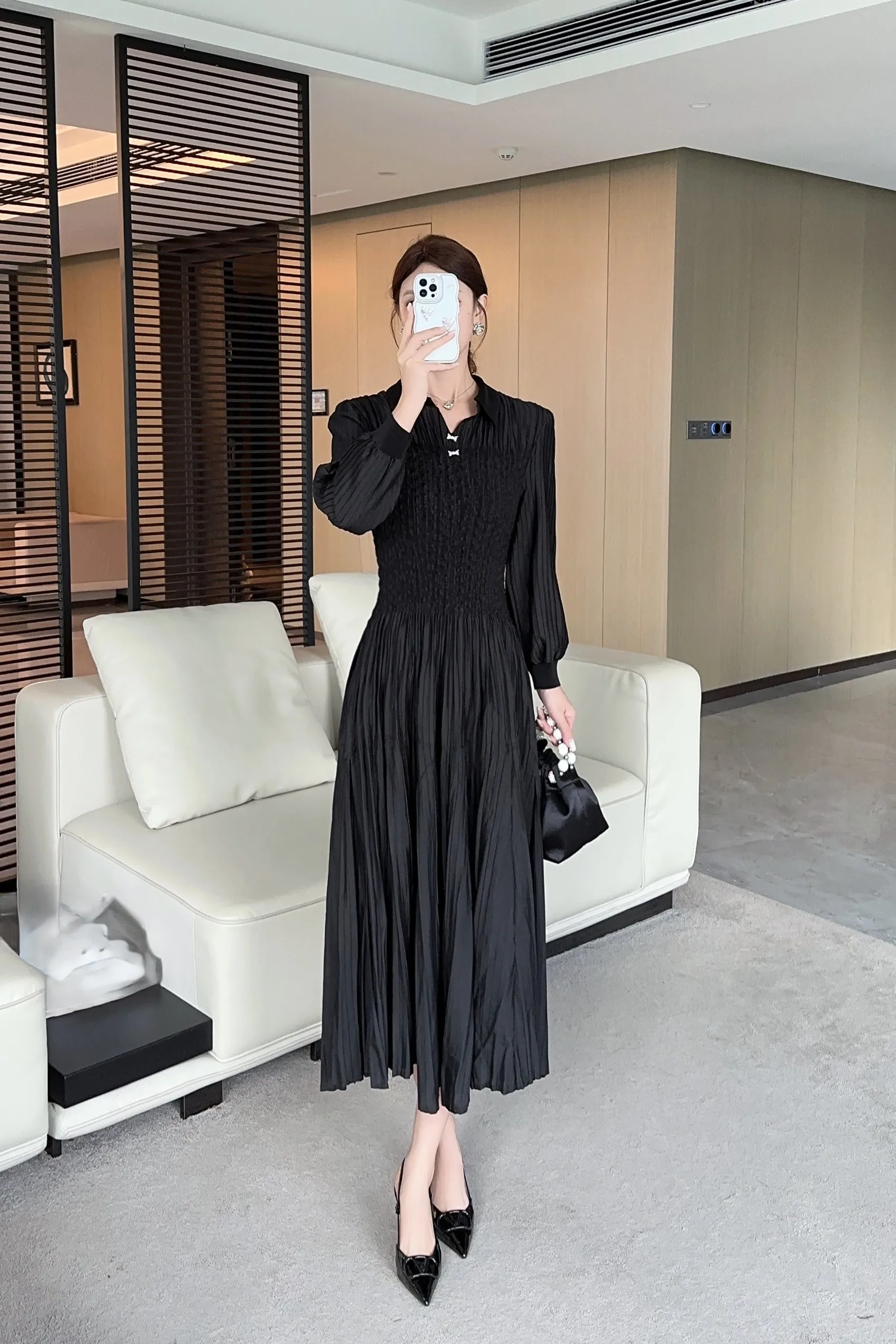 Miyake Pleated Dress with a Tailored Collar and Frilly Sleeves in Solid Color Long and Oversized for a Plus-size Fit