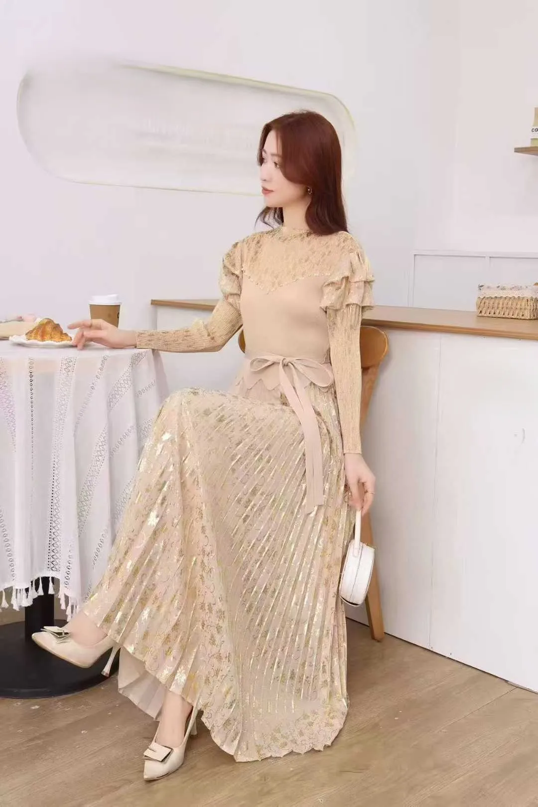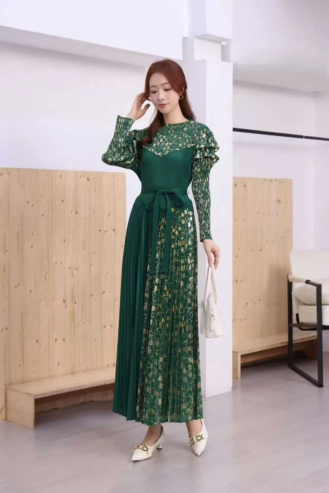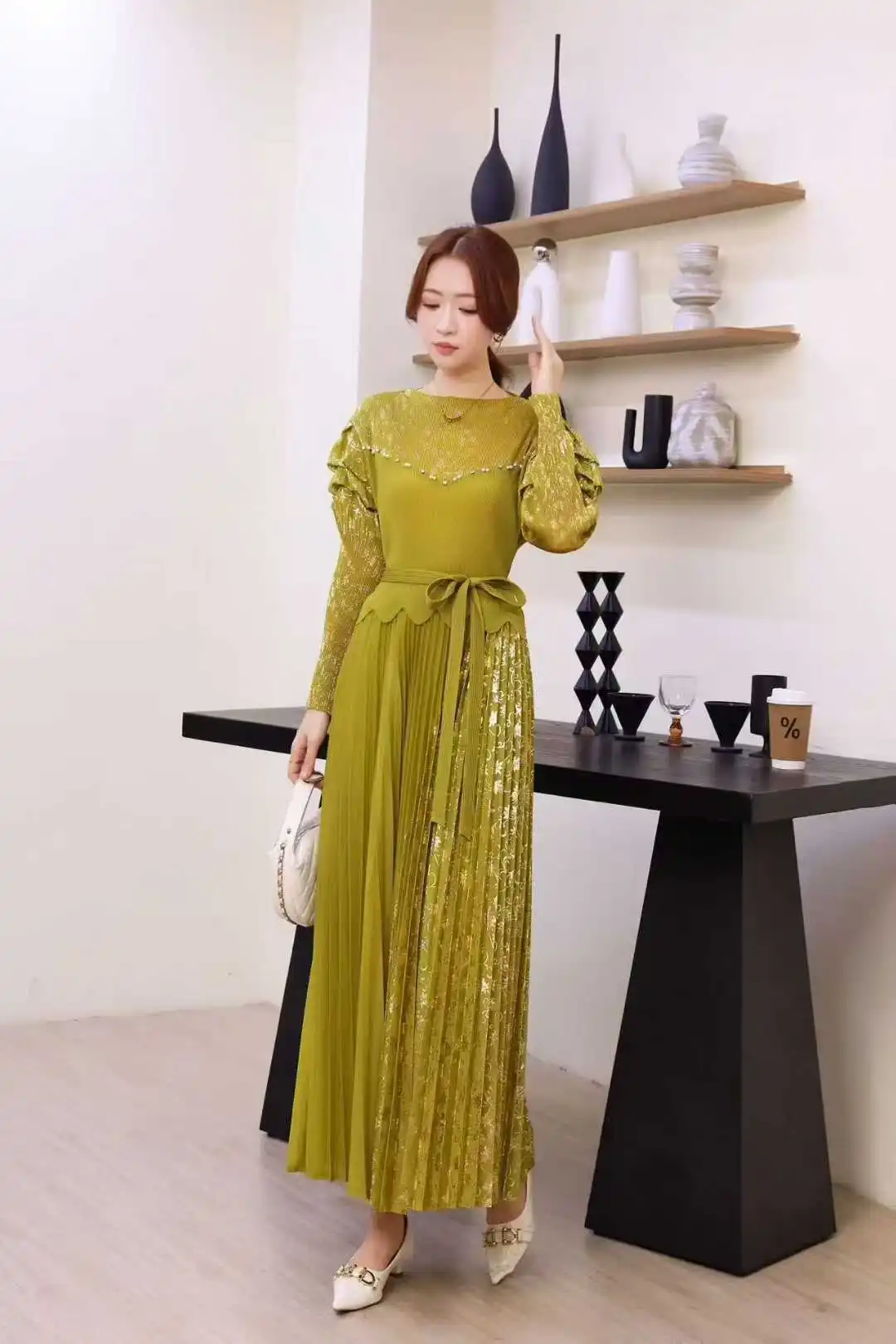 European and American Oversized Dress with Loose, Gold-stamped and Belted Miyake Pleated Skirt