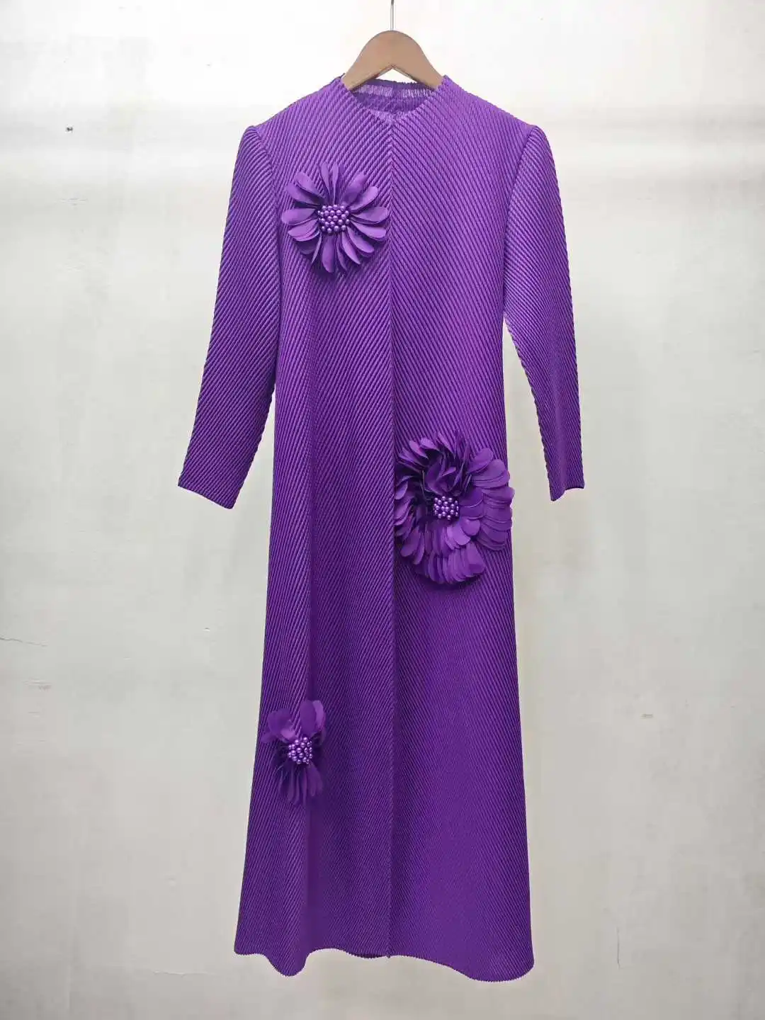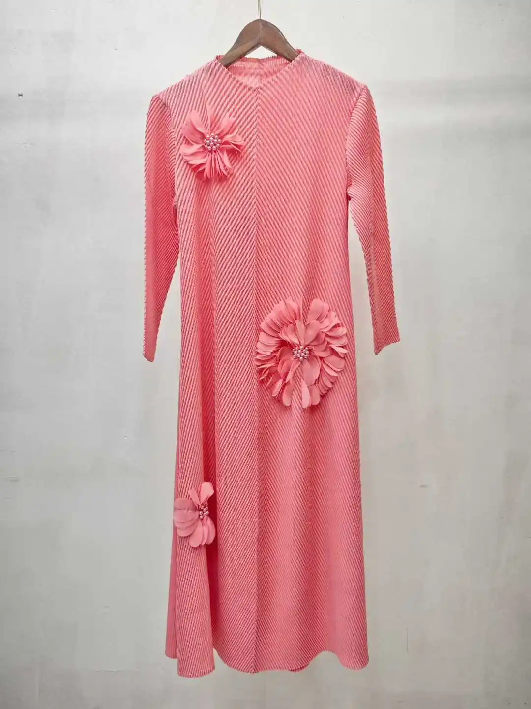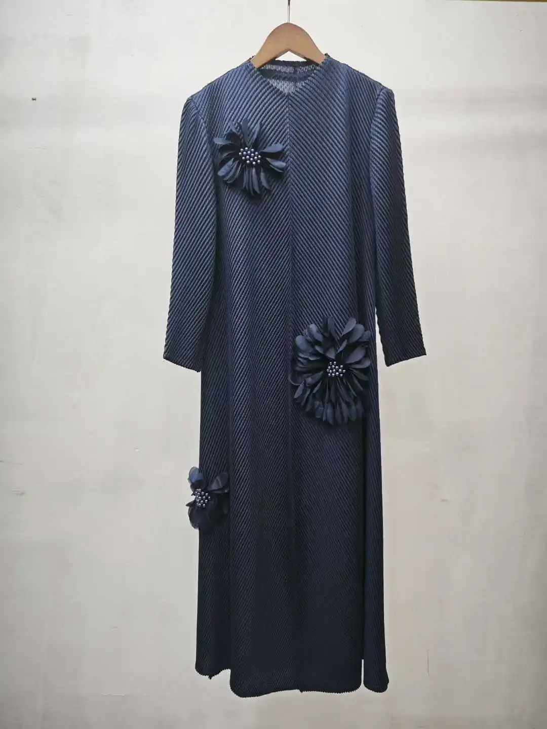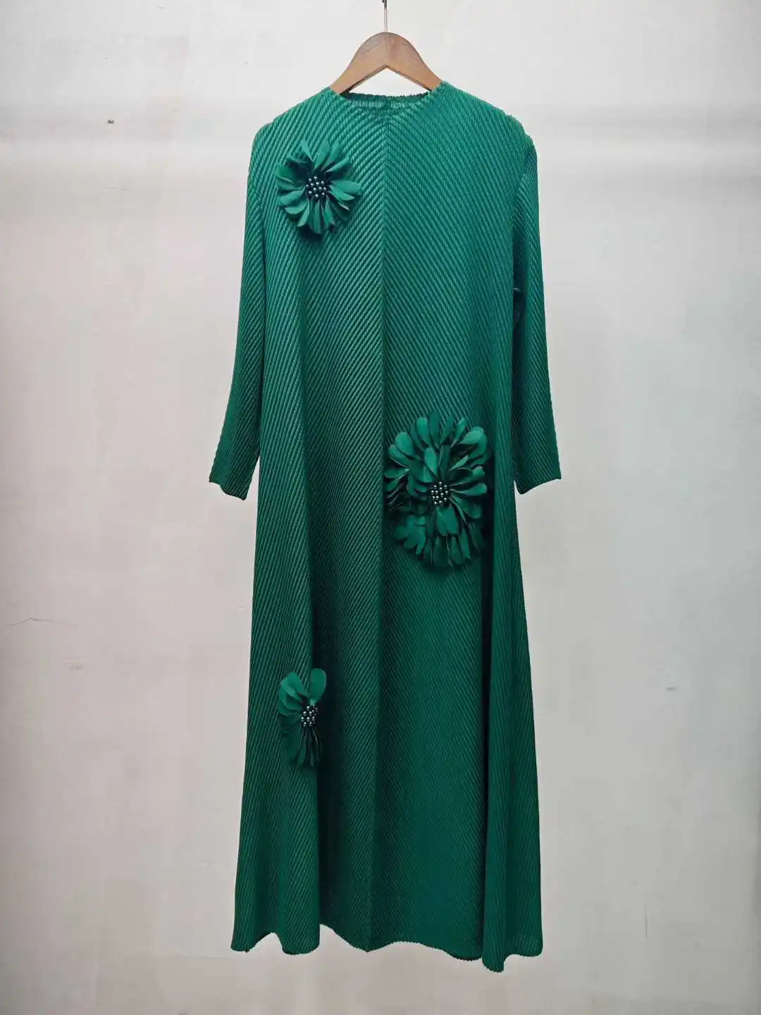 Muslim Long-sleeved Full-length Pleated Dress Manufacturer - in Stock - Solid Color Embroidered Miyake Pleated Dress