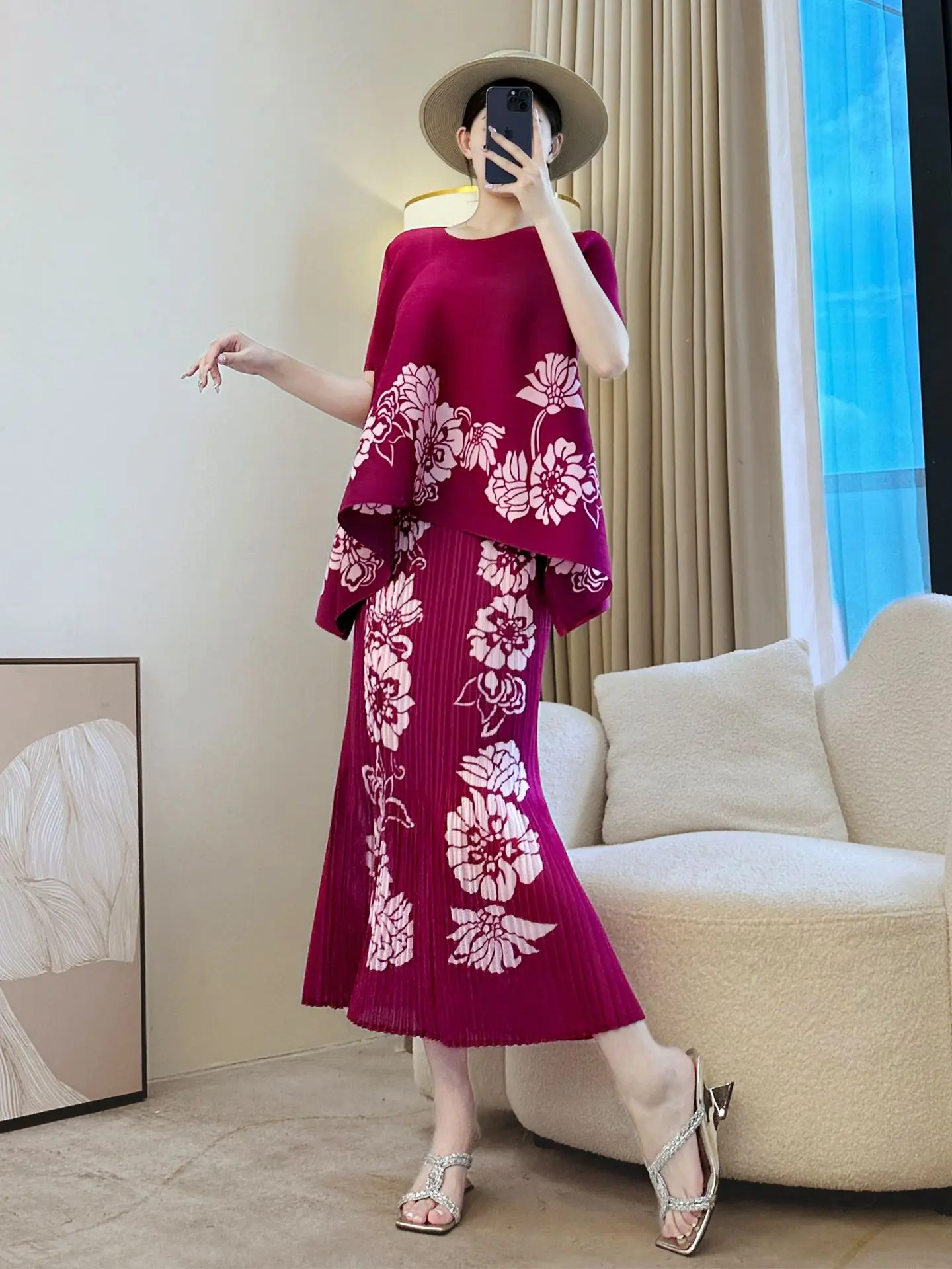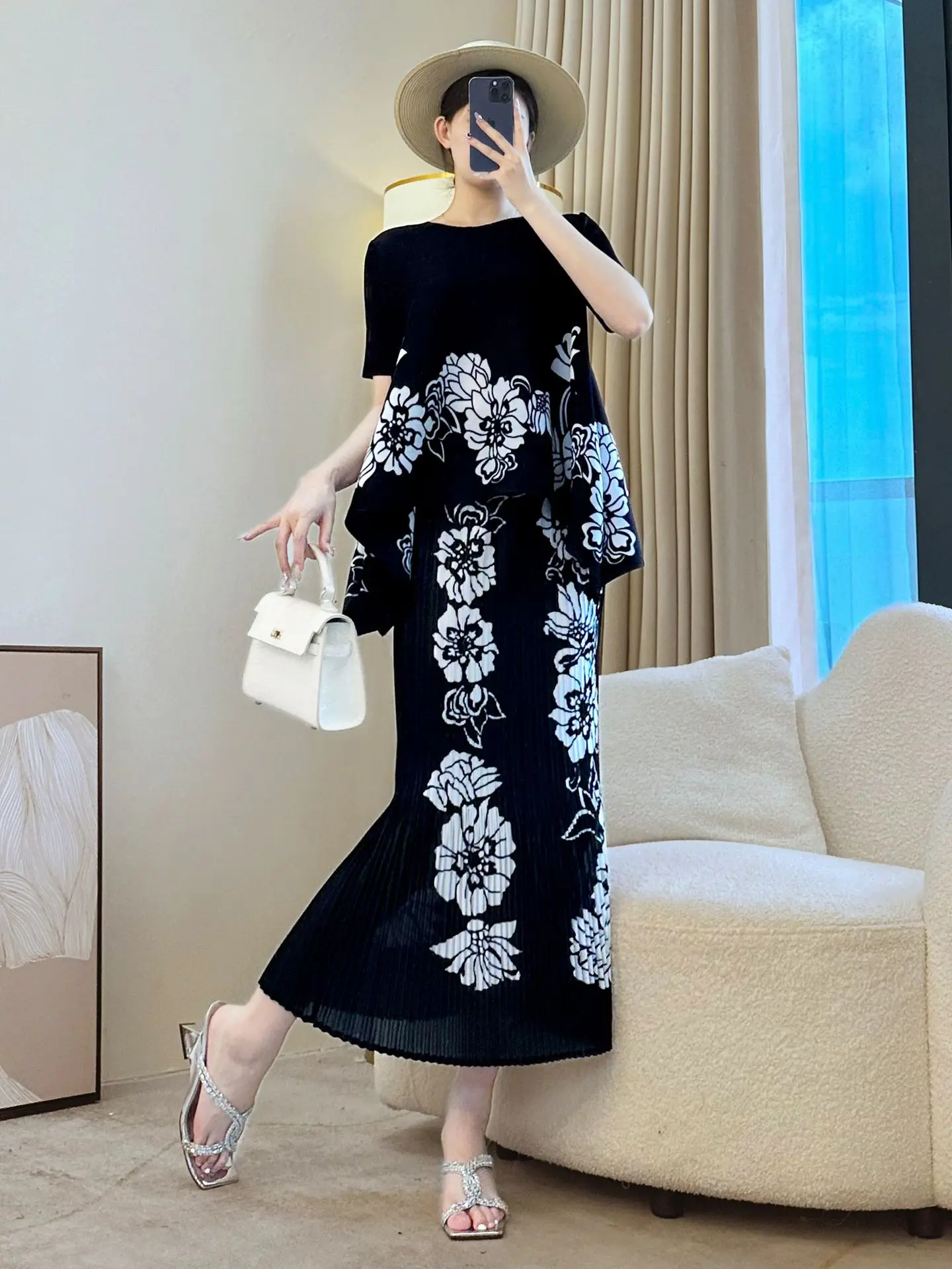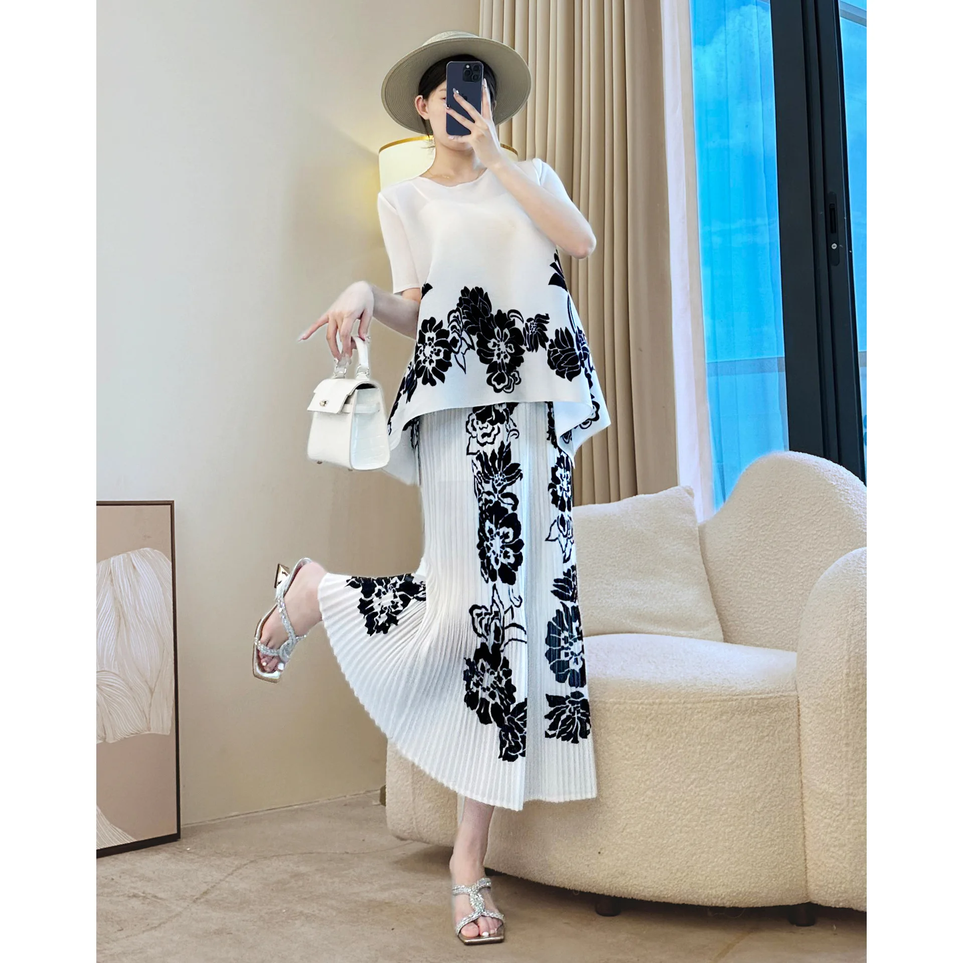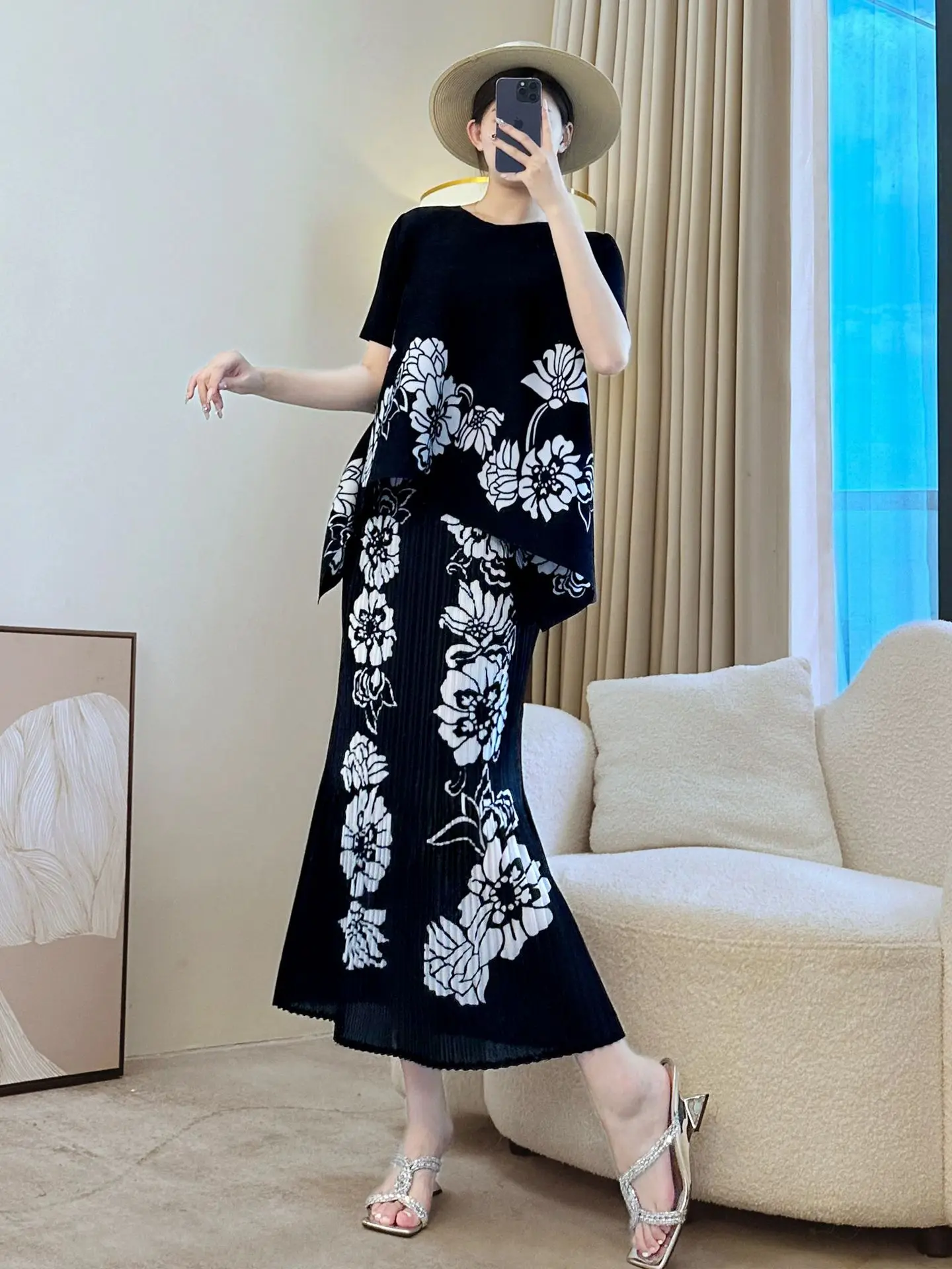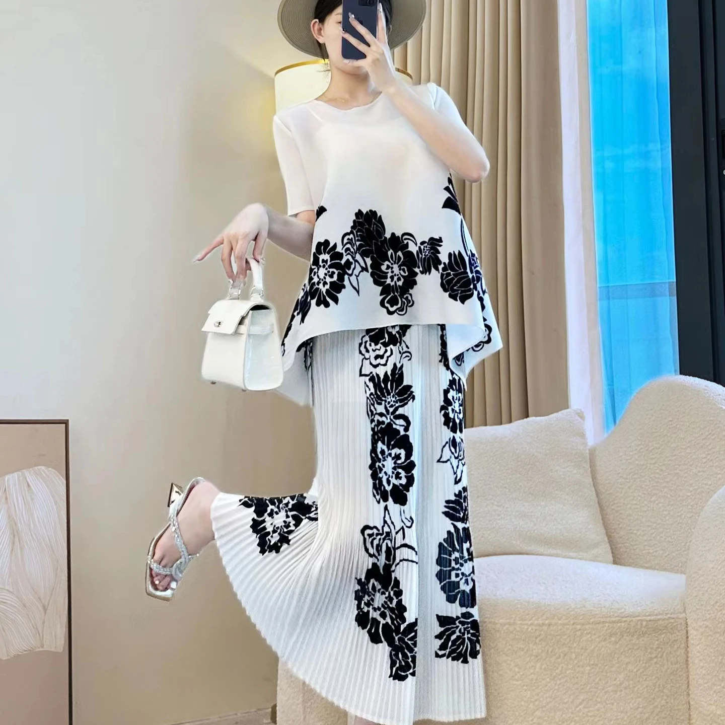 Round-neck Loose-fit Large-size Women's Set with Fashionable Prints and Miyake Pleated Set