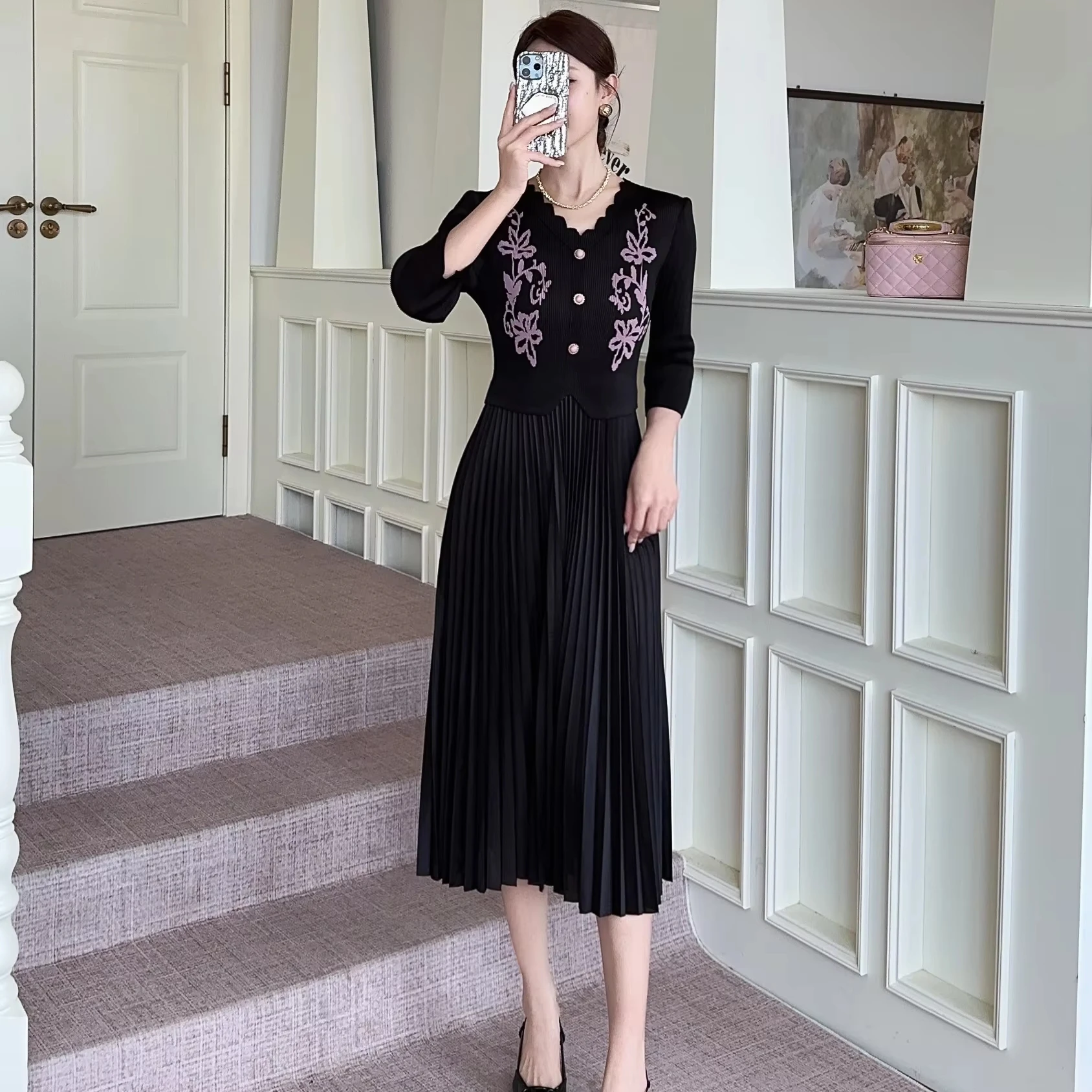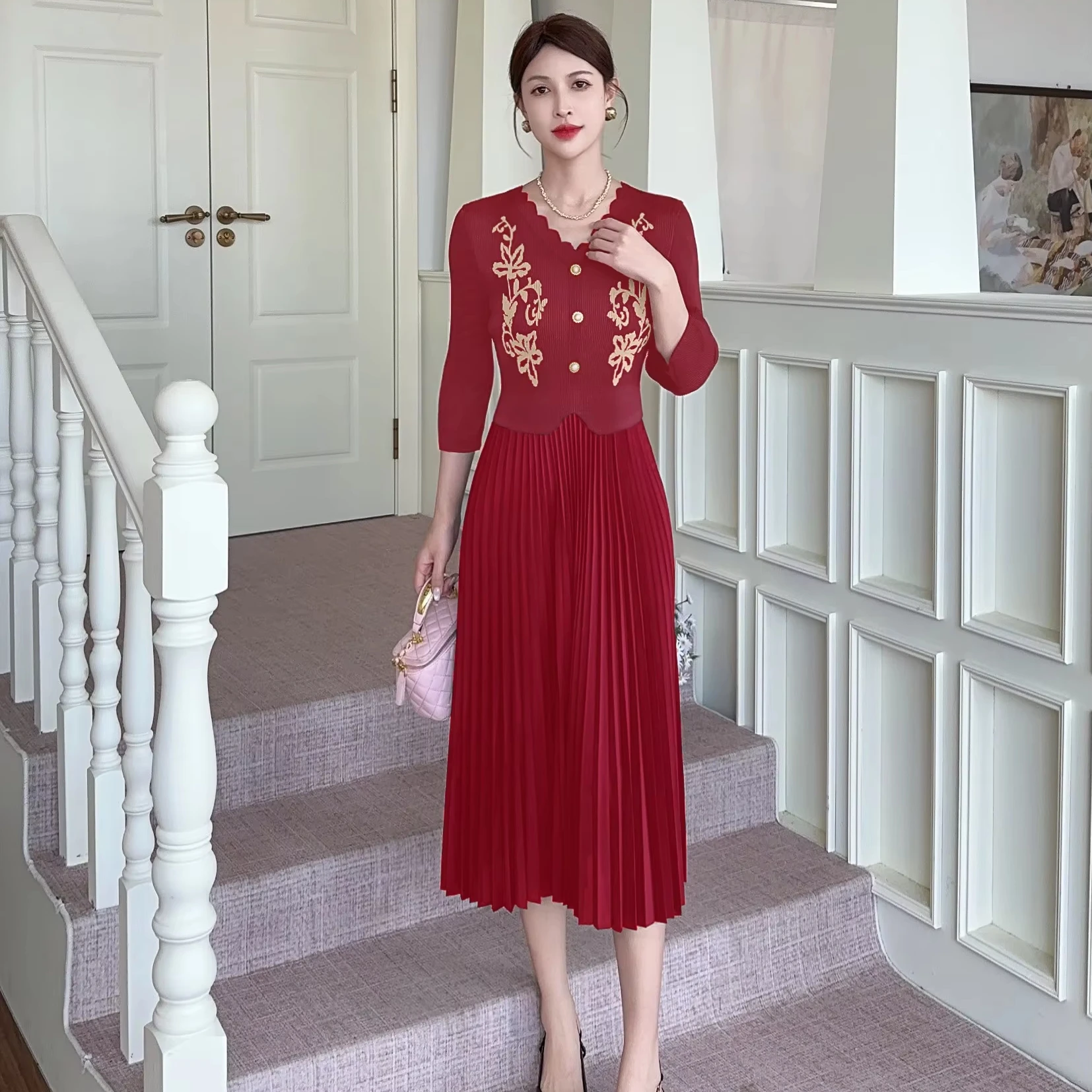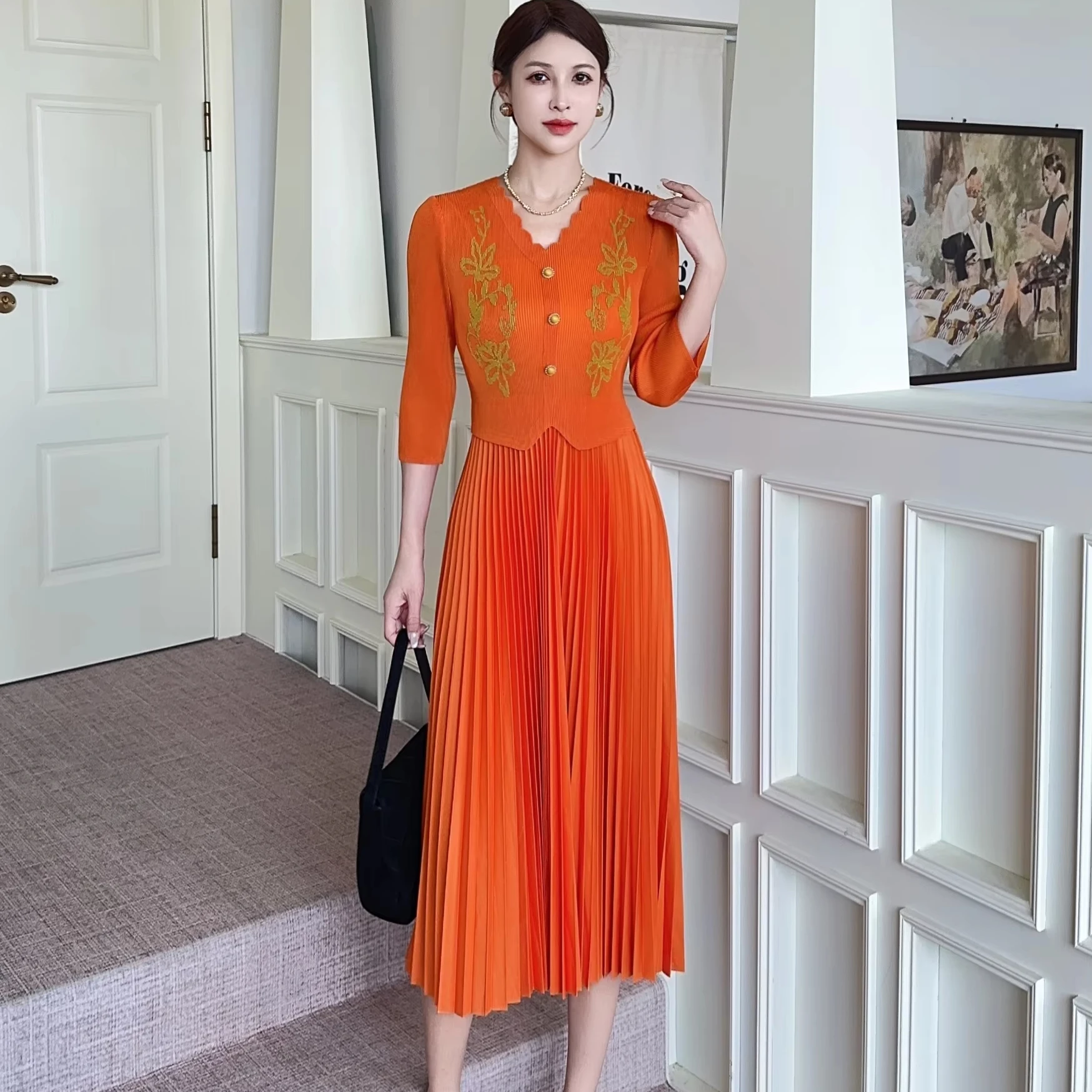 High-quality Style Miyake Pleated Dress with Oversized Button Design for Extra-large Size