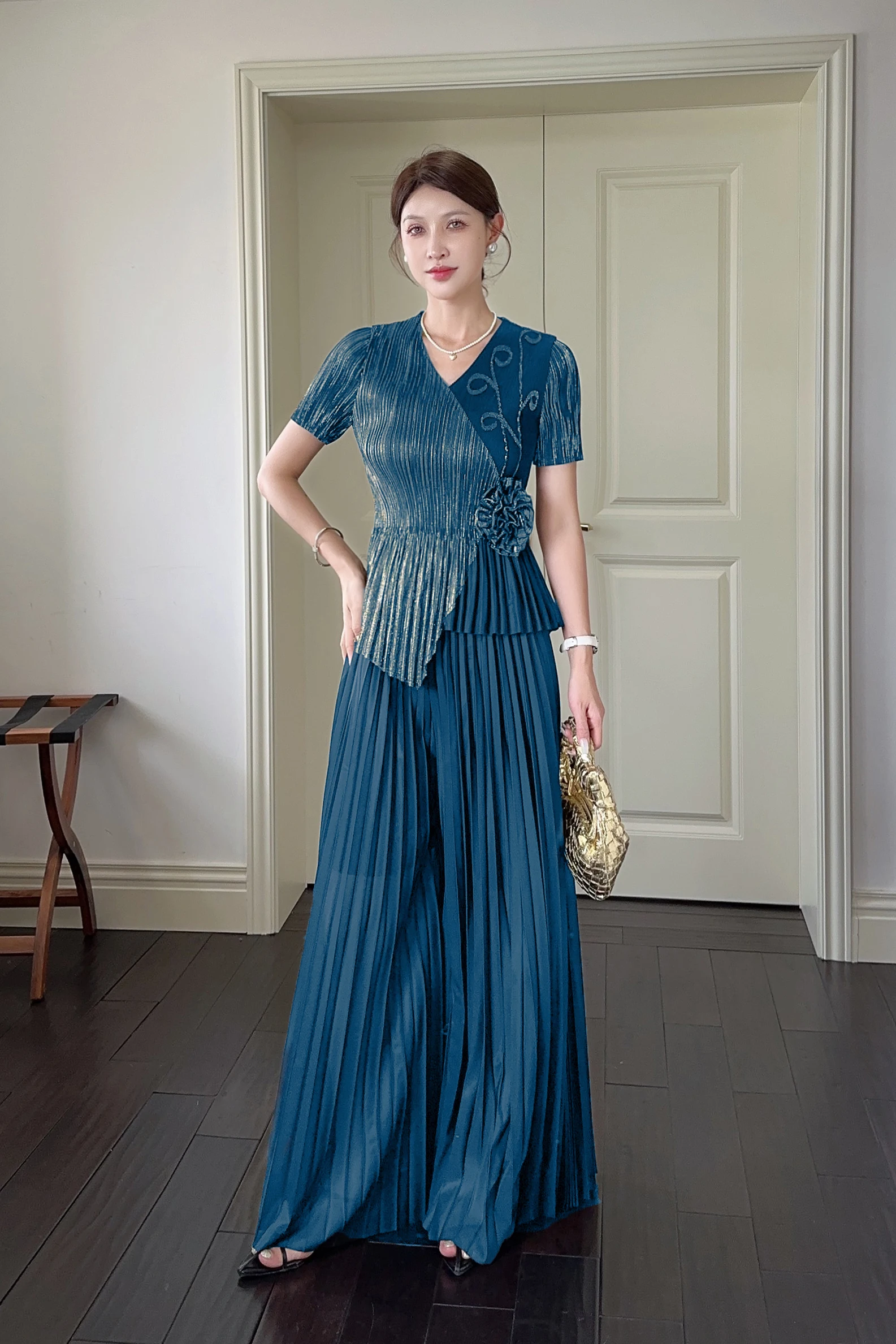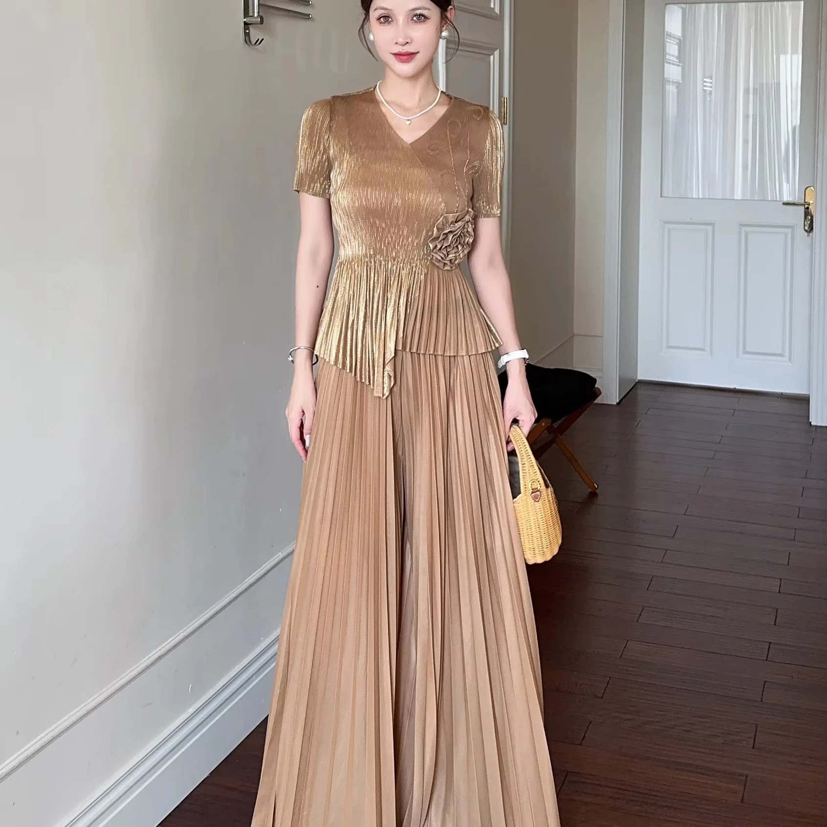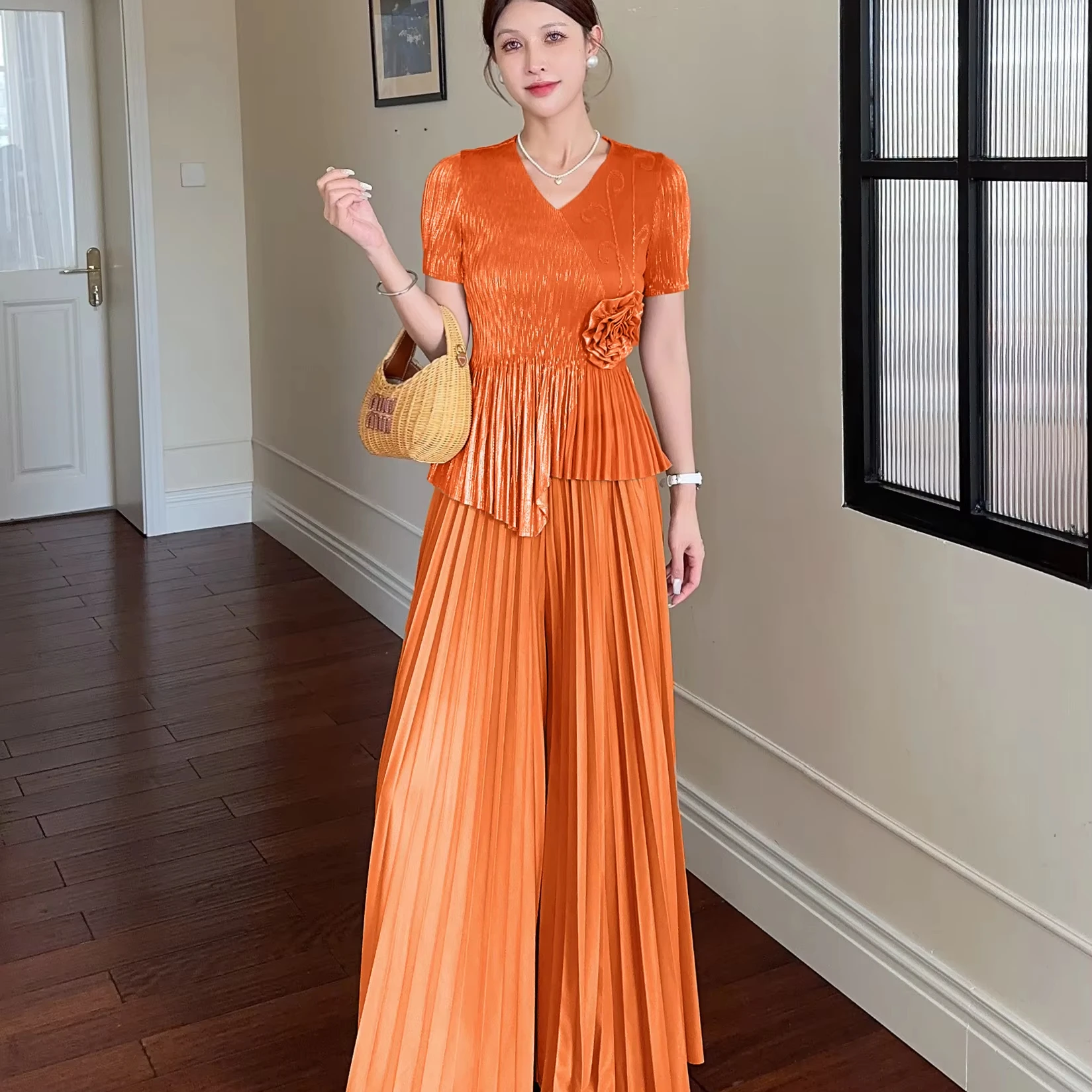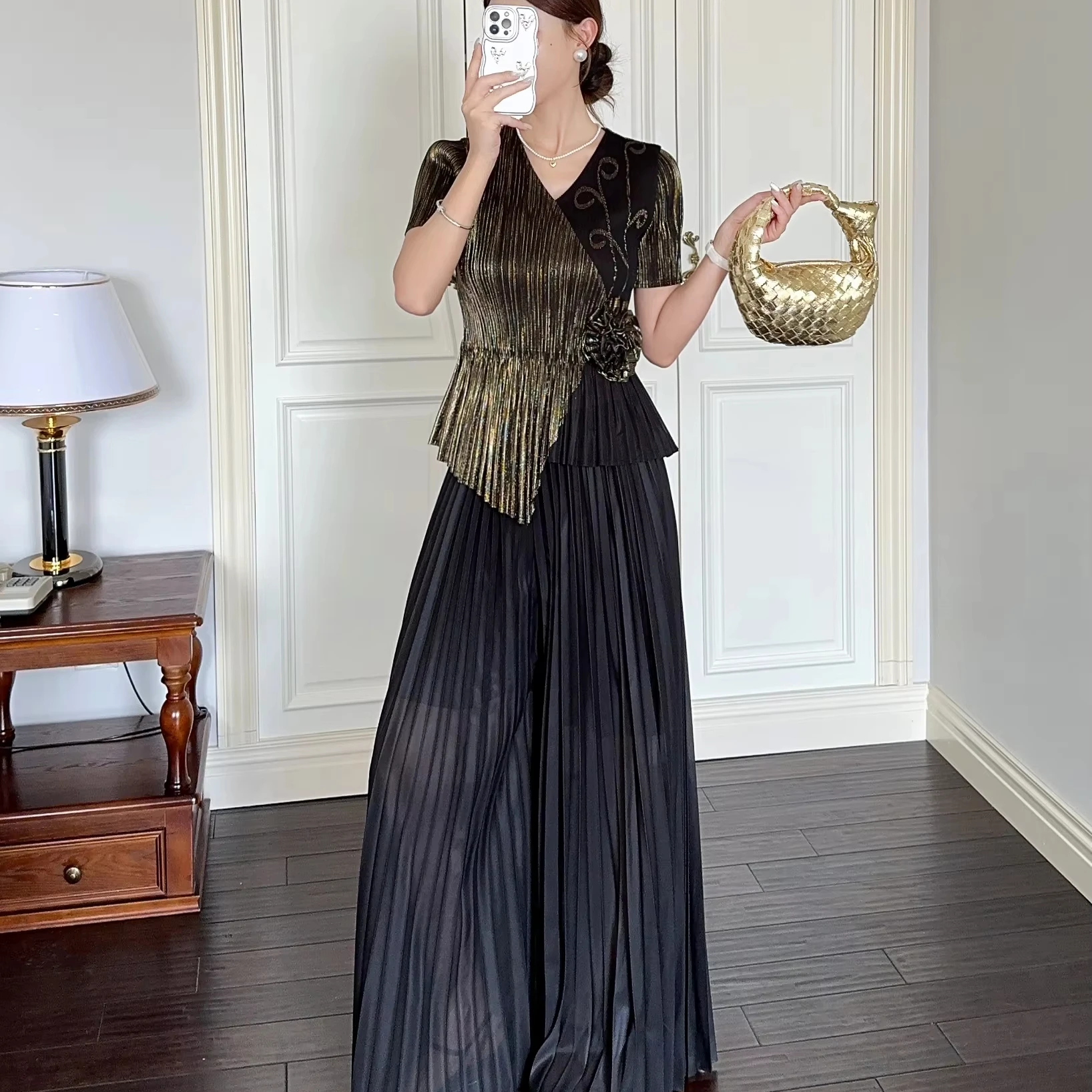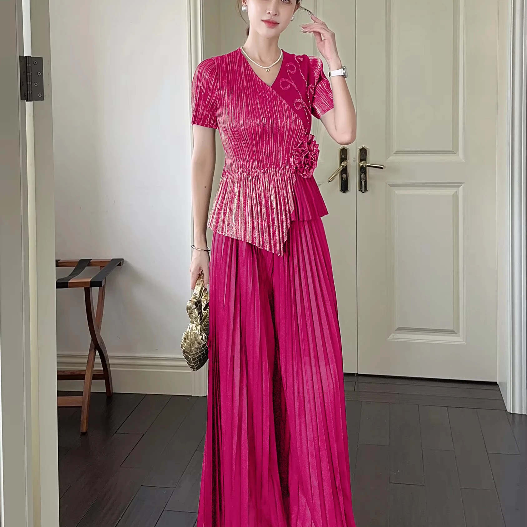 A Solid-color V-neck Elegant Two-piece Plus-size Top and Pants Miyake Pleated Suit