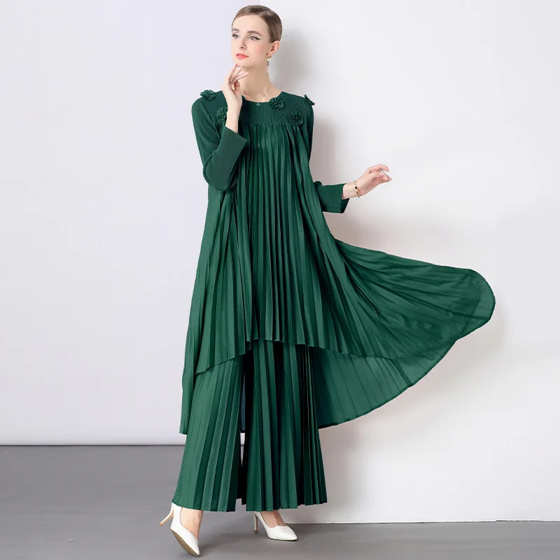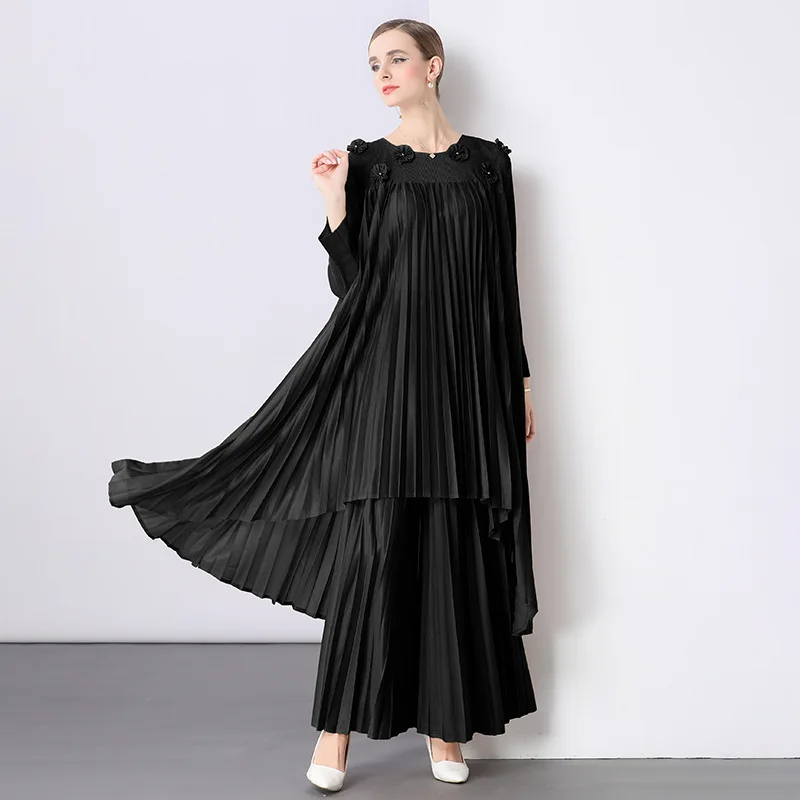 Solid-Colored Women's Summer Casual Style Top Loose Pleated Pants Suit with Long Length European American Style Miyake Sets